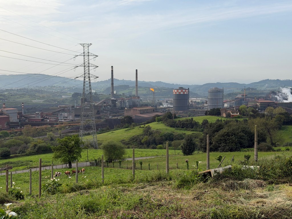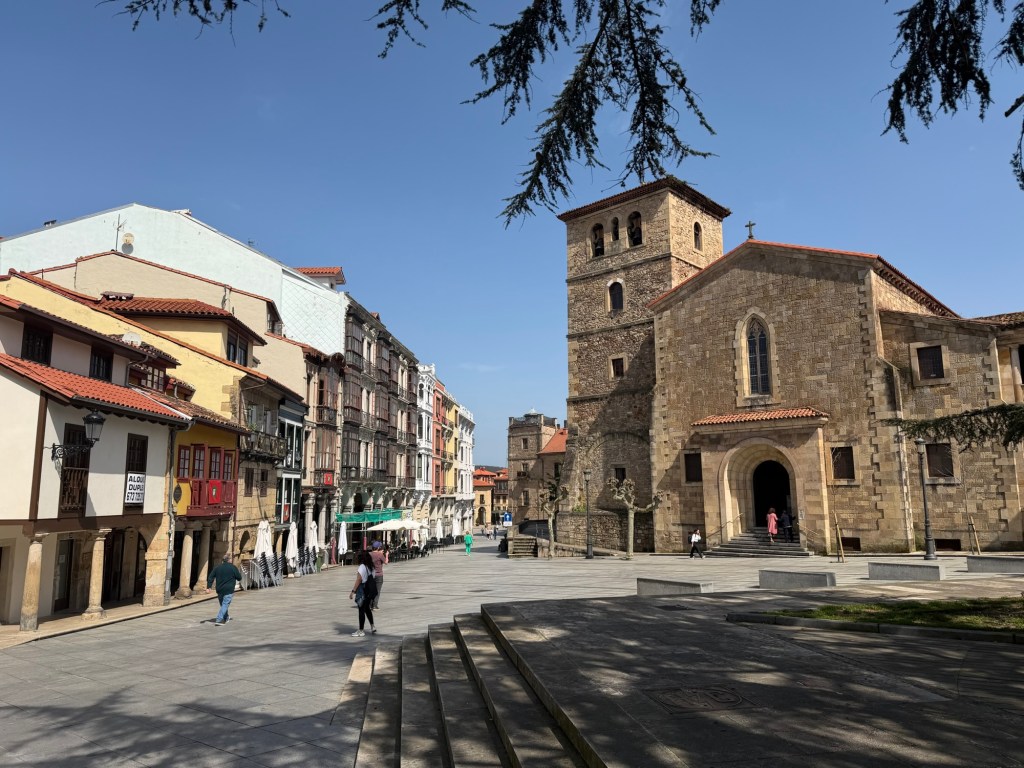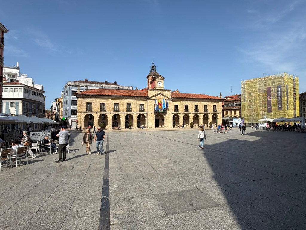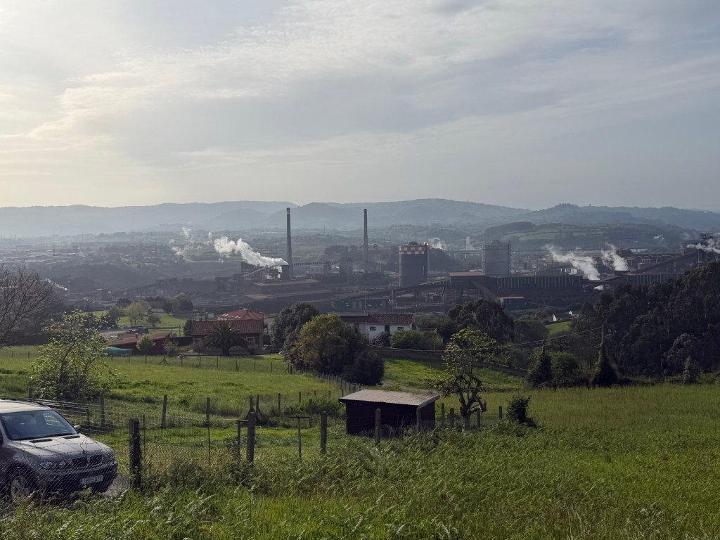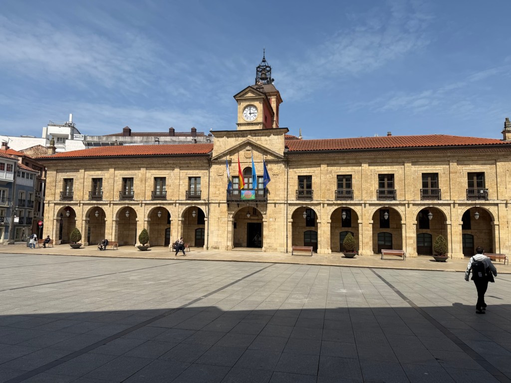 After a fabulous evening last night it was time to get serious today. Up at 7:00am to get as many things in to the roll aboard as I can so that my backpack is as light as possible. Got it to a reasonable 15-16 lbs I would estimate. The guidebook I had said that walking out of Gijon was the worst part of the Camino del Norte and recommended taking a bus, which I had planned to do. Luckily I researched it because the bus only comes once per hour, #24. I got to the stop 10 minutes early and it was right on time. The recommendation was to go to the Pauo Alto stop and that worked well and saved about an hour and half of pavement walking through grim looking industrial areas and along freeways. Right away there was a good climb up through a eucalyptus forest. Weather got warm, and after descent of the hill, it was a long stretch of pavement and a couple of hours of walking along the side of the highway. Eventually there was a bus stop in Trasona with a bus due momentarily, so I was able to cut another hour of pavement and highway off the itinerary. On arrival in Aviles, they were not kidding when the hotel was called a Palacio. Definitely a palace of a place, with a view onto fabulous gardens out back and big plaza out front. survive the first day back on the trail will definitely be sore. This is what they call “type 2”fun.