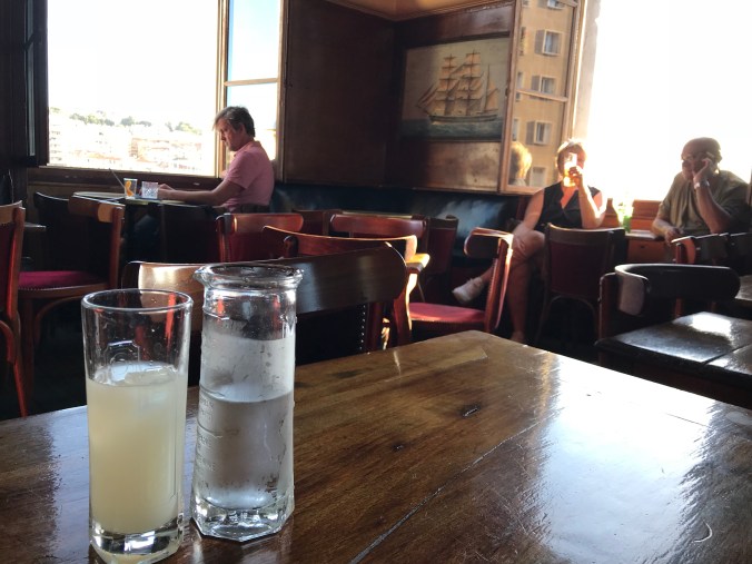Sunday in France, pretty much the bain of every travelers’s existence. (BTW, if you are traveling into or out of France, avoid doing it on a Sunday. I once forgot this rule and was lucky to make my flight, even though I was over 2 hours early to CDG, as they had only one person stamping passports for people to leave the country. Many others on that flight didn’t make it and after a half hour of waiting for them, the captain gave up and left, now I don’t travel on Sunday). I started out at the fish market on the pier, which amounted to maybe 3 different tables selling a few fish, then decided to try and find some good coffee. All the better sounding shops and roasters are closed on Sunday (what a winning concept for a coffee shop). So after a walk and finding a nice plaza to sit, had coffee. Then the goal was to go to the African spice market, that is also closed on Sunday. So, quick pivot and hop the metro to the SNCF station for a train to Cassis (20min). Yet another not very good idea. Turns out everyone and their dog and their grandmother goes to Cassis on Sunday. There was also some kind of bike race going on creating enormous traffic jams. By a whisker, I made it into the Tourist information office before they closed for lunch. After securing the town map and the bus schedule to get up the hill back to the train station, it was a walk around the harbor where I found a great daily special on a seafood mixed grill. After that it was time to hike to the nearest calanque. For those not up on it, a calanque is a rocky beach or inlet, and Cassis borders one end of the Calanque National Park with Marseille at the other end. I followed the advice in the Rick Steves book and of the visitor center and walked what was supposed to be about 40 minutes to Port-Miou. While on the map this appeared to be a hike through nature, on the ground, it was mostly a hike along the side of the road through neighborhoods of Cassis. Eventually it turned into gravel with little shade. After about an hour of walking, remember it’s 90 deg. And no shade to speak of, I saw some nice rocky cliffs and a boat harbor, but no promised beach in evidence. I didn’t have a suit with me since I had planned to do this tomorrow anyway. Turn around, back through the gravel and burbs to Cassis. The best beach seemed to be the first one you came to before you left town. All in all, mostly a waste of an afternoon, probably should have done the tour boat or the Petit Train tour. I’m sure Cassis is quite nice when it is not 90 degrees and completely overwhelmed with tourists, but I’m grateful that I decided to stay in the center of Marseille. This has been an interesting trip because most of the places people told me that I would love, (Eze, Cassis) I’ve found to be just OK, and the places people told me I wouldn’t like at all, I’ve actually liked quite a lot (Avignon, Nice, Marseille). The biggest surprise being that Nice was very enjoyable. Marseille so far has not been nearly as dirty or rough as it is reputed to be, but please don’t tell anyone, it would be best if it stays off the radar. I’m sitting in an upstairs bar called the Caravelle as I write this, place has tons of character and looks out on the port. Pastis!