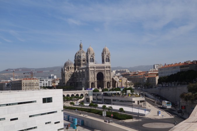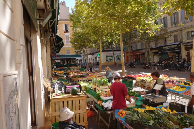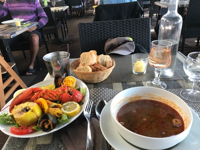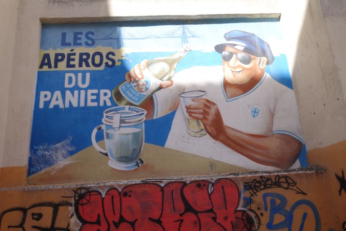 Yesterday I made a few calls to try and arrange a food tour, none of which panned out. But, one person texted me back and suggested a free walking tour with a friend of hers. Cool concept, meet at 10am, every Mon, Wed. Fri. Under the mirrored canopy near the metro stop, about 2 block from my apt. And pay what you want at the end of the tour. Good crowd showed up, the guide, Ezekiel, was an anthropologist who spoke good English and knew what he was doing. He moved it along well and covered a lot of ground. Today was a marked difference weather wise, as the Mistral was blowing. Very, very windy, and much cooler. I wore a jacket for the first time since Chamonix. The tour showed how a lot of downtown Marseille had been destroyed in WWII and the Germans had destroyed a whole neighborhood because the Corsican Mafia had defied them. They did preserve select buildings, oddly enough. Turns out that Marseille was designated the European Capitol city for a year in 2013, this mean that the EU poured money in to showcase it. Apparently a turning point. All the things you’ve heard about Marseille being rough, dirty and dangerous, at least in the Vieux port area, just aren’t true anymore. Sure, it’s France’s second largest city with a population of 850,000 in the city and 1.6million in the metropolitan area. It’s largely not on the tourist map, so don’t tell anyone that it’s a really cool place to visit, and do watch Anthony Bourdain’s episode on it. Paris is much more dangerous, dirty and smelly. But I digress, after the walking tour, I tackled a Bouillabaisse. Lots of little bony stuff, but tasty. I’m reminded of my father who used to order these Fruits de Mer platters full of shells and crabs, spend an hour picking out little bits of meat, and then pronounce himself still hungry at the end of the exercise. I felt a little the same after the bouillabaisse. Sotto Mare has nothing to worry about. After lunch, I tried to find the African Market area. Found a few things, but it really wasn’t up to the hype about it being like going to Africa. Just a few Africans stores, some produce etc. nothing to write home about. Took one of the Trams for a ride, had a coffee and rode back. Now back at the Caravelle bar trying a different Pastis.