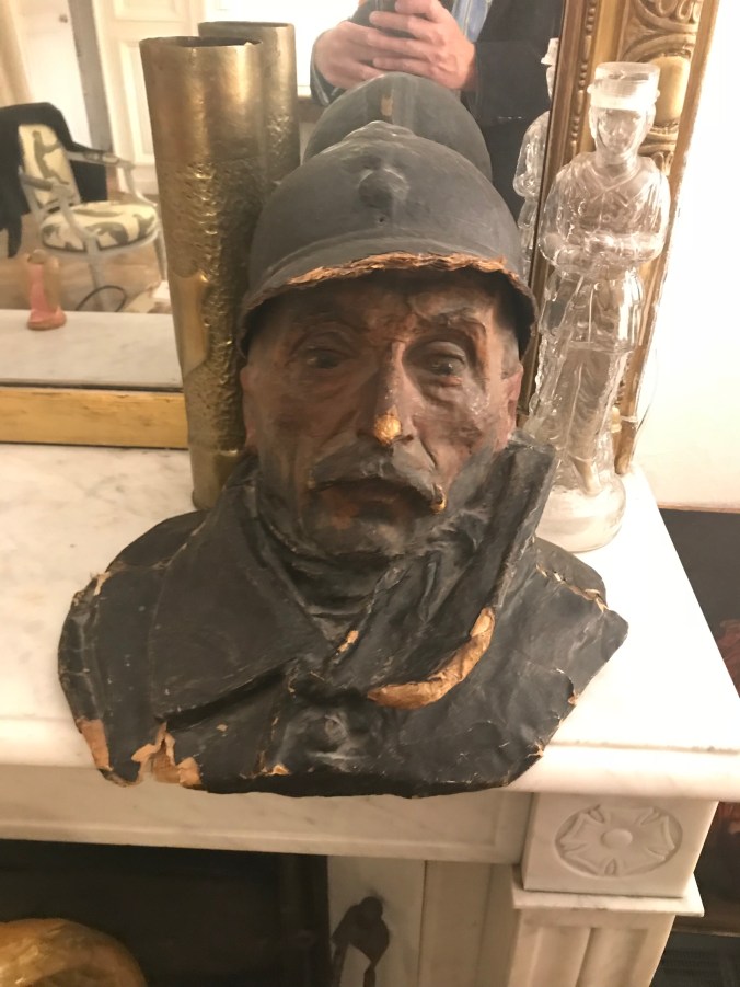 Had dinner last night with CC and friends. This was owned by the hostess who’s grandfather had used it in the trenches in WWI. Apparently it was decoy, put up above the trench to see if any shots would be fired at it, before moving to another trench. Next to it is a brass shell casing that has been carved very intricately.