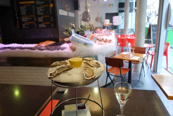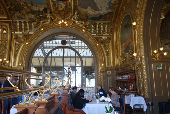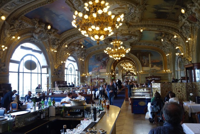 There was a definite chill in the air and it felt like fall this morning. I headed to Loustic, reputed to be a good coffee place in the 4th. They did in fact have excellent technique and did everything right, but it still didn’t taste all that great. After a nice stroll through the 3rd and then down to St. Paul, I stopped at Comptoir des Mers for an oyster apero, 6 oysters and a small glass of white for 12 euros. Then I decided to try one of the famous places on my list, Le Train Bleu at Gare de Lyon. The place has a spectacular interior and the lamb I had for lunch was excellent although a touch over cooked. Met some lovely people from Hood river area in Oregon who had just spent a month in Burgundy.
