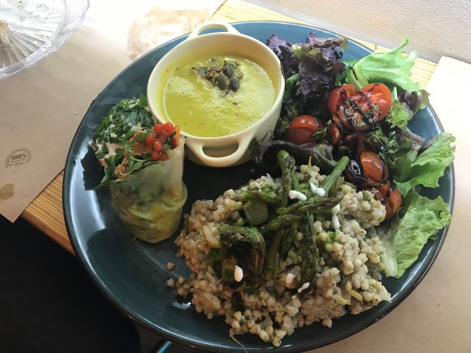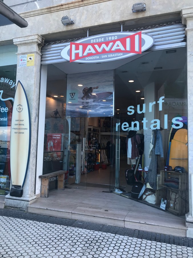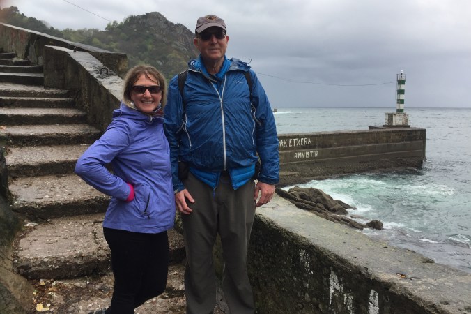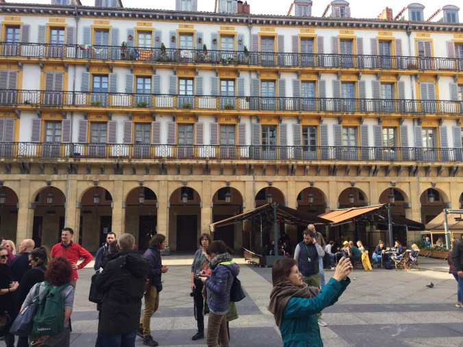I definitely can see why this is viewed as a foodie heaven. Wall to wall Tapas joints with super friendly and helpful service. Prices are below reasonable. The standard order is to pick a place that looks good, pick a thing or two off the counter, order a glass of wine. Then, examine the hot tapas menu. These are items custom made when you order them. After this feast, you pay up and head down the street for the next round. Last night was a sea urchin mixed with some cod, served in its own shell, then a little cappuccino cup full of foie gras, then off to the next place for a lamb brochette and a steak kabob. There seems to be no end to combinations. So, that was last night. Today, got up to grey skies and went and found an amazing coffee roaster. They were even willing to make me a custom breakfast including mashed avocado and a lot smoked salmon. Then, we took the bus to the nearby town of Pasaia with the intention of hiking back to San Sebastián via the Camino trail. Unfortunately it was more challenging that we wanted as it was pouring rain the whole time. A few hours later we returned to the apartment and hot showers and dry clothes. Lori M. Found a vegetarian place where she would eat something and we decamped to Mapa Verde for an excellent veggie lunch. Of course now that the hiking is done the sun has come out and it is a very pleasant afternoon. I’m siting on Constitucion Plaza as I type this, a town square that used to host bullfights and still has numbers on all of the surround balconies as the town used to sell tickets for spectators.