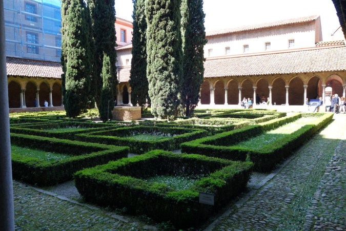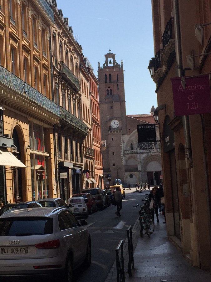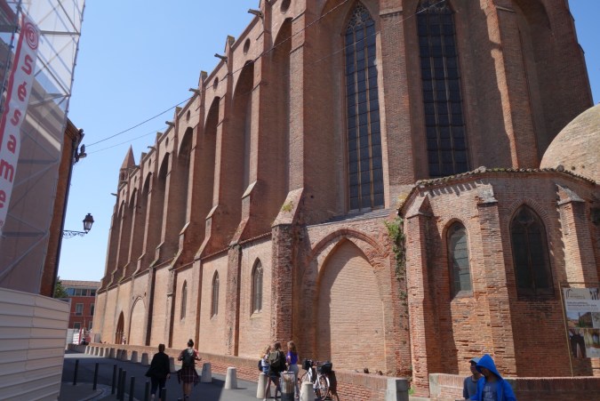 Today I did some of the classic tourists things. There was a bit of disruption lurking in the background as the Gilet Jaunes protest on Saturdays. Transit was disrupted and a large but pleasant contingent of CRS riot police installed themselves right by my front door. That said I really didn’t see any signs of protest until I was looking for somewhere to have dinner and the restaurant I headed for was just on the edge of the action, I headed out and not a moment too soon as shortly thereafter, the teargas was fired and people started running. In the meantime, the rest of Toulouse was busy eating and drinking like normal. I headed for the Cathedral of St. Serin, and although the interior is not too impressive, the exterior is. I should digress here and explain that Toulouse is called the “rose” city because everything in Toulouse is made of brick rather than the white or grey stone that characterizes the rest of France. When people say that Toulouse is different, it really is! It is stunningly beautiful and the scale of the buildings made of brick are hard to believe. It is said that Carlos Gardel, the great Tango singer, is from Toulouse, so I went to find his statue, but due to the protests, the public garden was closed. Then the Metro wasn’t working quite right, although that may have not been connected. Anyway took the bus over to the Carmes market area and worked my way back. Great lunch at a restaurant, Cafe Chouchou, where the owner took me under his wing, told me what market to go to tomorrow, tasted wine and generally took great care of me. From there, headed to the Couvent Augustine, where Thomas Aquinas remains are on display, or at least a box alleged to contain them. Back for a break and then a stroll to find a suitable place for dinner. After being almost in the action, a nice creative salad at Florida on Pl. du Capitole in front of the apartment did the job.