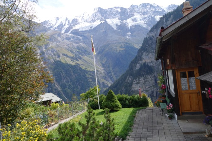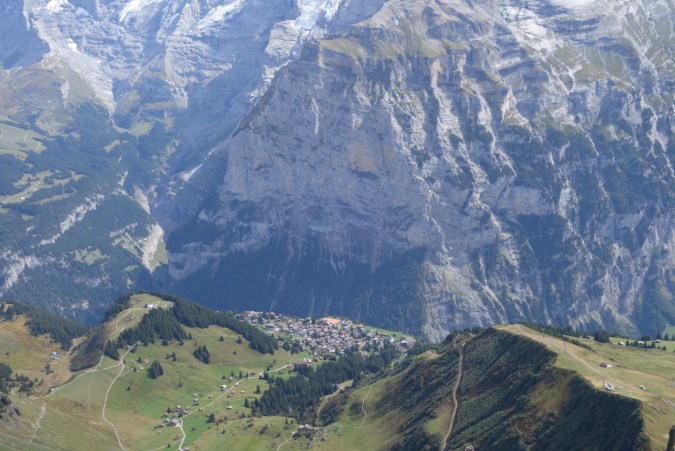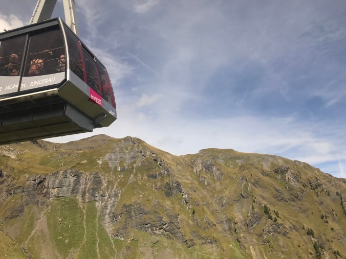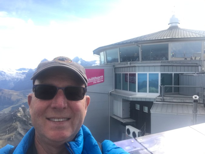 Today’s adventure was to travel to the other side of the valley to Murren. To do this, take the train down to Lauterbrunnen, then a cable car up and switch to a single car railway. From Murren, I took the cable car up to the Shilthorn/Piz Gloria. A spectacular view and famed for being in James Bond movie, something they milk shamelessly at every turn. Lunch buffet at the 360 degree rotating restaurant was agreeable. Then it was down to the halfway point where they have secured a walkway to the side of the mountain, of course it has holes in it etc. to give you a feeling of being out in space. Then back down to Murren and another cable car to Gimmenwald. Gimmenwald is a favorite of Rick Steves, and is quite beautiful, but not much there. After an hour or so of exploring, another cable car down to Stecklberg followed by a post bus back to Lauterbrunnen and then the cog railway back to Wengen. All this sound onerous, but the Swiss have the timing so well worked out that you are seldom waiting for more than a few minutes till the next transport arrives. I was able to book the next leg of my trip last night. By staying here in Wengen an extra day, I miss a French train strike, so now heading to Comar on Wednesday where I have an AirBnb in the center of the old town booked, and then to Paris on Friday. After all of the train and cable car trips today, returned to the Wengen cheese festival in progress. Not much excitement, as in Switzerland almost every dish on the menu has cheese involved. There was what looked like a polka band but played country western, although it was incomprehensible, probably something about pick up trucks etc. see video clip.