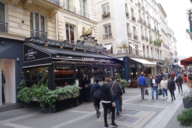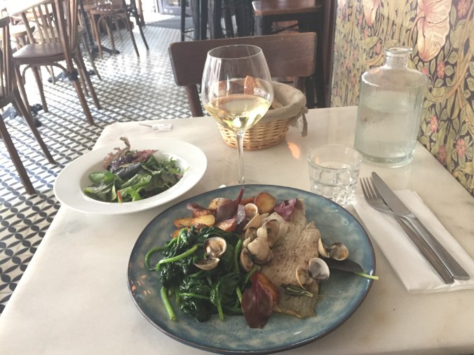 One of the things about having been to Paris quite frequently is that I can give myself a pass on waiting in line to go to museums. Now, I’m trying to explore areas where tourists are much less common. So with that in mind, I headed out to do a ramble around 20th Arrondissement. This area, known as Belleville, is famous for Pere LaChaise cemetery and where Edith Piaf started. I did some googling, and decided to head to the Village of Charonne, but first made a stop at Peleton coffee, one of the coffee shops favored by podcaster Oliver Gee. They did make a good coffee, then it was on the bus to the back part of the 20th. Charonne village was a few cobbled streets but not much, so on to the main thoroughfares of Menilmontant and Bagnolet. Lots of the usual business, many people bustling around. Some very atmospheric bars and restaurants. I chose a recommendation form Hip Paris called Le Comptoir hidden up a side street. Had a nice piece of skate wing, although overall things were unexceptional, cute place though. Did make a stop at Belleville Brulerie outpost, another of Paris’ high end coffee places. They also were doing a good job of making fine coffee. After a quick walk down Rue de Montorgueil, it was home for a regroup and then off to Le Baron Rouge to meet up with Join Us in France members. That ended up being a lot of fun. Then off to the 9th for dinner at Le Mieux with friends John and Atsu and guest.