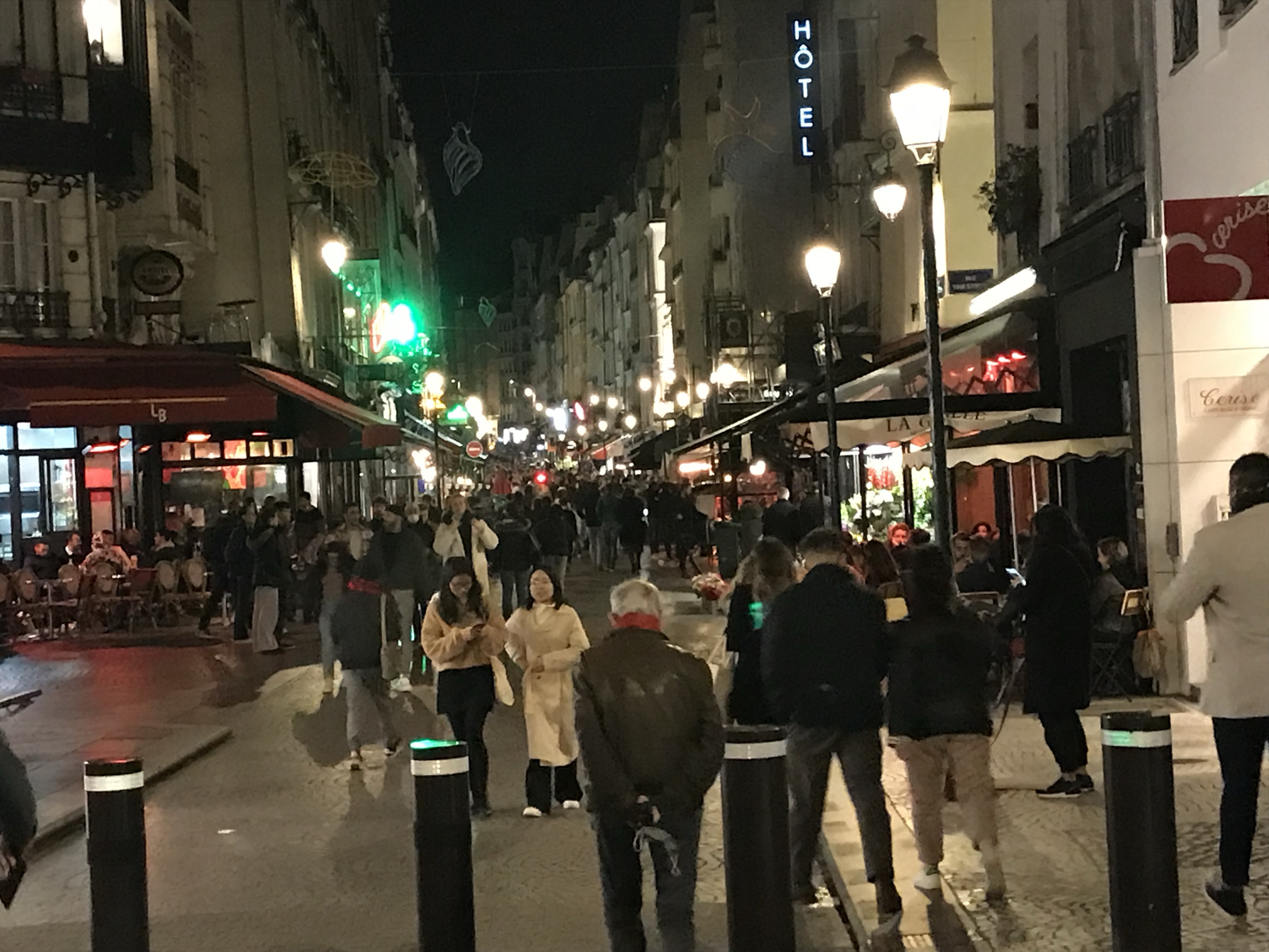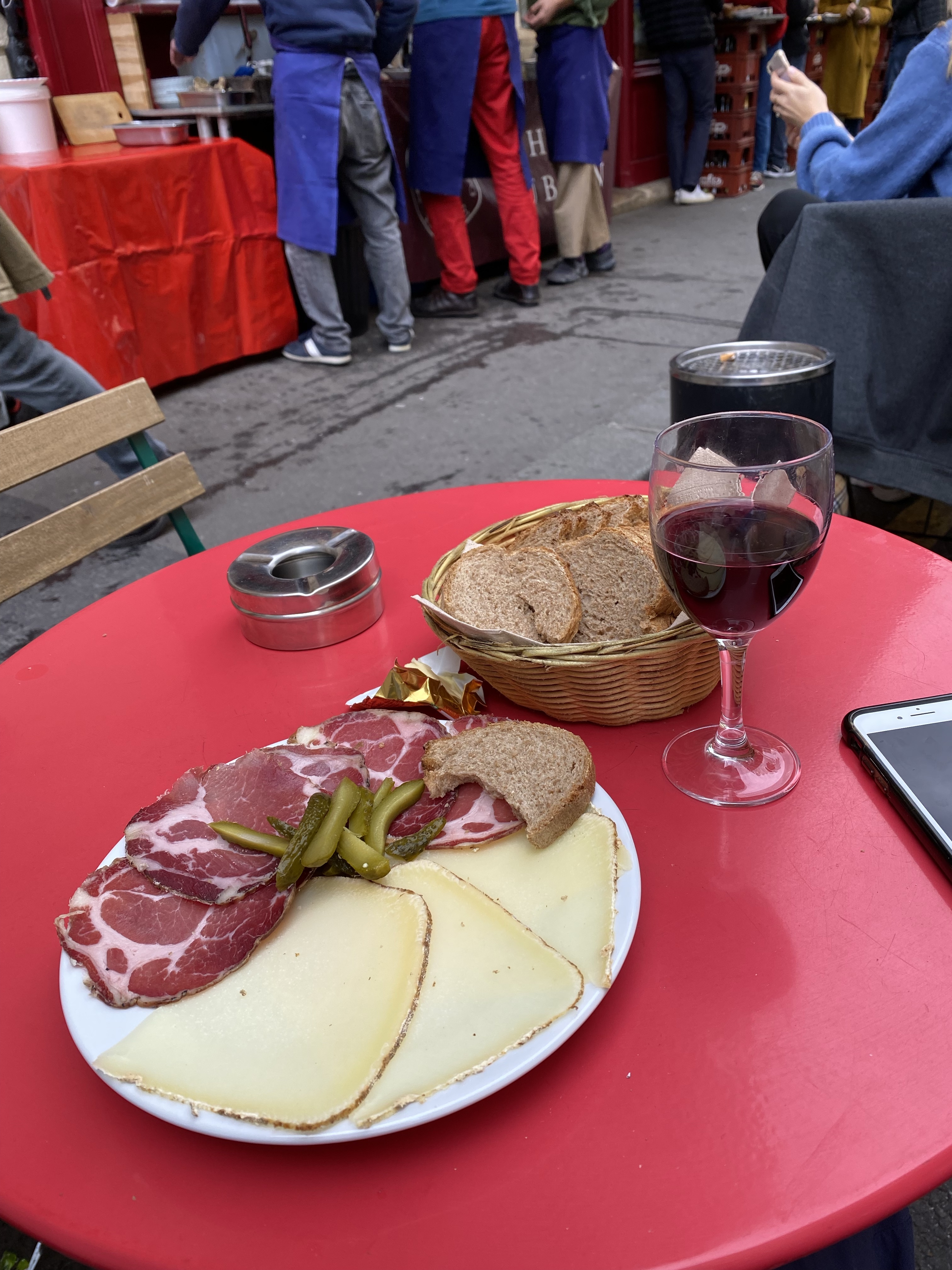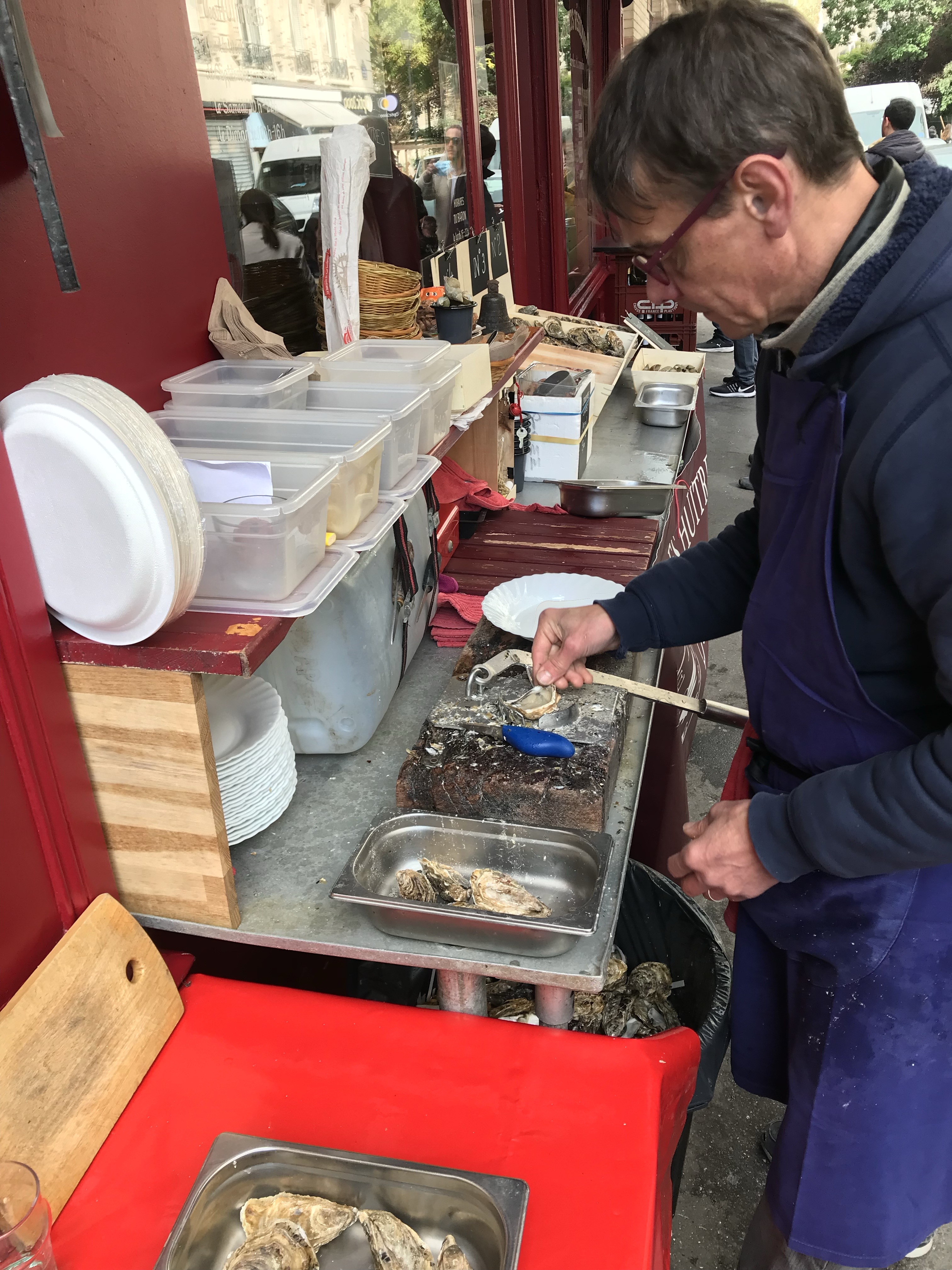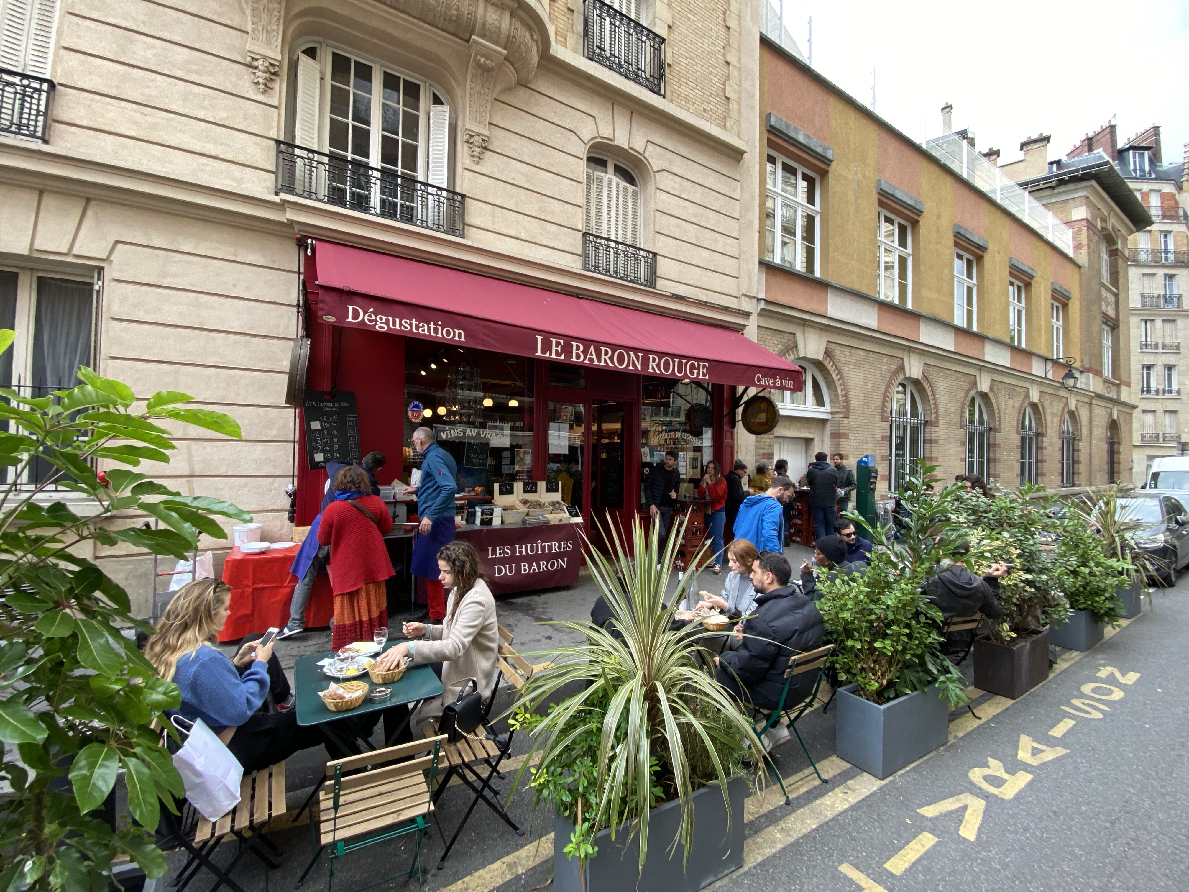 Started today with the goal of being able to eat something for breakfast. This is harder than it sounds when you don’t eat Wheat, eggs or corn. Luckily I had done some research and hopped a bus over to a gluten free bakery, called of all things, No Glu! They had a delicious Chorizo and cheese roll. Fortified with that and a cup of coffee, I was just leaving when a batch of GF croissants came out of the over, needless to say one came into my possession immediately. From there I headed over to a bicycle store to see what they had in folding bikes, Cyclable, on the Canal St. Martin. They had 2 possibilities for me a Tern D8 and a Tern BRB. Both would be decent to ride and easy to carry on the train. From there, a nice stroll along the Canal St. Martin brough me to 10 Belles, one of the better coffee places in Paris. (Coffee in Paris is at great odds with the terrific terraces, have yet to find a place with both excellent coffee and a good terrace.). After that a bus took me to the favorite Marche D’Aligre, one of the more vibrant open markets in Paris. A brief look around the market and it was time for some oysters and a glass, Le Baron Rouge did the trick and was doing a brisk business. From there some more buses and metros back to the hotel for a brief break and then to Oliver and Lina’s book signing at WH Smith. This is an extremely large English language bookstore not far from the Louvre. The place was nuts, but various fans did show up. Ended up strolling back toward rue de Montorgueil and picking up a few appetizers at an Italian restaurant, some grilled veggies and some risotto balls. I’ll put a plug in here: If you’ve been to Paris enough to be familiar with the Metro, it’s really worth learning how to use the buses, you can see a lot more while you’re traveling. Do yourself a favor and buy the weekly Navigo Decouverte pass and then it’s all you can eat. I buy this even when there are only a few days left in the week, because it is so convenient, and, at 5-6 rides/day I still save money even with only a few days use.