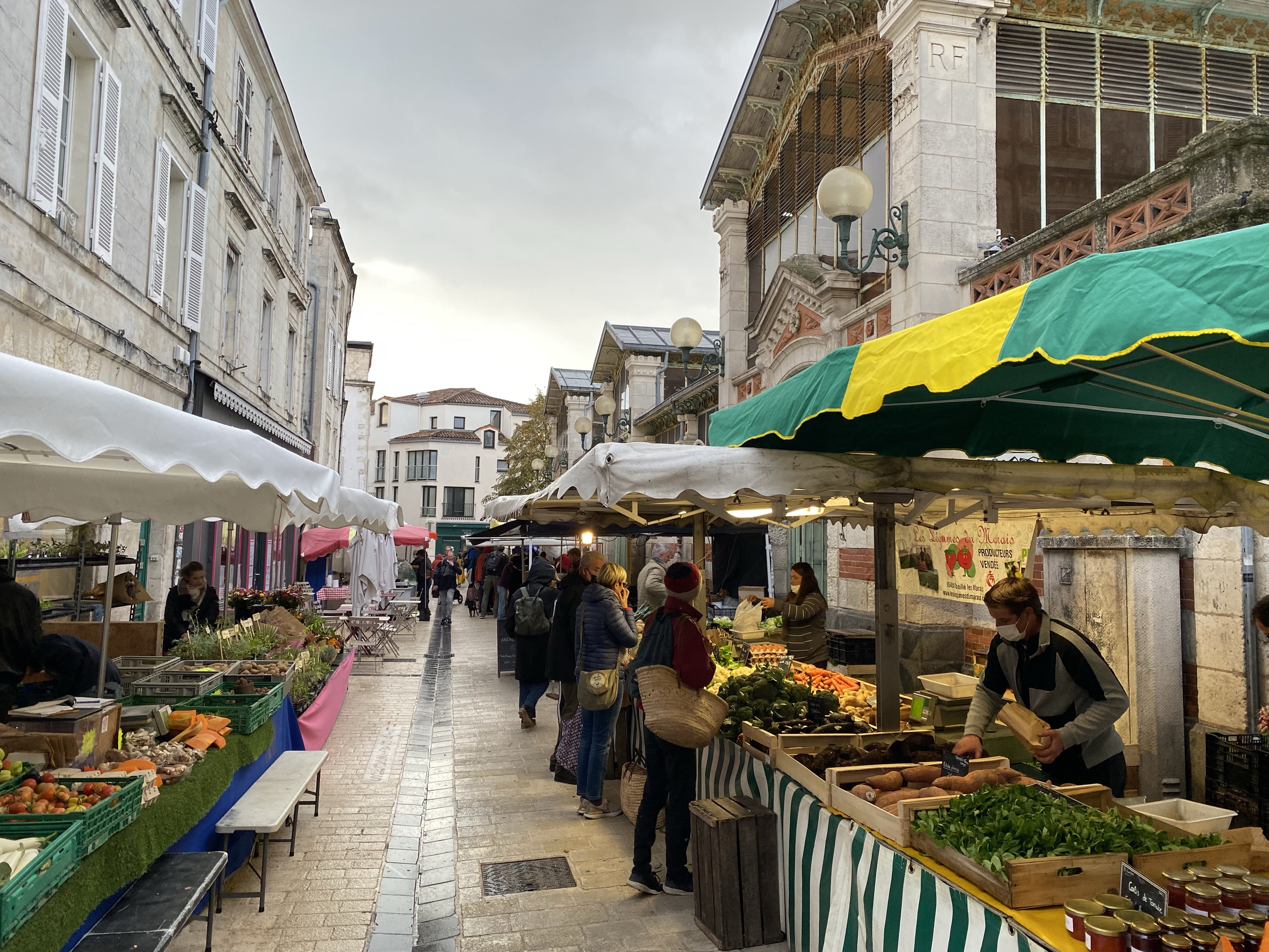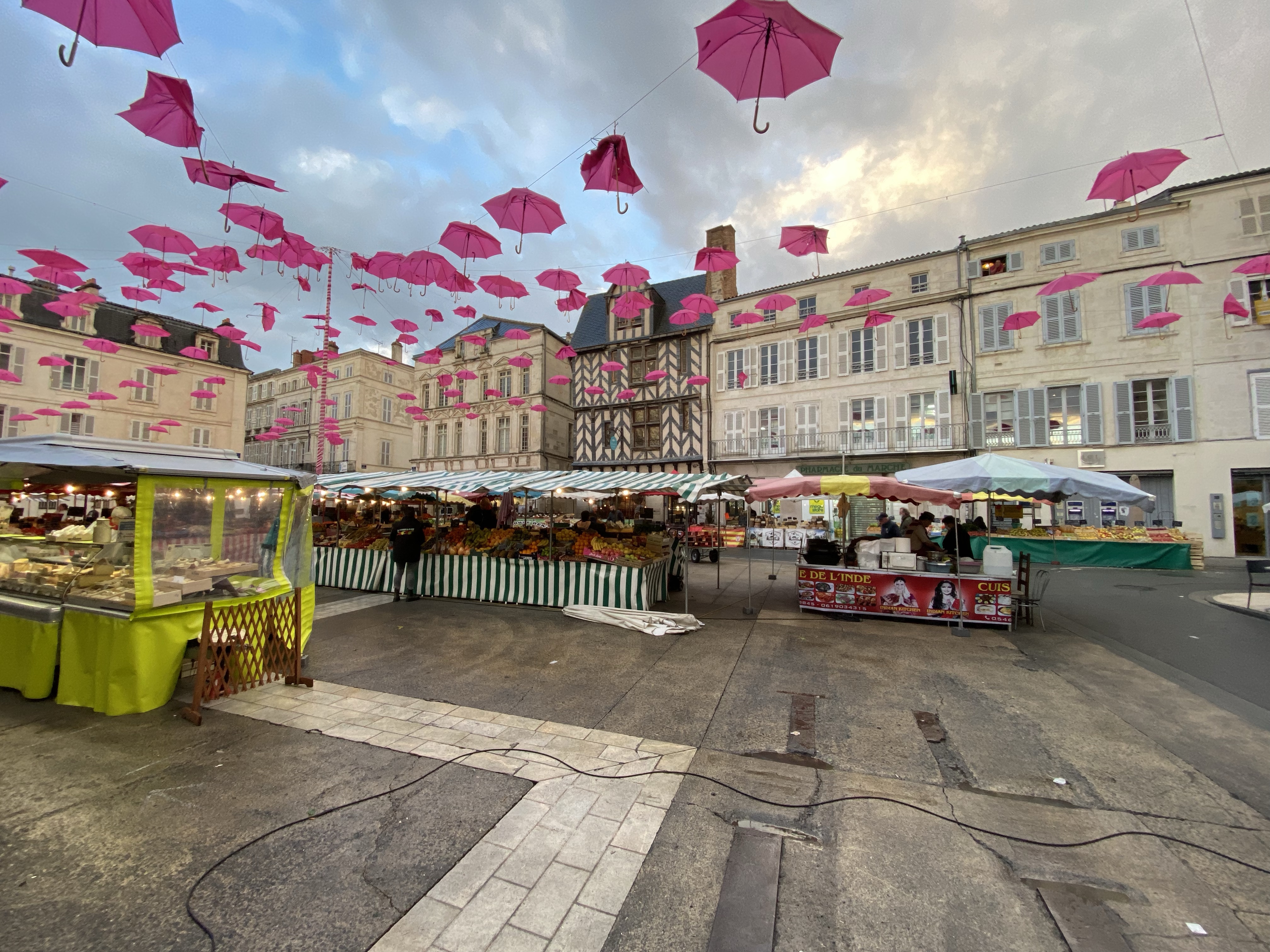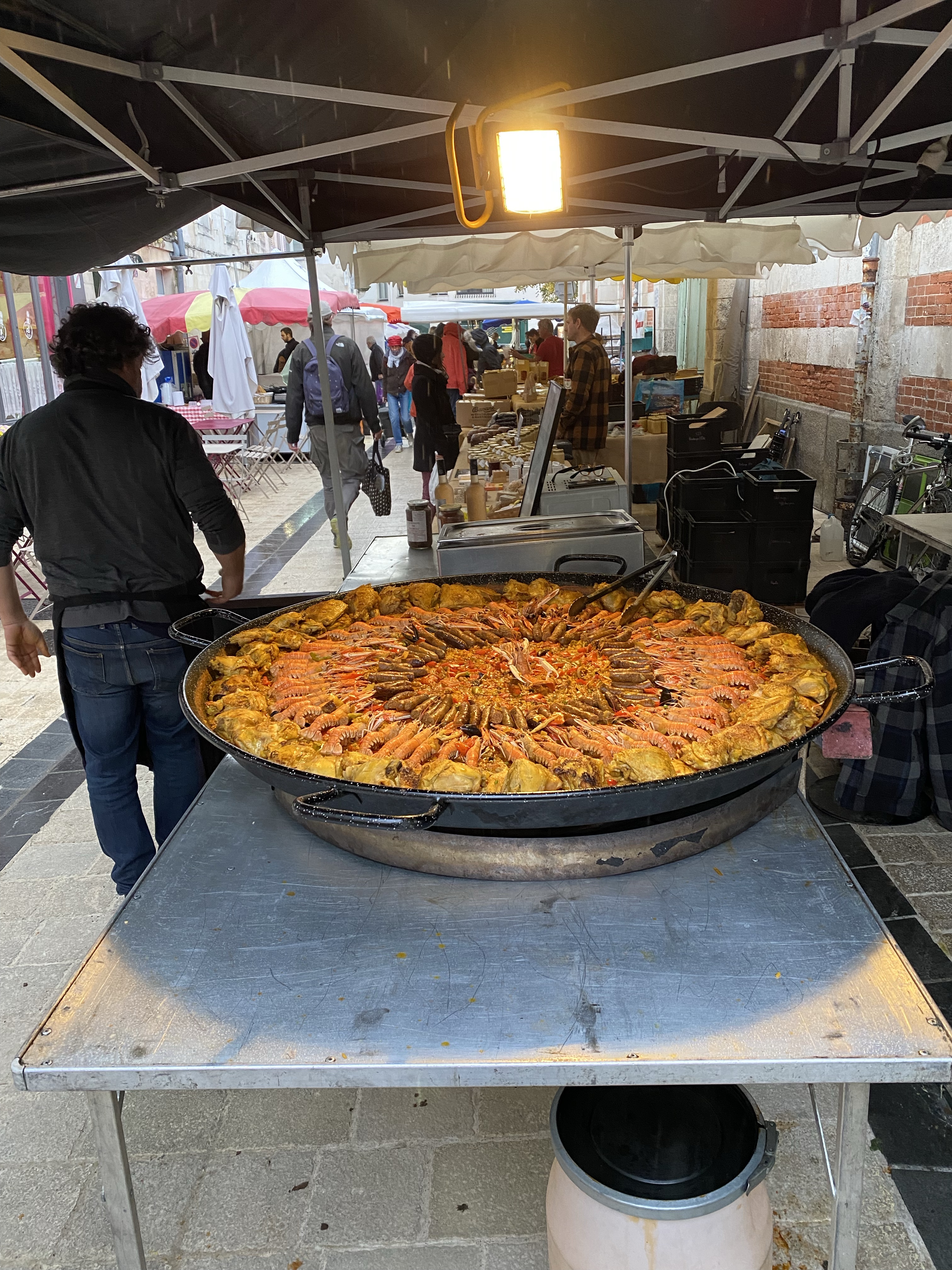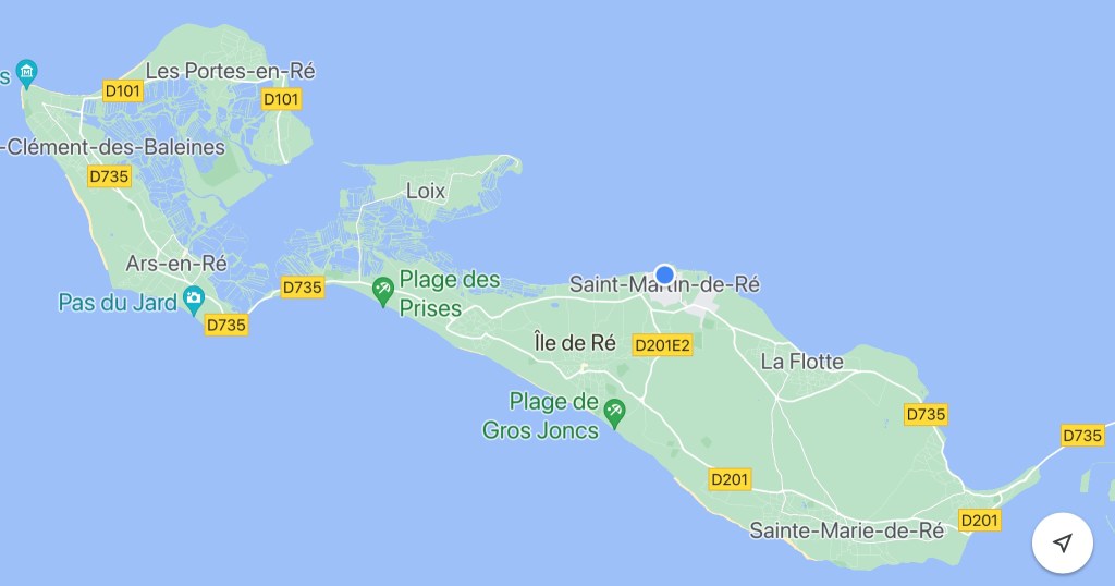 The forecast changed today, and it’s turned into a lovely warm sunny day. I started out with a tour of the market in La Rochelle, substantially busier and with more vendors as it is Saturday. Then off to Pl Verdun where I found the appropriate bus to Ile de Re. Note to others this is a regional bus, white with red not yellow like the city buses, with your back to the carousel and the church to your left, go straight to the top fo the square to find the #3, should say Vers Ile de Re on the stop. It’s just over an hour ride to the main port town on the island, Saint Martin de Re. Lovely little cobblestone street port town, kind of reminiscent of Cassis, if you been there. Lots of outdoor restaurant and terrace seating. The town was fortified to keep out the Protestants during the Hugenot rebellion of the 1620s and had a prison that transhipped prisoners to French colonies in various places. Fortifications are still here and have been turned into parks. The whole island is set up for extensive bicycling, because the weather was very sketchy when I left La Rochelle, didn’t even try for that. After much strolling around and reading of menus, I found an appropriate looking restaurant on the little island in the center of the harbor and had a lovely lunch of Oysters, skate wing salad, and some fish, probably won’t be eating much dinner tonight. (You know you’re in a French place when the dining room guests have dogs!). Anyway, sitting on a lovely terrace with coffee as I write this and will take the bus back in about an hour.