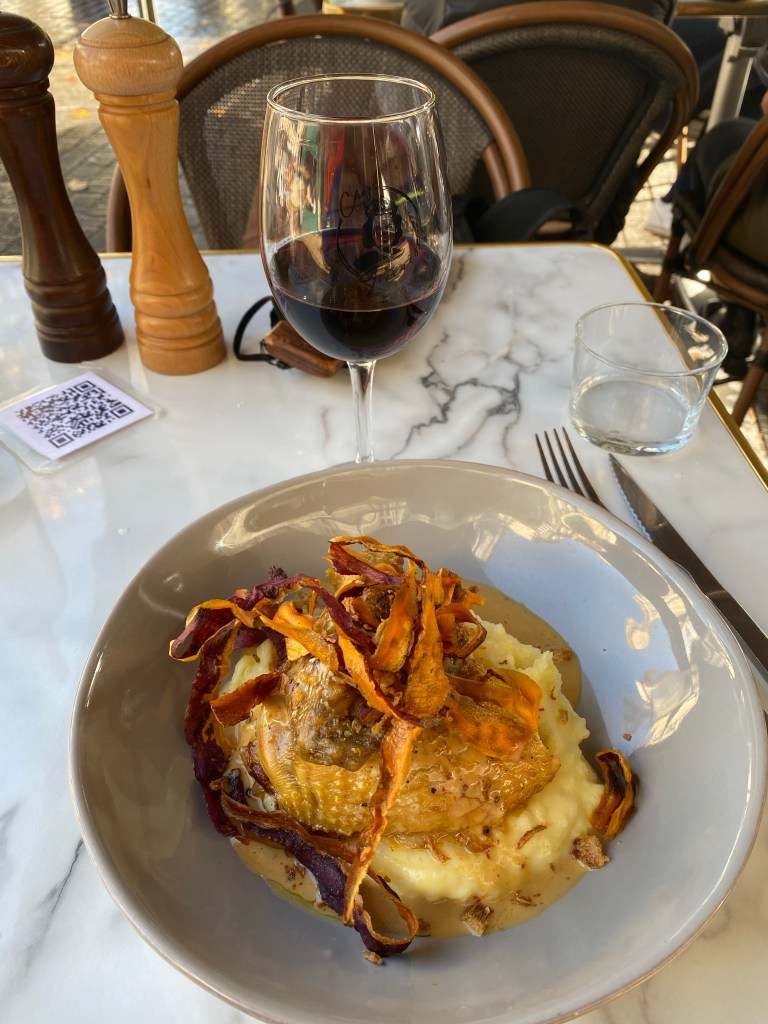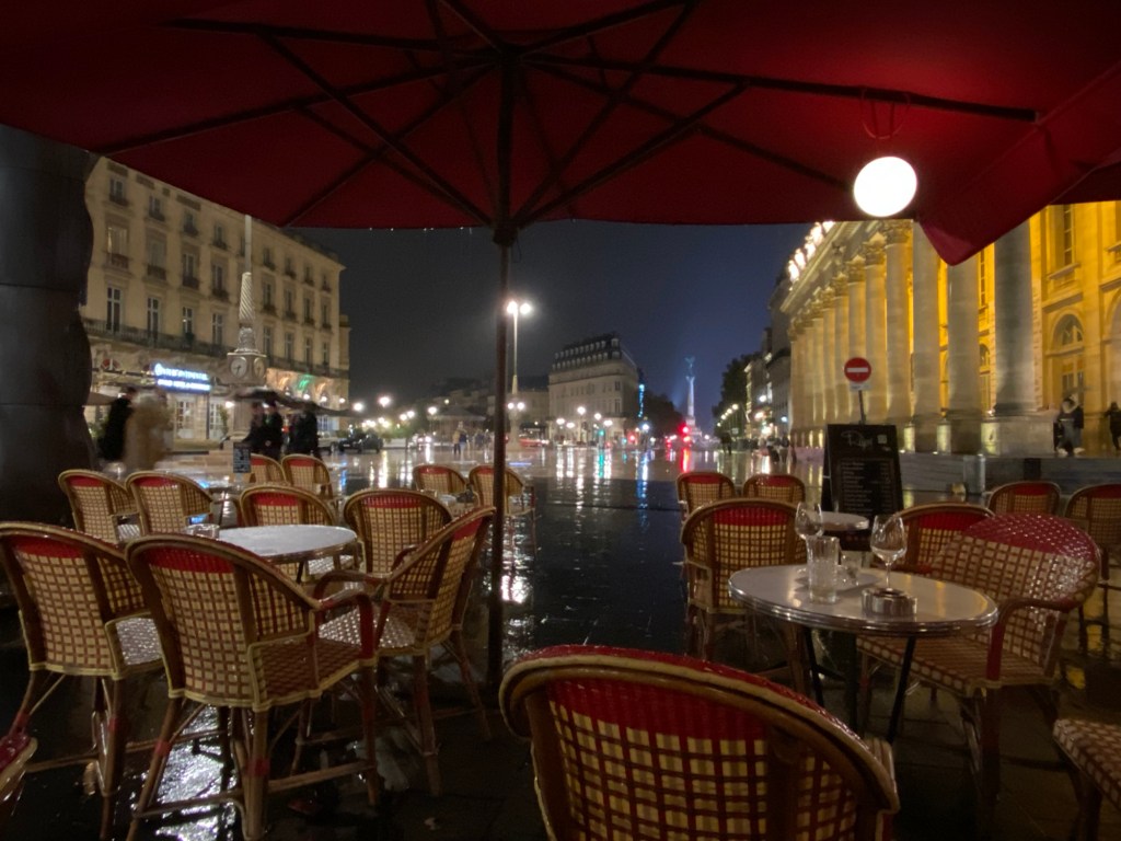 So, wanted to see what the outlying suburbs of Bordeaux look like, so I took the tram all the way out to Pessac. I should say that Monday, today, was a holiday, so many store etc. were closed. Pessac was basically a ghost town, so after a quick exploration, back on the tram and back into town. Went to the St. Michel neighborhood which had a bric a brac market going on, and had a so so lunch at a cafe. The soup came out cold, and, after talking with Etienne, the greeter in Nantes who was also a chef, I’m coming to the conclusion that his comments were spot on. He says that one of the reasons that many French cafes have the same menu is that they are buying things in prepackaged bags which they warm up in pots of boiling water. I’ve since noticed the soup I had at lunch, butternut squash on the same menu of many other places…. Hmm. Weather today alternated between a few sunny spells and pounding down rain. Since Bordeaux is paved with a lot of what appear to be limestone pavers, it can be really slippery. Anyway, after walking around a fair amount, went back Brasserie Bordelaise for dinner and had a reasonable entrecôte for dinner, nothing fabulous but it was decent. After dinner, it really started raining with some vigor. (Internet really slow here, so posting pictures is taking a bit of fiddling)