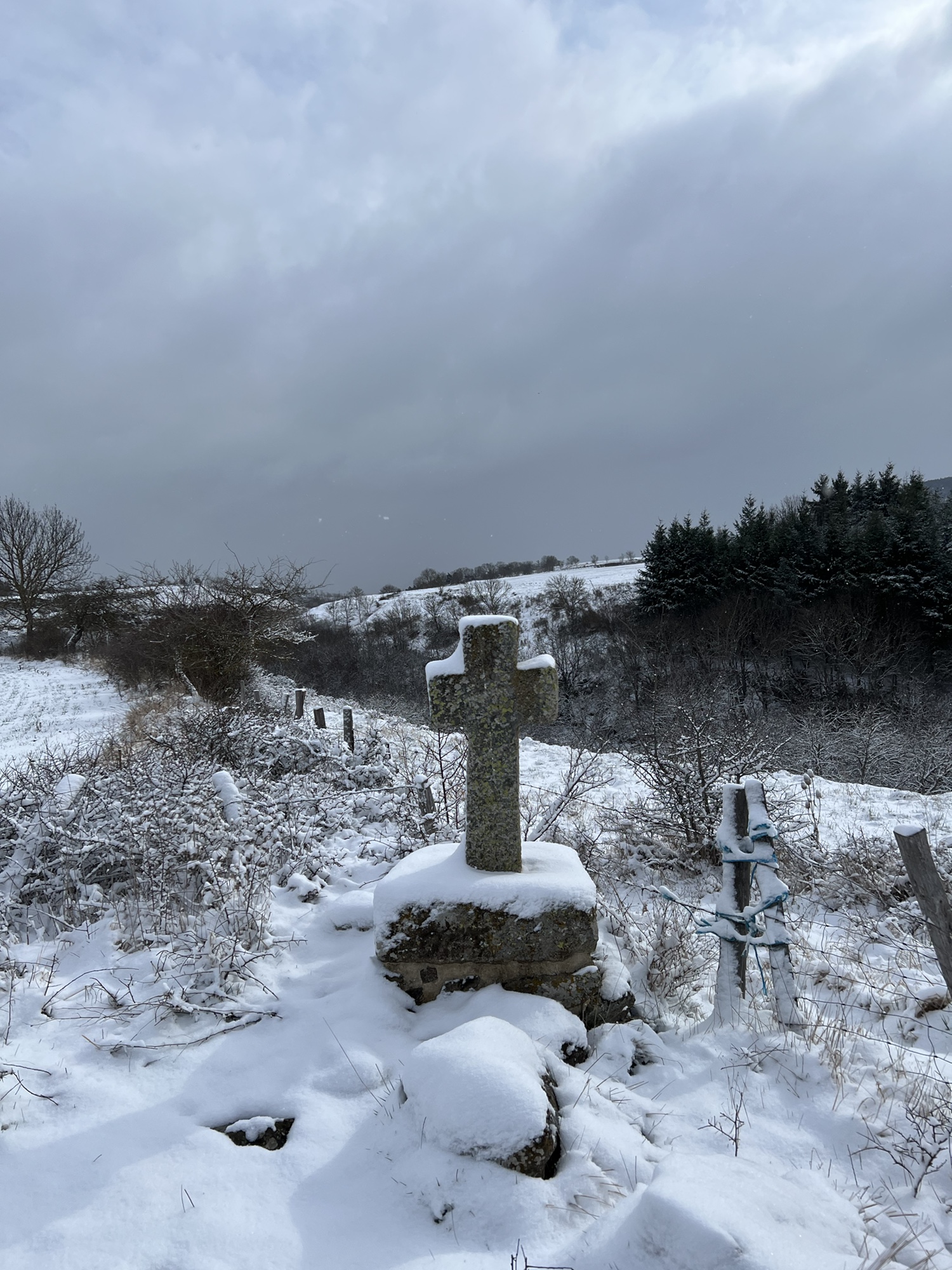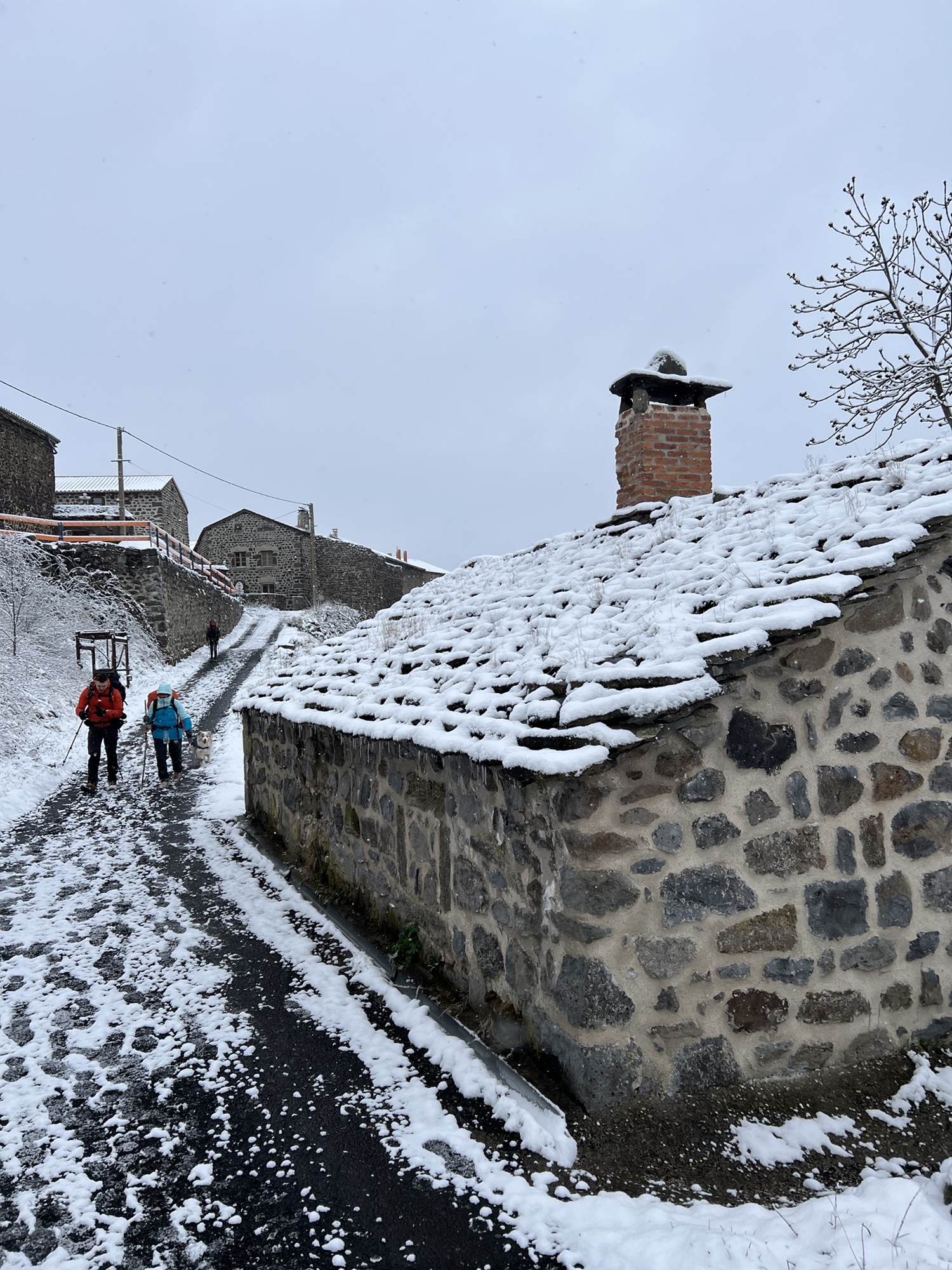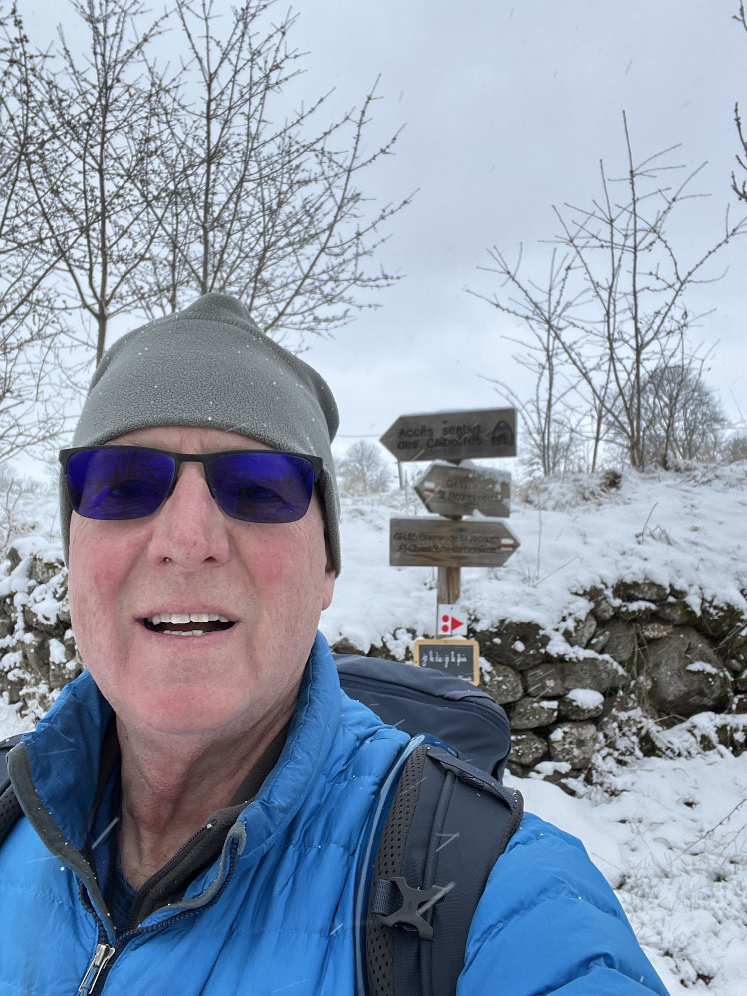 The weather stayed true to the forecast and there was a dusting of snow when I got up a little after 6:00am to organize and head up the hill to the cathedral for the 7:00am pilgrim blessing/mass. There were about 40 people in attendance, so things are off to a good start. The official opening for most Gites and other places is April 1st, so if you plan to do this try to start after that date, and given the weather, maybe May would be better. The trail out of Le Puy (630M, 2,066ft) climbs off an on all day until Montbonnet, 16km down the road at (1127M, 3,700ft). This makes for a fairly strenuous day and more so with snow, When there was not much wind it was actually quite pleasant, but many sections were very exposed and the wind was blowing snow around making pretty rough going. I used some wool socks as mittens, and had an Icebreaker T Shirt, Icebreaker sweater, LLbean vest and a puffy jacket, and was comfortable when it wasn’t too windy. Luckily, the 16km to my lodging was done by about 1:00pm and the Gite I’m staying at had lunch available, so stumbled in the door and sat down to lunch, joined by Tetsu, a retired Japanese immunologist. Unfortunately tomorrow’s weather is looking much the same, if not slightly colder. Right now it is snowing quite hard. There’s a small peak to climb over right out the town and then a bit of up and down before descending to the next stop.