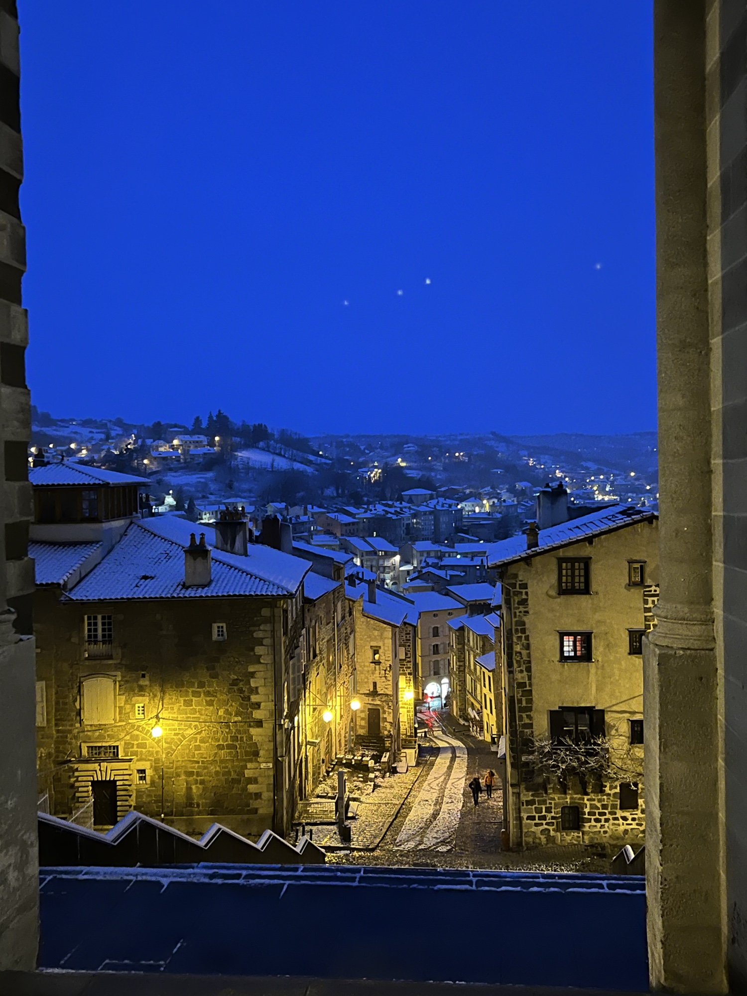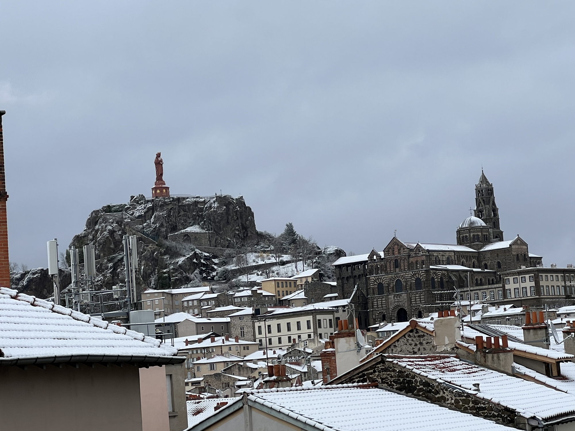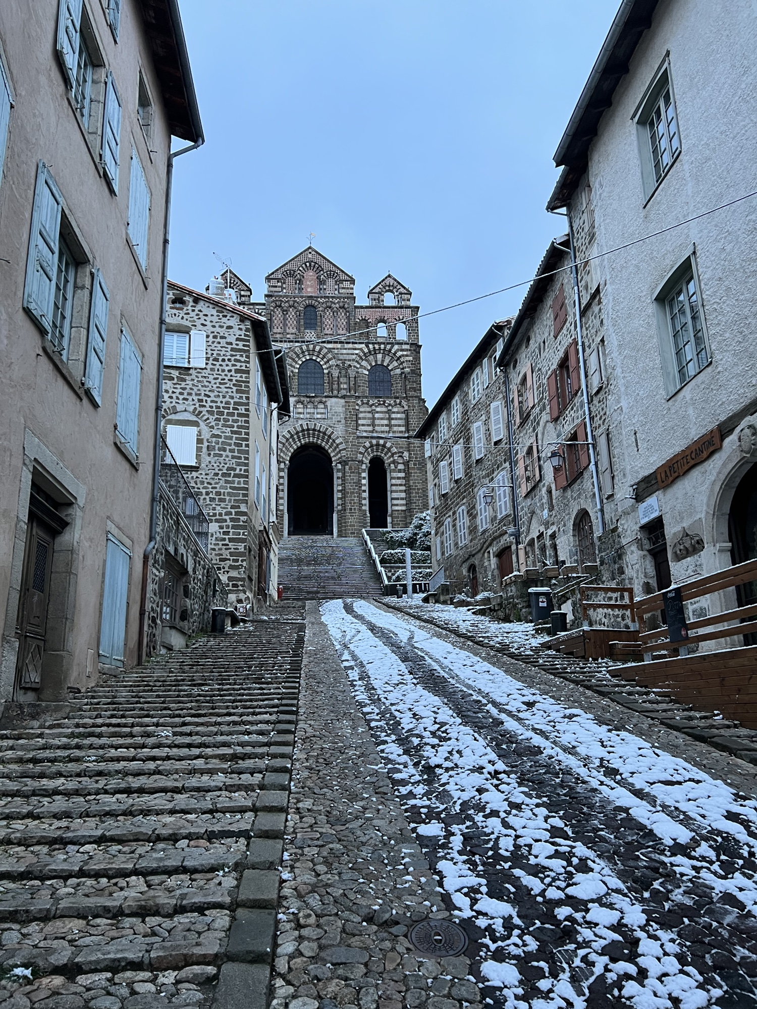 The weather stayed true to the forecast and there was a dusting of snow when I got up a little after 6:00am to organize and head up the hill to the cathedral for the 7:00am pilgrim blessing/mass. There were about 40 people in attendance, so things are off to a good start. The official opening for most Gites and other places is April 1st, so if you plan to do this try to start after that date, and given the weather, maybe May would be better. The trail out of Le Puy (630M, 2,066ft) climbs off an on all day until Montbonnet, 16km down the road at (1127M, 3,700ft). This makes for a fairly strenuous day and more so with snow, When there was not much wind it was actually quite pleasant, but many sections were very exposed and the wind was blowing snow around making pretty rough going. I used some wool socks as mittens, and had an Icebreaker T Shirt, Icebreaker sweater, LLbean vest and a puffy jacket, and was comfortable when it wasn’t too windy. Luckily, the 16km to my lodging was done by about 1:00pm and the Gite I’m staying at had lunch available, so stumbled in the door and sat down to lunch, joined by Tetsu, a retired Japanese immunologist. Unfortunately tomorrow’s weather is looking much the same, if not slightly colder. Right now it is snowing quite hard. There’s a small peak to climb over right out the town and then a bit of up and down before descending to the next stop.