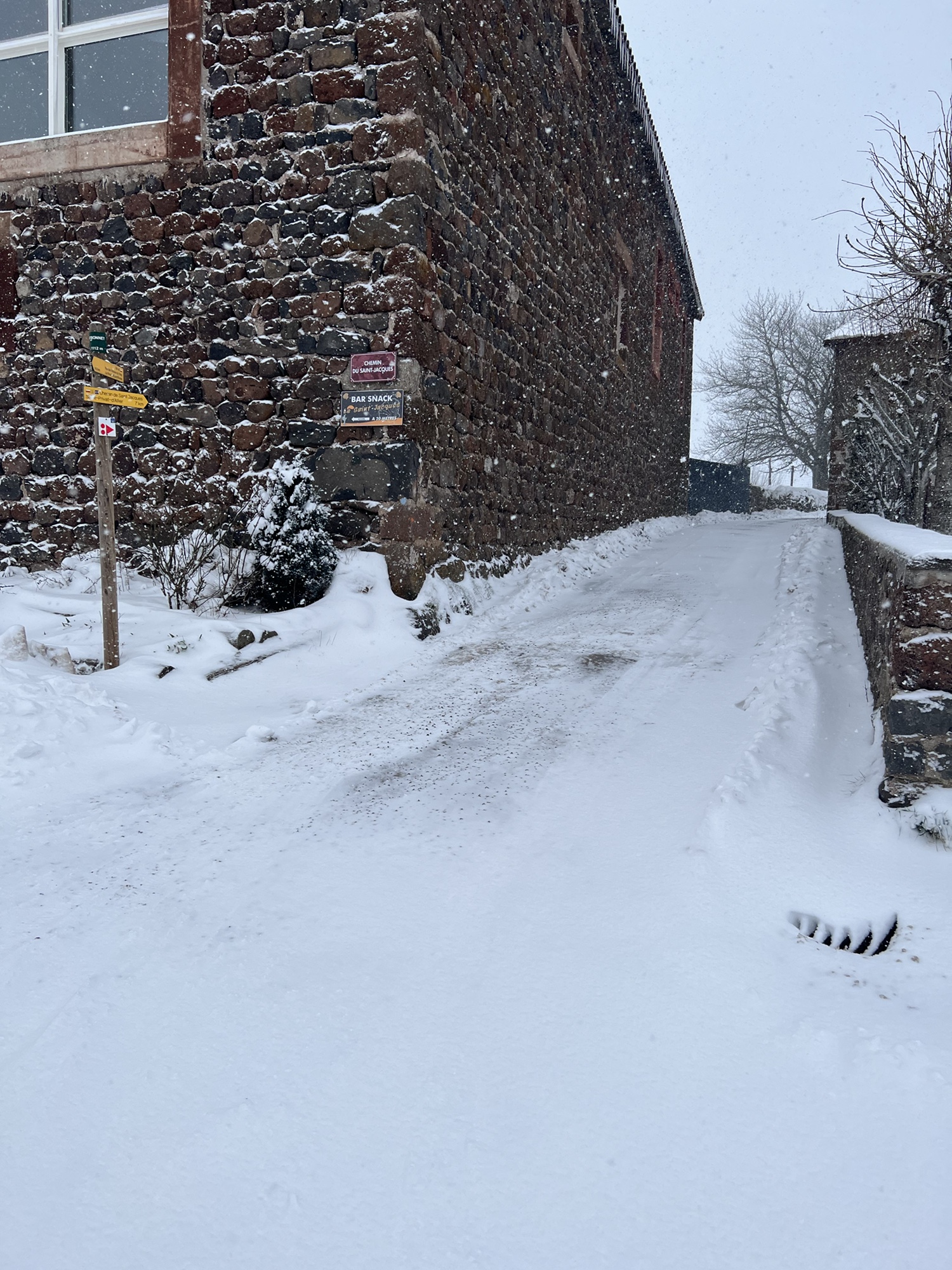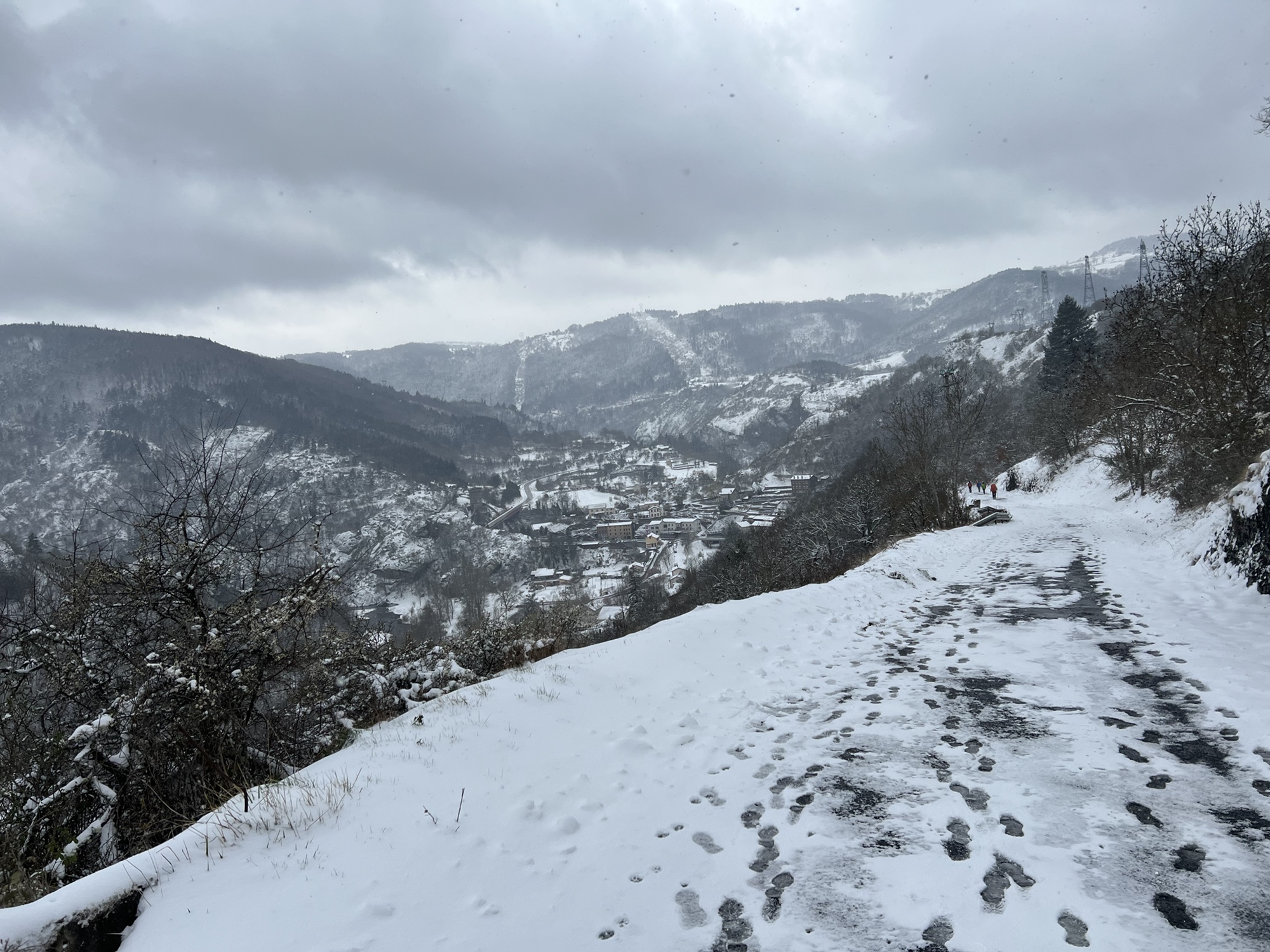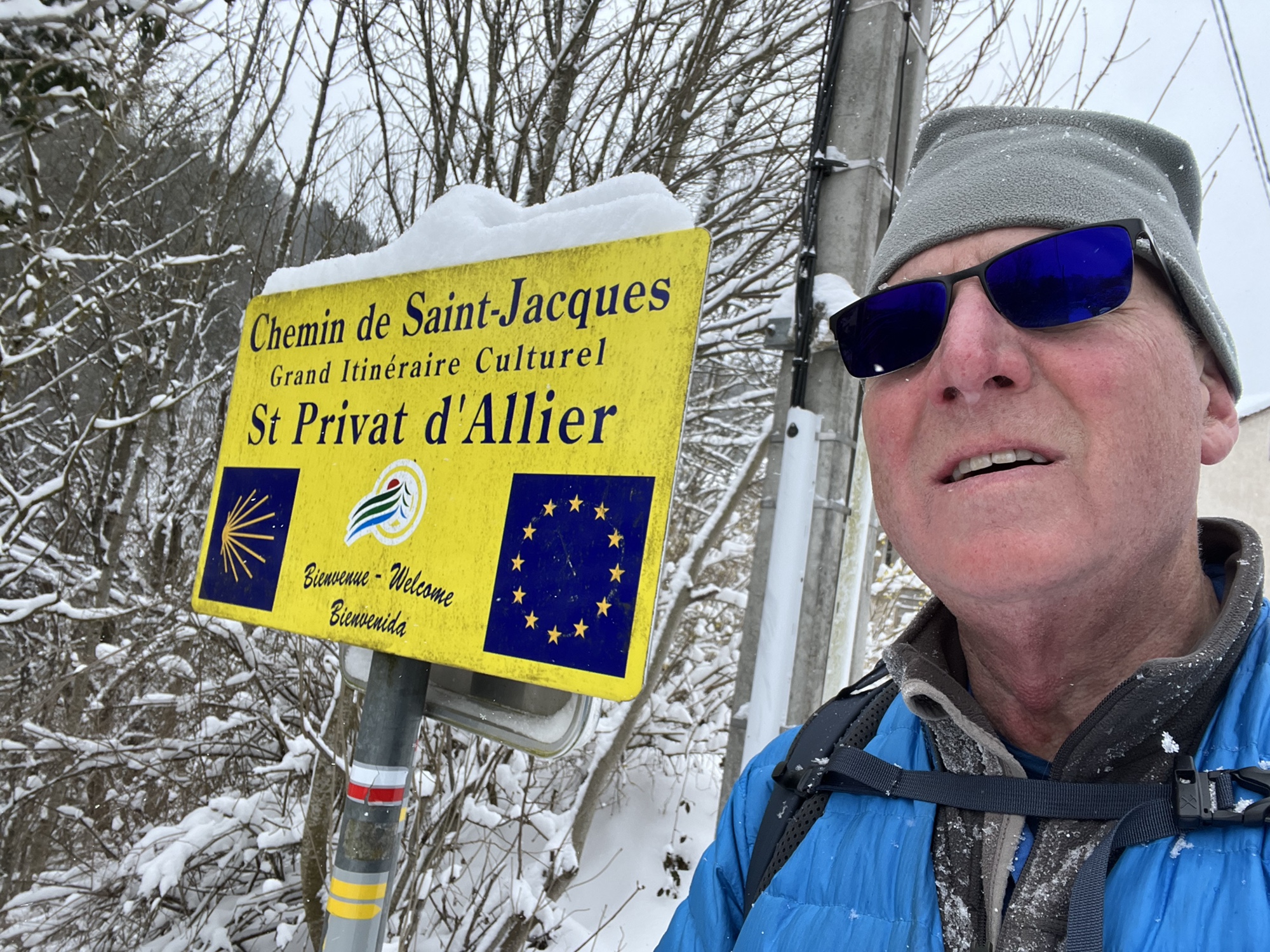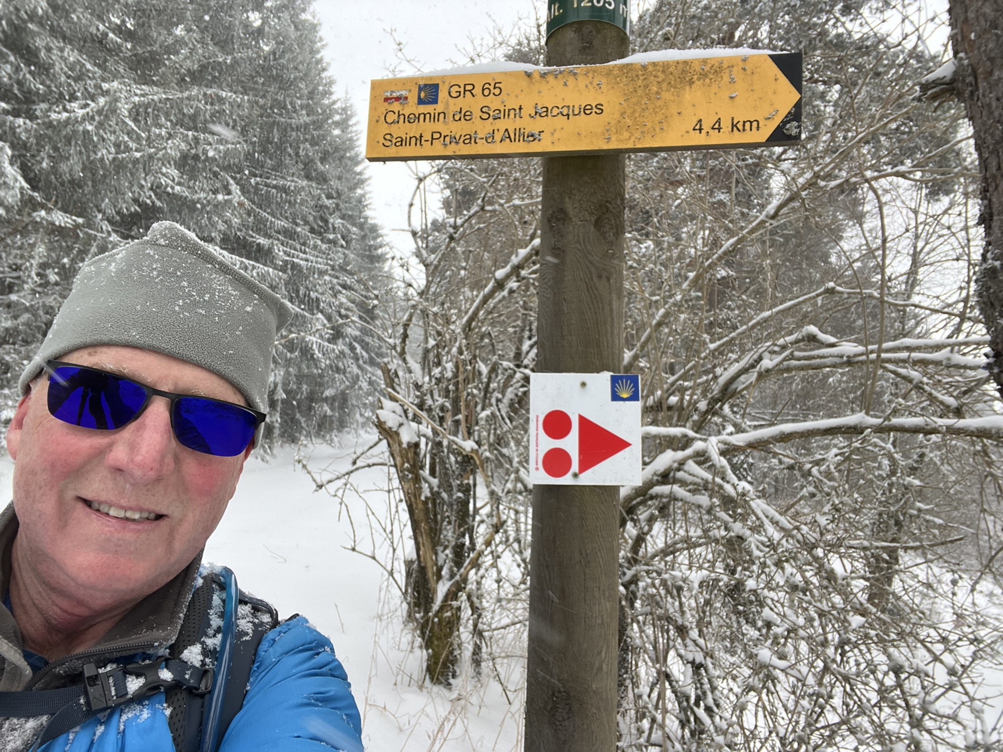 Well it seemed to snow off and on all night, and forecast temperatures were even lower for today. But, a few other pilgrims and I decided to head out of Montbonnet to the at least the first major stop, St. Privat. That turned out to be largely a pleasure as it was mostly in protected forest, about 6 inches or so of snow on the ground, but protected from the wind. There were some exposed parts, and they were pretty chilly. I found that the hose to my water bladder had frozen. A stop in St. Privat for some tea got things warmed up and then it was onward to Monistrol. Locals explained that the trail had too much snow pack, and we were told to avoid a downhill section that is particularly treacherous even in summer. So we ended up with about 6 of us walking down the road, but very little traffic and still beautiful. Here are pictures from today.