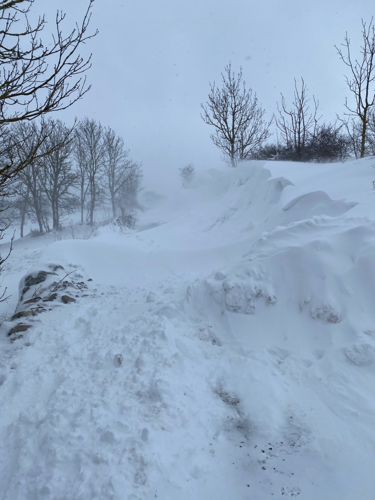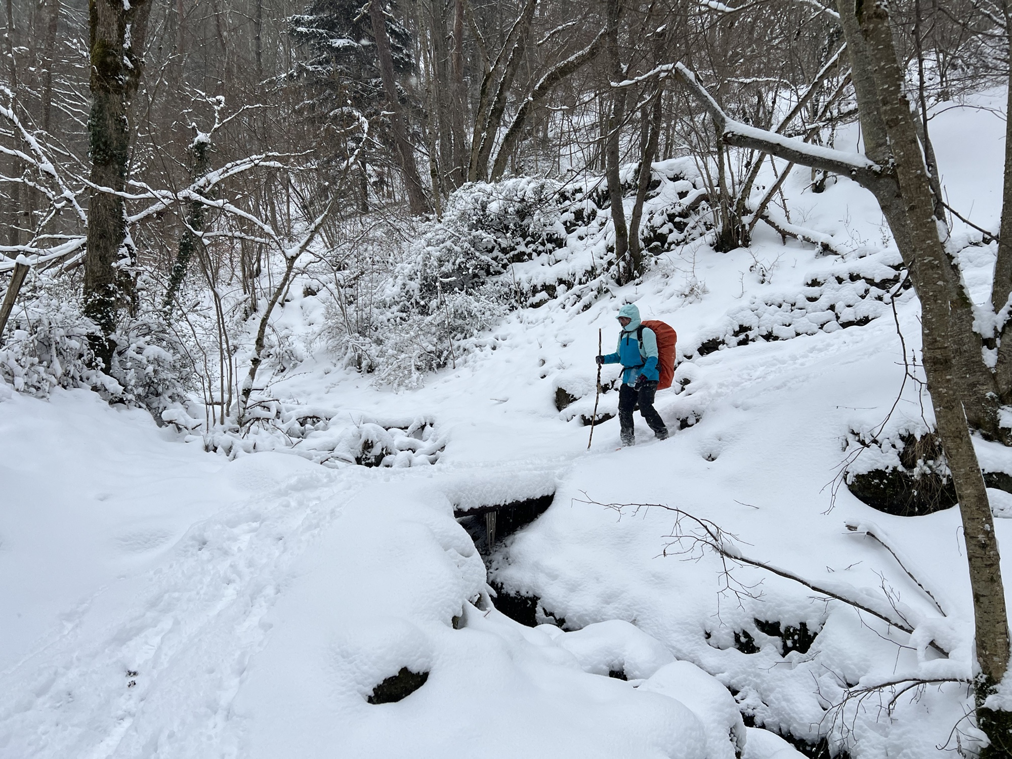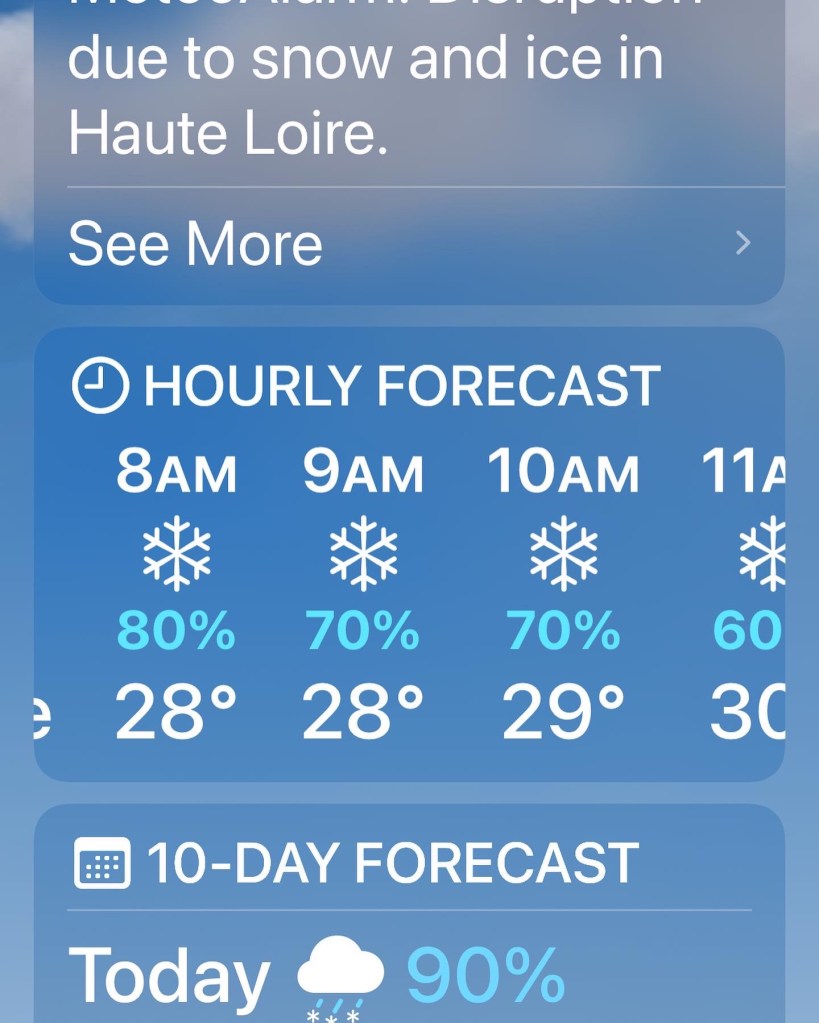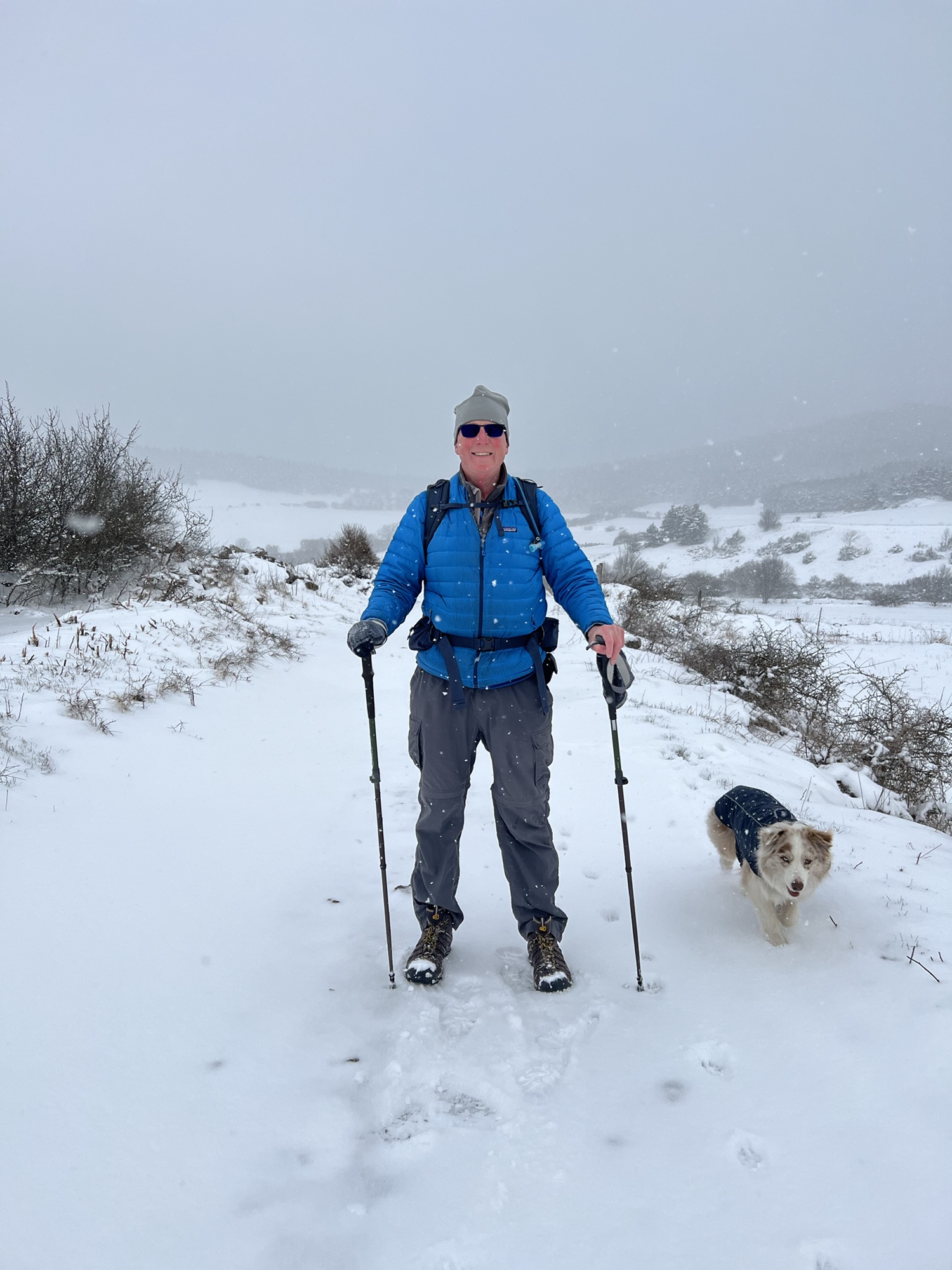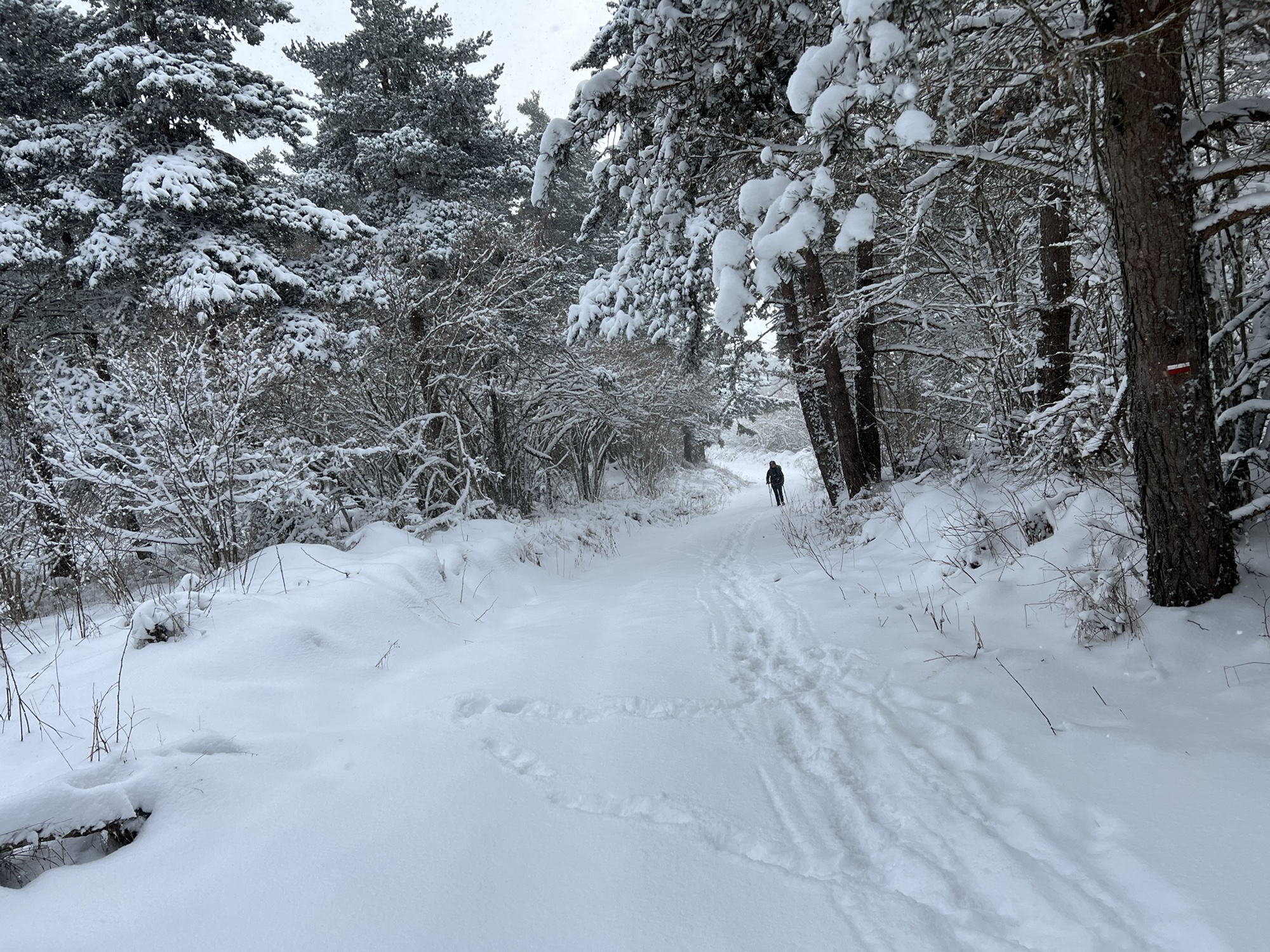 Well it seemed to snow off and on all night, and forecast temperatures were even lower for today. But, a few other pilgrims and I decided to head out of Montbonnet to the at least the first major stop, St. Privat. That turned out to be largely a pleasure as it was mostly in protected forest, about 6 inches or so of snow on the ground, but protected from the wind. There were some exposed parts, and they were pretty chilly. I found that the hose to my water bladder had frozen. A stop in St. Privat for some tea got things warmed up and then it was onward to Monistrol. Locals explained that the trail had too much snow pack, and we were told to avoid a downhill section that is particularly treacherous even in summer. So we ended up with about 6 of us walking down the road, but very little traffic and still beautiful. Here are pictures from today.