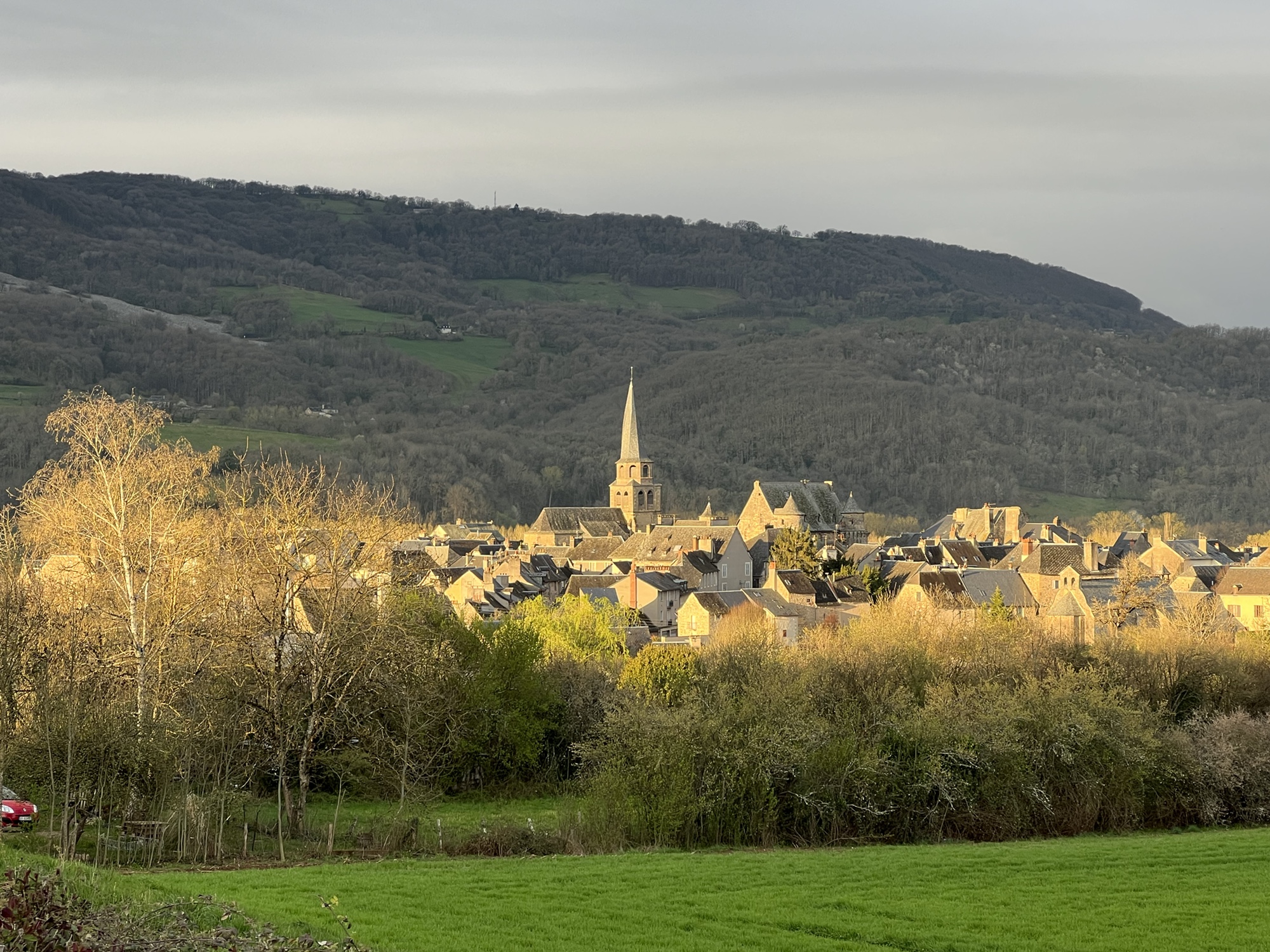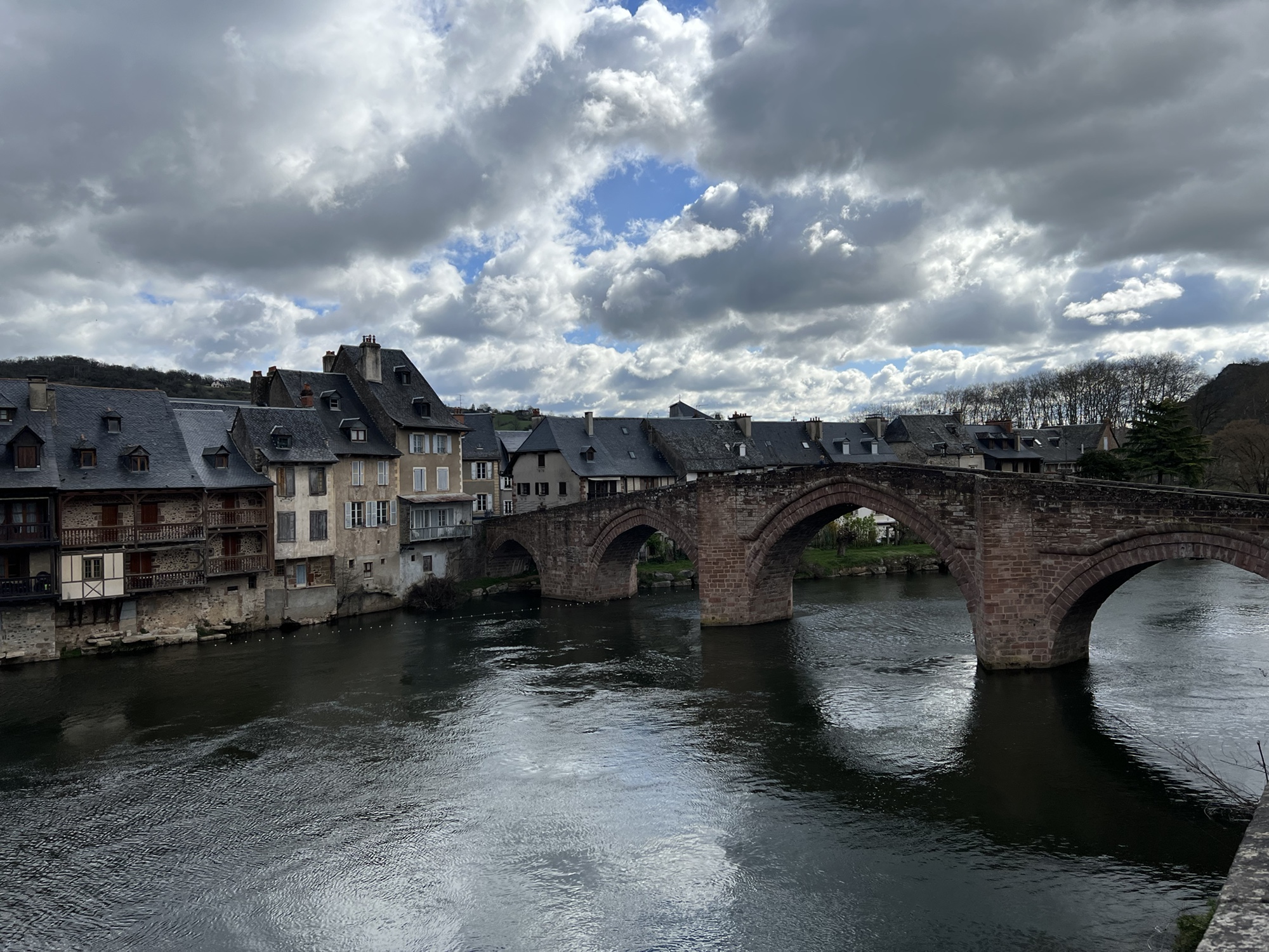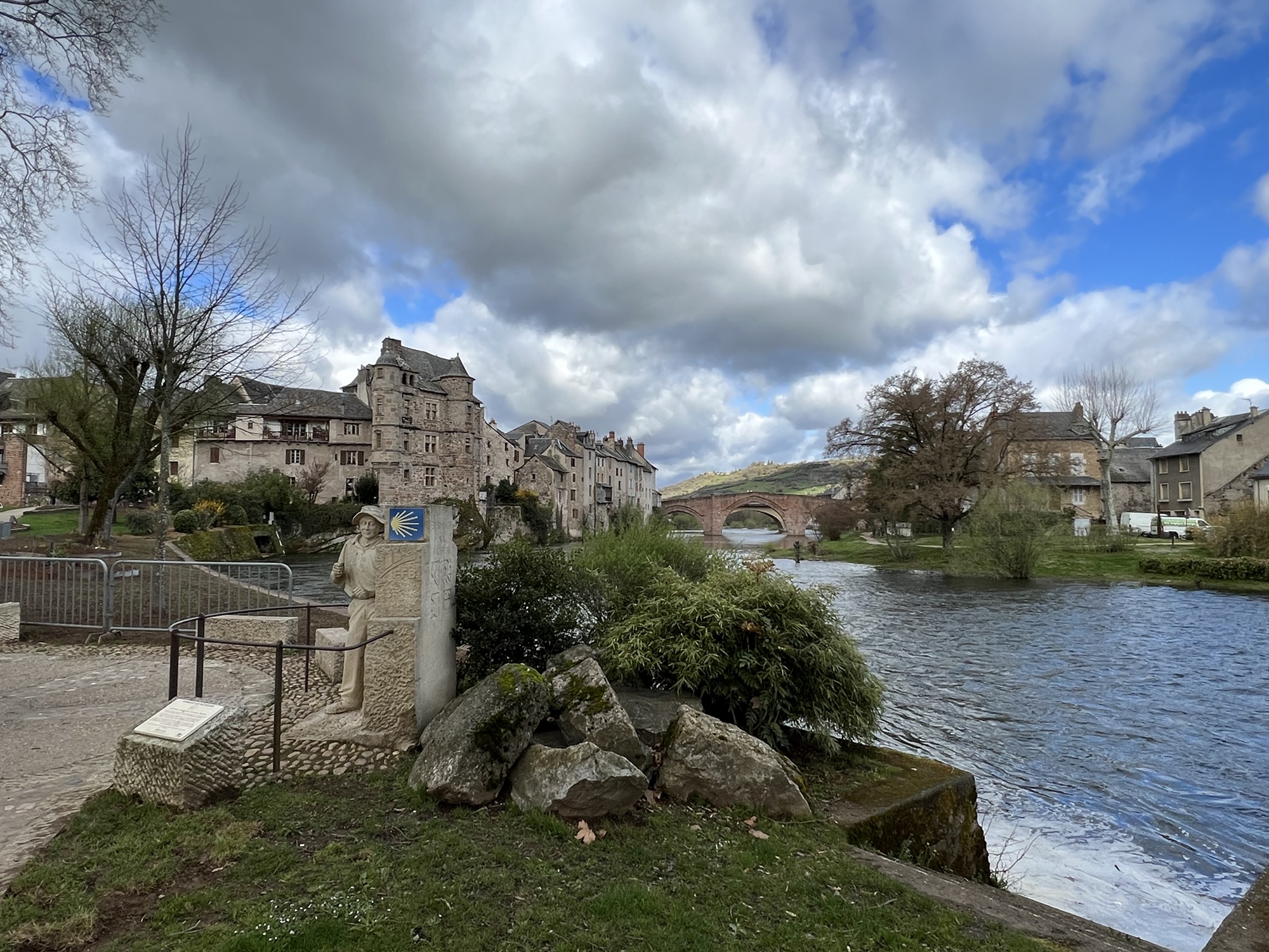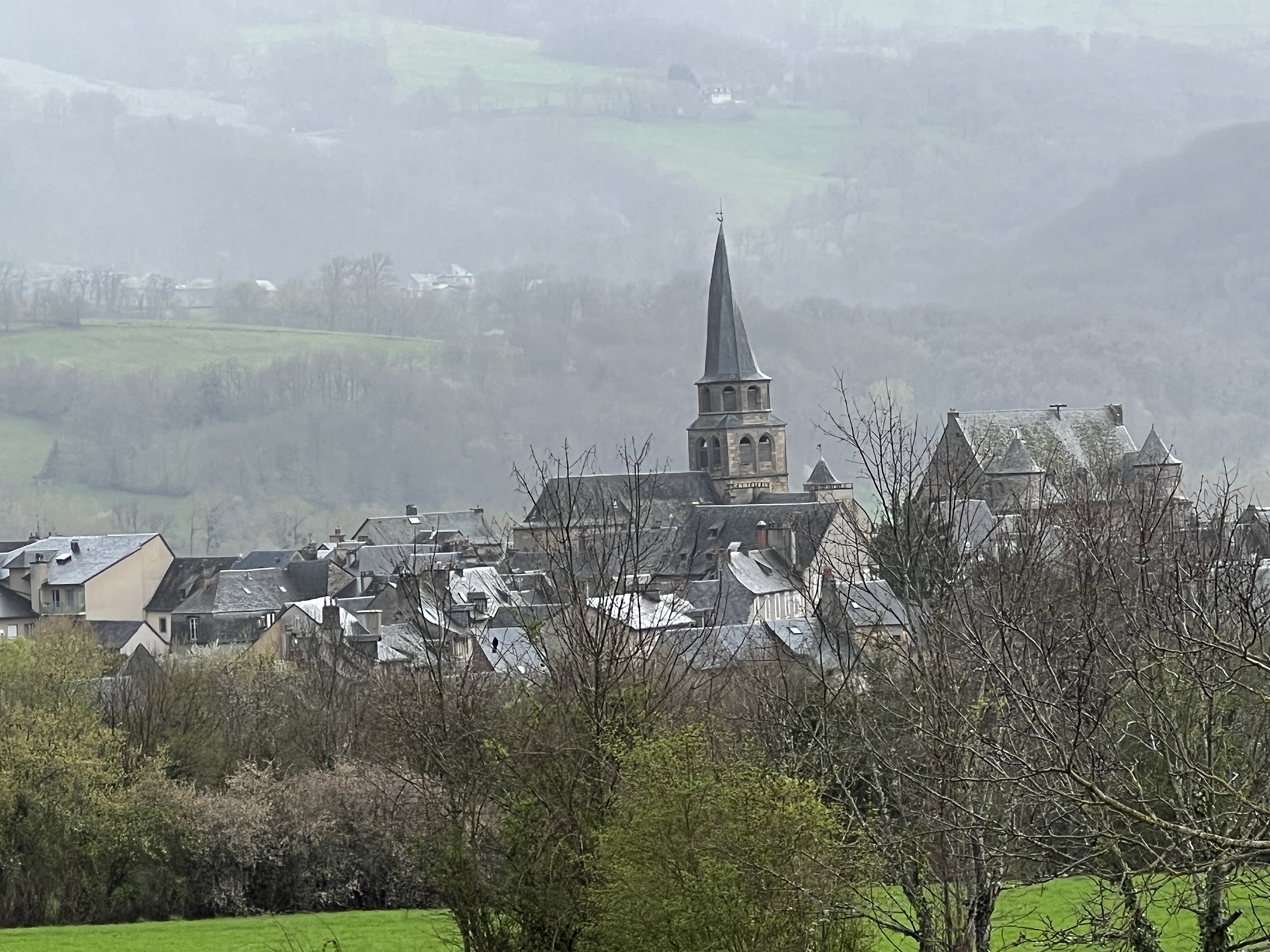 Had a pleasant quiet night in the Couvent, and abbey or monastery that has been converted to a hotel. Very quiet, a simple but good dinner. Was out the door just before 8:00am and walking through Saint Come. Although in total there was not much net change in altitude, there was quite a lot of up and down today. Weather, although forecast for rain, gave me a break and was actually quite pleasant. Basically a long walk through lovely countryside. Of course when I arrived around 2:30pm in Estaing, the hotel had a sign saying it would not open till 4:00pm, no restaurant would serve me because it was after 2:00pm. Luckily, the grocery store was open. So, today was the ninth day in a row of walking and definitely the easiest weather wise. It is interesting that after nine days of solid walking I still find it a challenge, lots of up and down, mud, rocks etc. Navigation is pretty straight forward, well signed and I have the Wise Pilgrim app to consult if I feel that I might be off trail. Somehow my pack is still heavier than 20lbs even though I’m having a bag transported. Walk the Camino, the company that made my reservations has done a great job and is very responsive to WhatsApp texts. My 3 different French Sims all seem to work, with Orange having the overall best coverage. Other pilgrims have been pleasant to meet, no other Americans encountered yet. Hard to believe only two more days to Conques where I end this round. I will plan to come back and walk another section, probably in the fall.