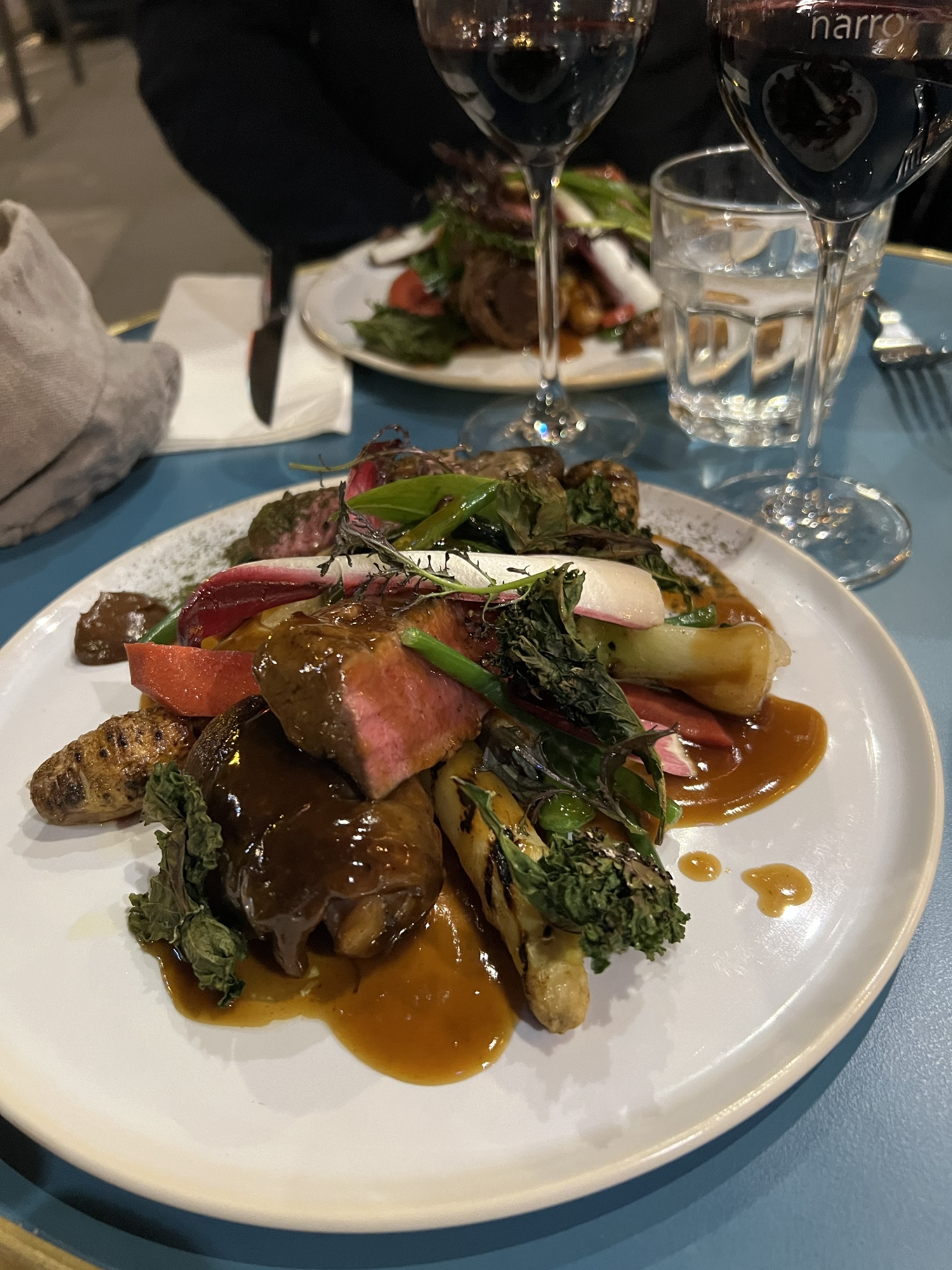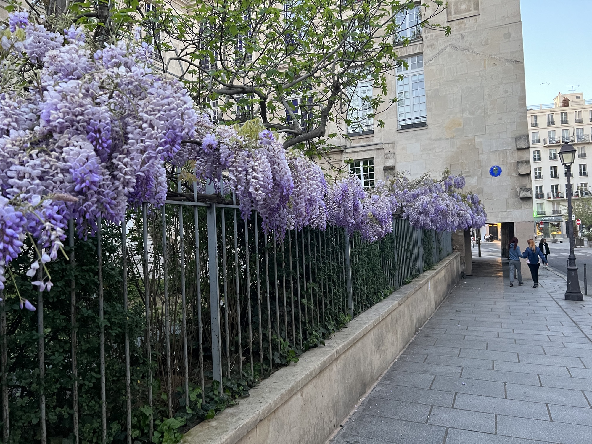 Lamb dish looks incredibly good! love the purple flowers on the fence, night shots look festive. What a perfect evening stroll.