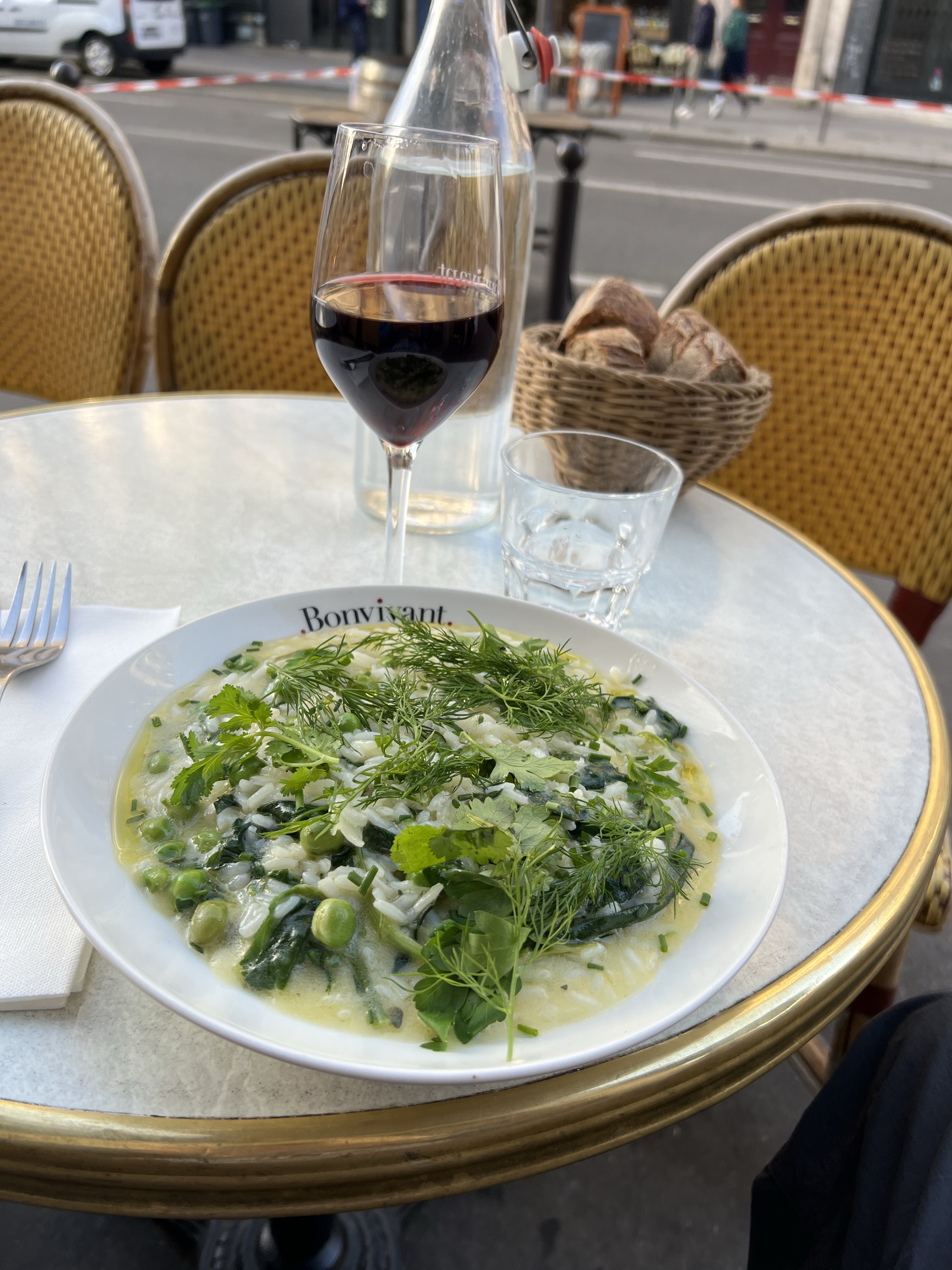 Started off with a coffee at Le Peleton, then to the Bastille market, a huge affair. Lots of people, food, veggies etc. Then to NoGlu the GF bakery for a croissant. They do them quite well, although they are small. After, a stroll towards the Marche d’Aligre, followed by a glass and some charcuterie at Le Baron Rouge. Headed out to check out two tango events, one at Luxembourg gardens and the other on the Seine, neither of which showed any promise. Dinner was some risotto at Bon Vivant, a nice wine bar in the 5th.