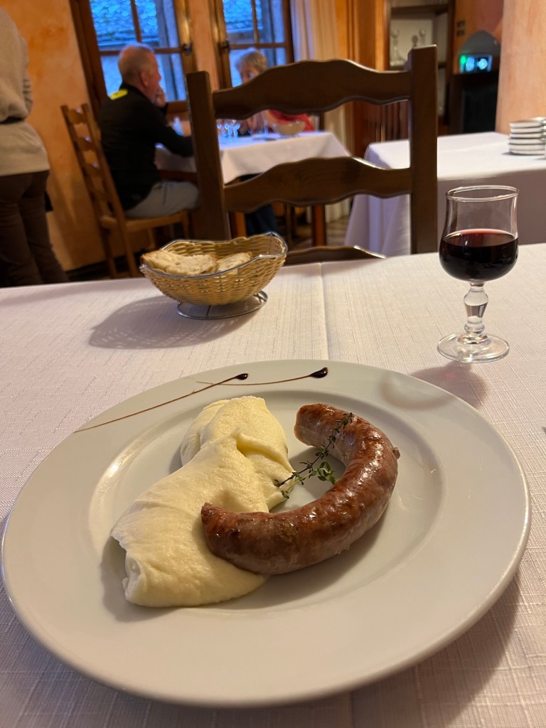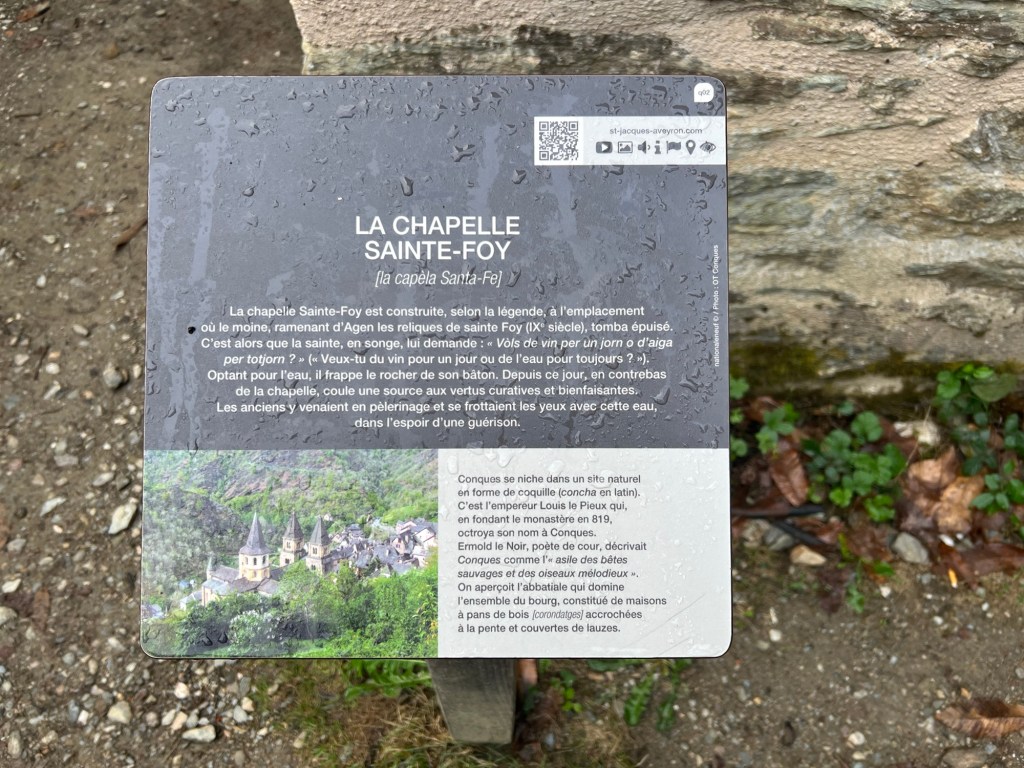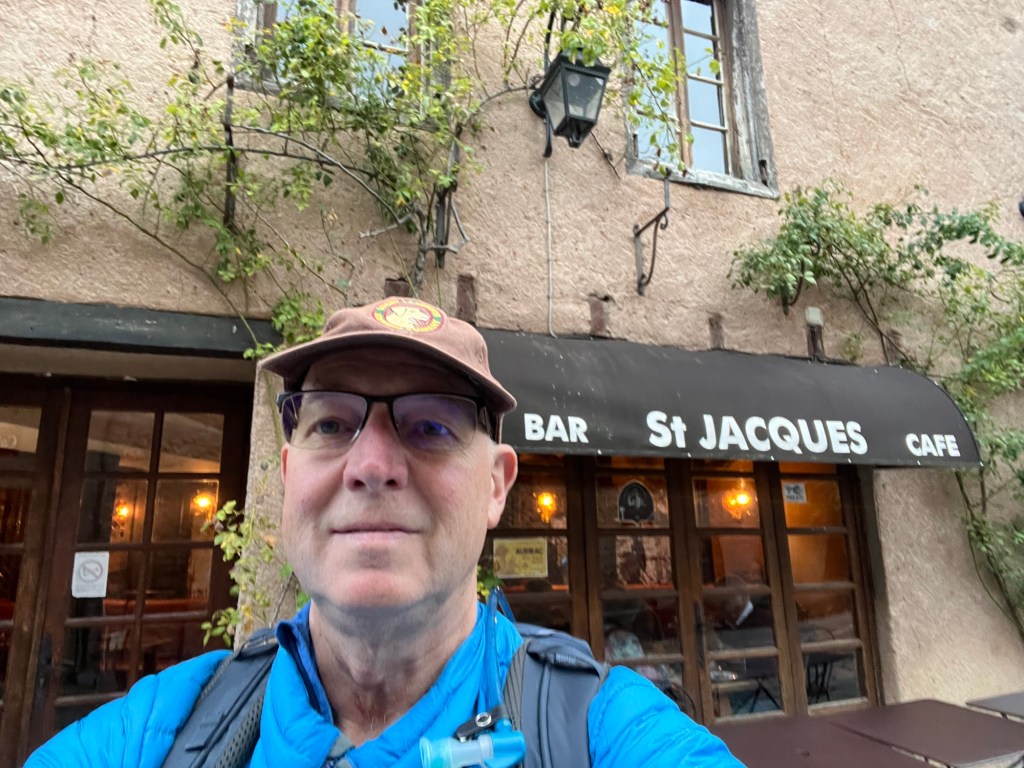 A pleasant evening in Conques, simple dinner provided, sausage and Aligot. Imagine mash potatoes and then mix in enough cheese that they are sticky, like 50/50 and that’s Aligot. After dinner over to the church for a pilgrim blessing, didn’t have the energy to stay for the lecture on the front piece again and the organ concert, but did get my first decent night of sleep since arriving. Up at 7:00am, sort of breakfast, since I can’t eat the pastries, it was a banana and some applesauce and then off on the way. Very steep downhill out of Conques, which is in kind of in a valley, then up the other side, also very steep slippery wet rocks. Weather was quite chilly but warmed up nicely and no rain, cleared up to outright sunny so that was a relief. A few hours in there was a place for coffee that also sold sausage and cheese so I was able to get some snack food. Conques had nothing available…Kept on pluggging but for some reason my right hip really started aching half way through the afternoon, not sure where that came from, but continued slowly and eventually made it my gite. Nice place, nice owner, but way at the bottom of town and my included dinner is way at the top of town. Ughh, just what you don’t want to do after walking 14+miles is walk another mile uphill to dinner. Oh well, at least there is dinner!