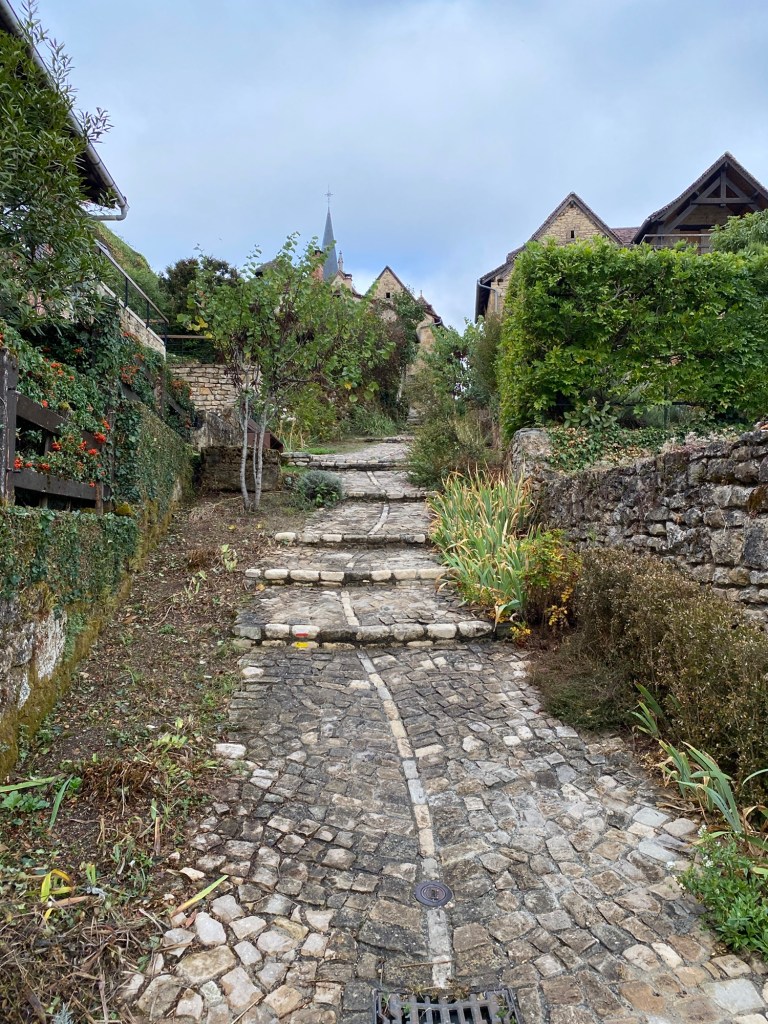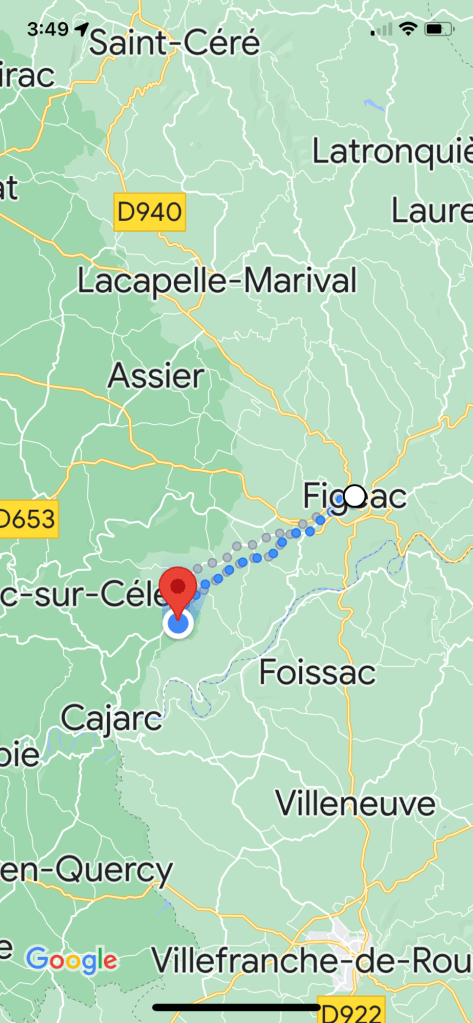 Figeac was a very nice town, and I was booked at quite a nice restaurant for dinner. Seafood mix and everything was fresh and perfectly cooked. Hotel was comfortable and got a good nights sleep. The hotel owner, Slyvie, went to the trouble of getting some GF rolls for me for breakfast so that was nice. Got started around 8:45am and what was supposed to be a fairly level day was anything but. After 20 minutes or so outside of Figeac there was a climb of about 1,000 ft, that definitely got me warmed up. Otherwise this rolling countryside is pleasant, but deceptively high energy to walk, you are always going up or going down, even if not huge climbs or descents. Ended up that the pre booked, Gite, Gite de La Fontaine and was assigned a lovely gypsy type caravan as my quarters. This place is really rural with nothing nearby. Owners seem to be former pilgrims themselves.