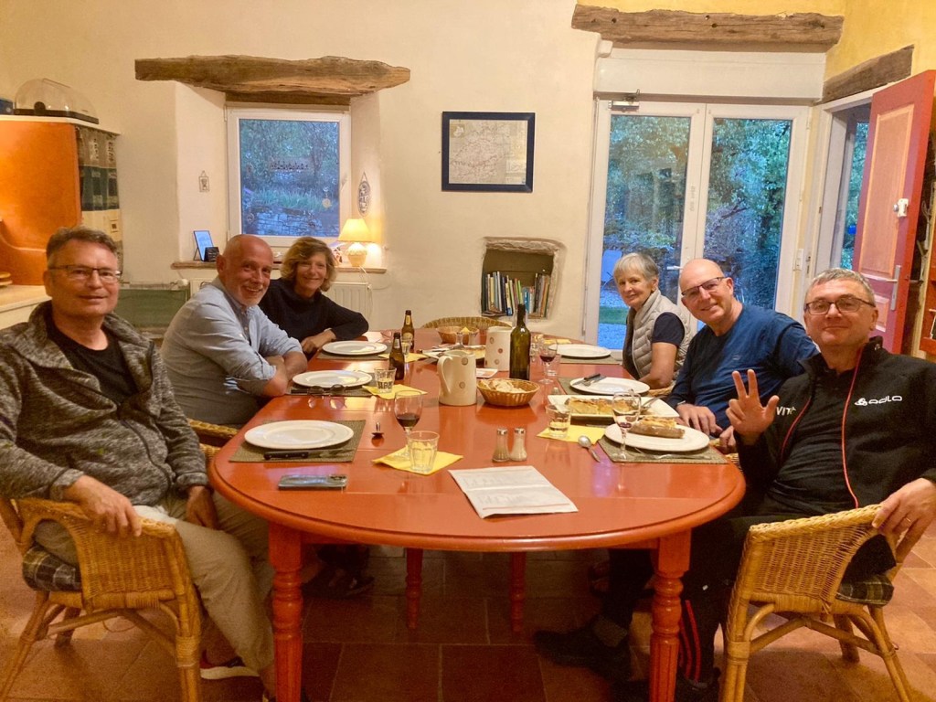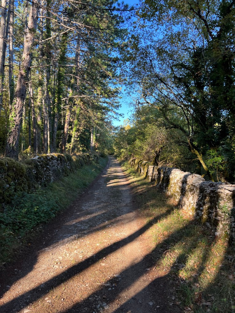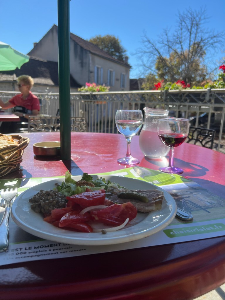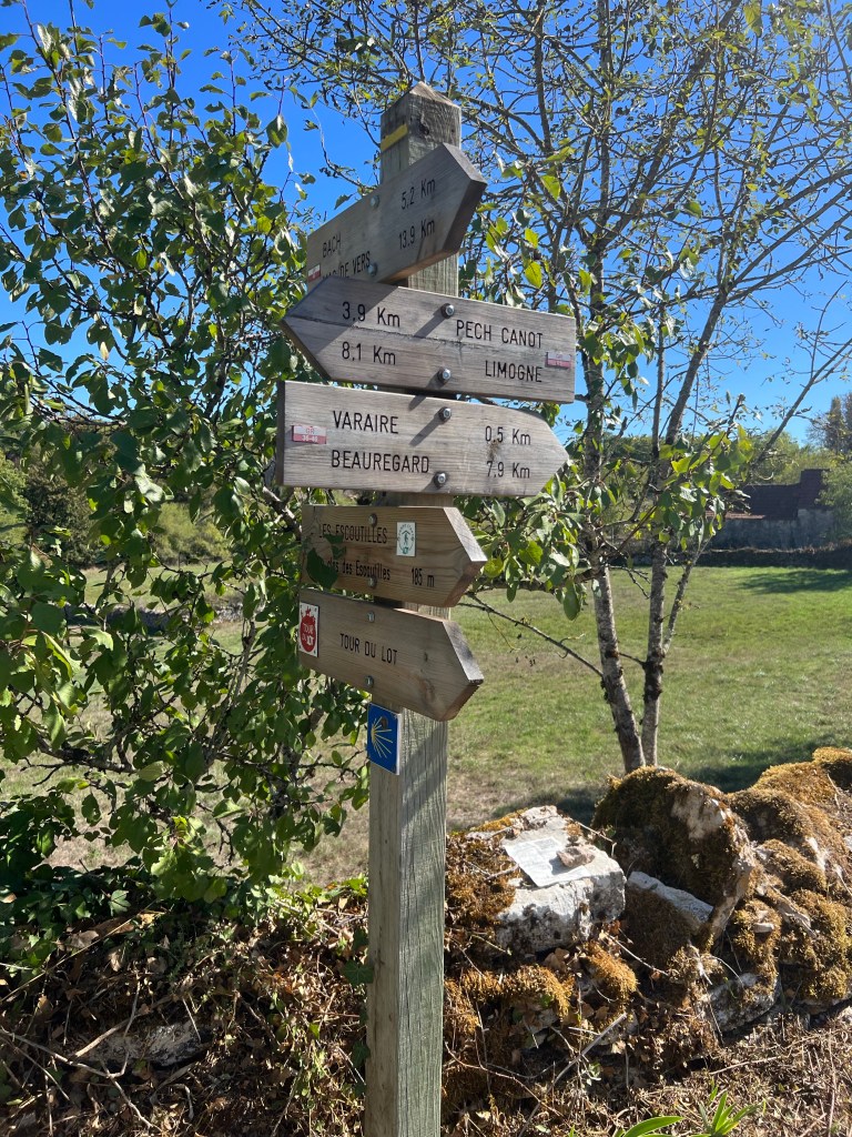 After the difficulty and extra walking involved in eating lunch yesterday, I’m pleased to report that dinner was good, the room comfortable and a pleasant stay over all at Gite La Hulotte. It is a long way from town so consider that if you are planning to stay there. Walked out with Manfred and Tomas, two German gentlemen who have been walking various camino routes for years. They are good company and experienced walkers. We stopped in Limogne for coffee about 45minutes in to the morning and then I picked up a stockpile of cheese and charcuterie to guard against further lack of food incidents. Walking was fairly easy and not terribly scenic today but not unpleasant. Eventually found a restaurant a mile or so short of my destination to have lunch. Another strange Frenchism….. only one menu of the day available, ok, I’ll have that, 4 courses for 15 euros yes please. Ordered, and waited, and waited and waited, eventually asked the waitress where my food was, since the restaurant had filled and everyone else was eating: “oh we don’t serve food on the terrace.” HUH??? And you didn’t think to tell me? What about the other person eating on the terrace? Oh well they are just having a salad so that doesn’t count…..HUH??? Eventually it was agreed that I could in fact eat on the terrace and food was then provided promptly, but honestly, no mention of this was made and I still don’t understand how anyone French or foreign would be expected to know this…. Arghh. It was a really good lunch, though. Another hour and half of walking brought me to a lovely Gite, Les Colombiers, in Bach, run by Belgians who are super hospitable. There is even a pool, and it was warm enough to have a quick dip, although they were replacing the light, so refilling pool and the water was cold! Looking forward to dinner since they are clearly into cooking, there’s a Paella fire ring and gas bottle sitting out!