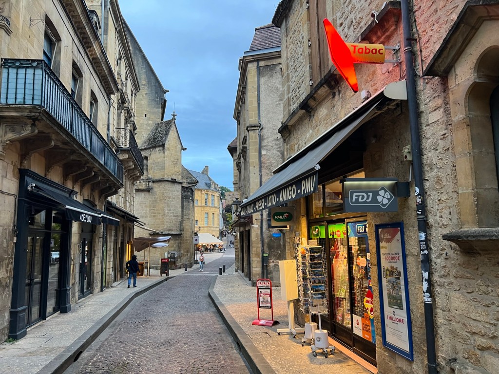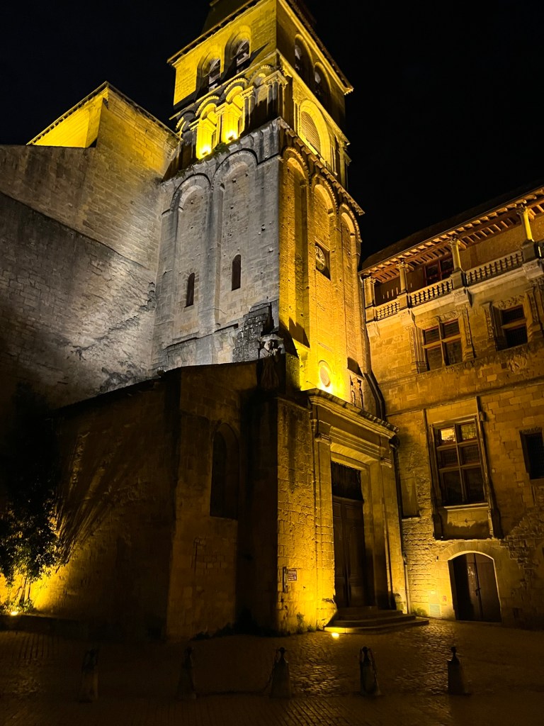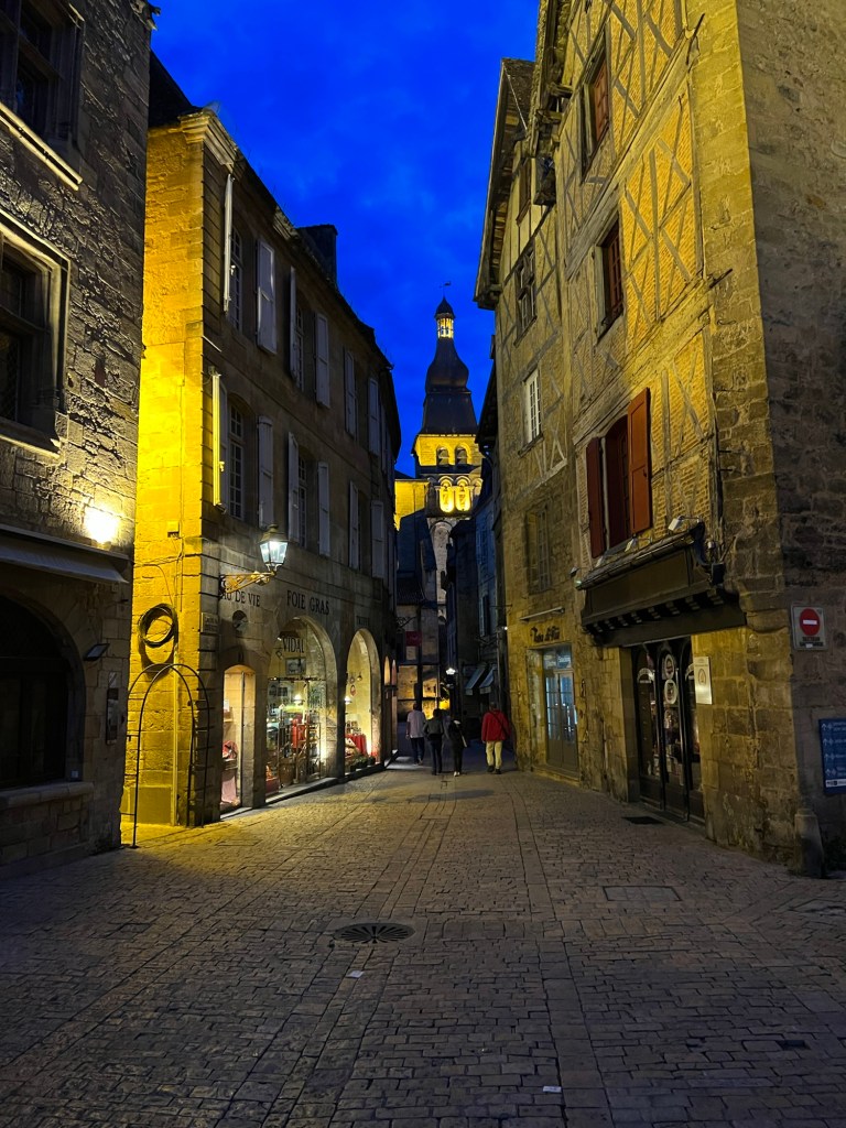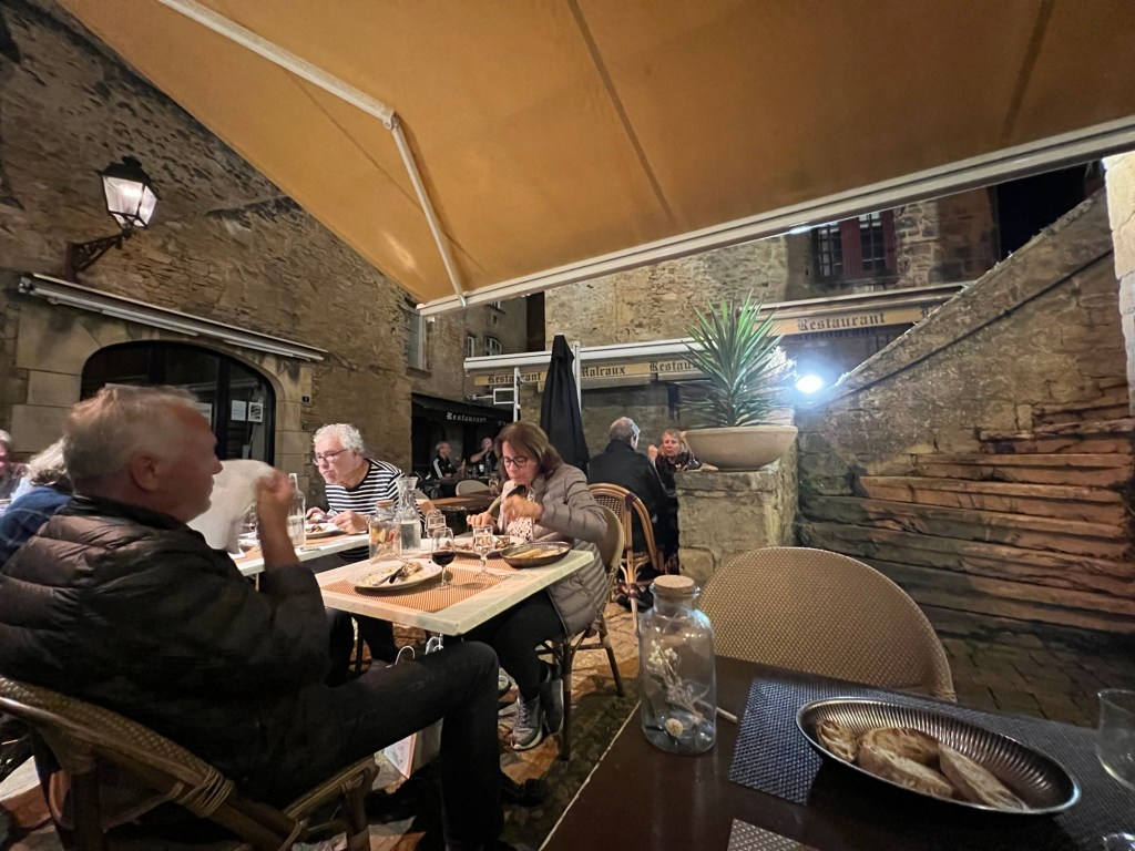 Had the morning to putter around Moissac, but not much going on. Then a train followed by a bus followed by another train to get to Sarlat. Luckily, the 50 minute break between train and bus allowed for a nice lunch in Agen, then, who knew you could drive a big bus that fast through the back roads. About 2;20 on the bus, then an hour wait at t tiny train station in the middle of nowhere. The switches were still manually operated! Eventually got to Sarlat, fairly long walk to the hotel Montaigne, recommended by Annie of Join Us In France. Nice hotel, well located. Off to dinner, foie gras and duck of course!