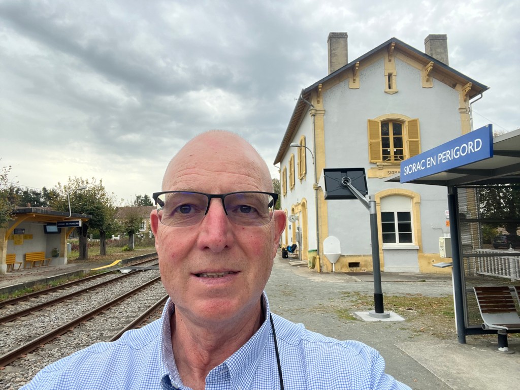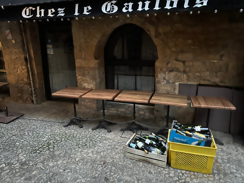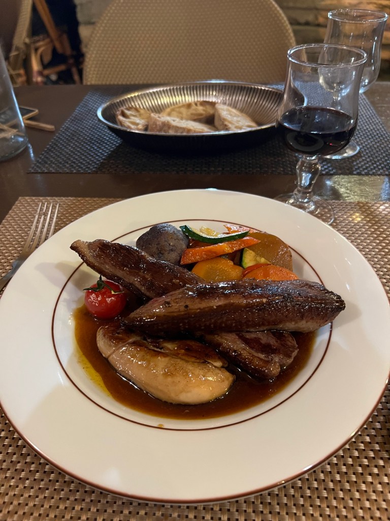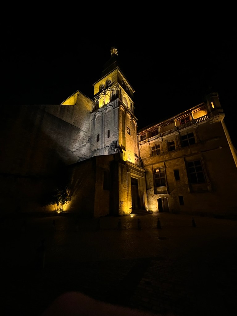 Had the morning to putter around Moissac, but not much going on. Then a train followed by a bus followed by another train to get to Sarlat. Luckily, the 50 minute break between train and bus allowed for a nice lunch in Agen, then, who knew you could drive a big bus that fast through the back roads. About 2;20 on the bus, then an hour wait at t tiny train station in the middle of nowhere. The switches were still manually operated! Eventually got to Sarlat, fairly long walk to the hotel Montaigne, recommended by Annie of Join Us In France. Nice hotel, well located. Off to dinner, foie gras and duck of course!