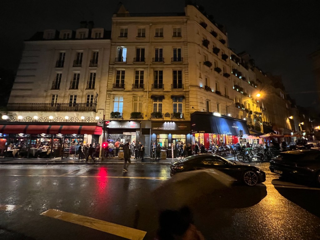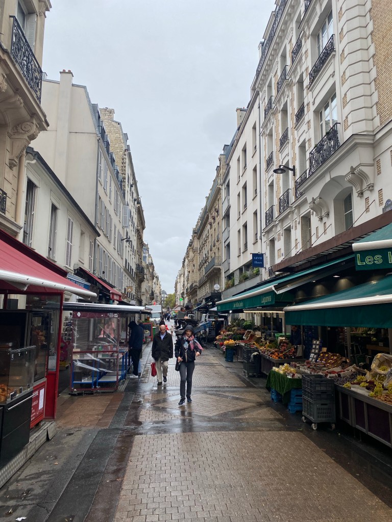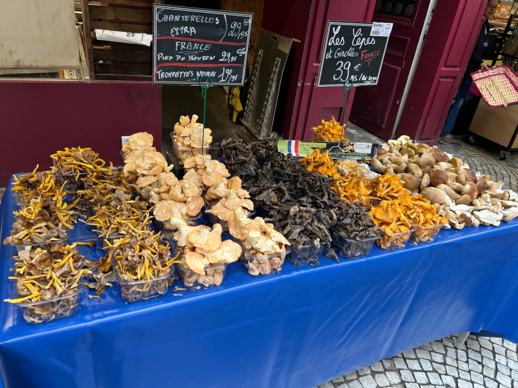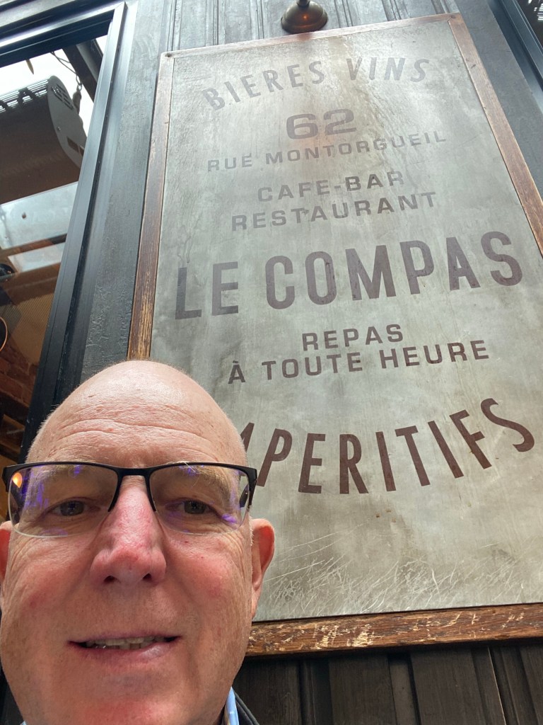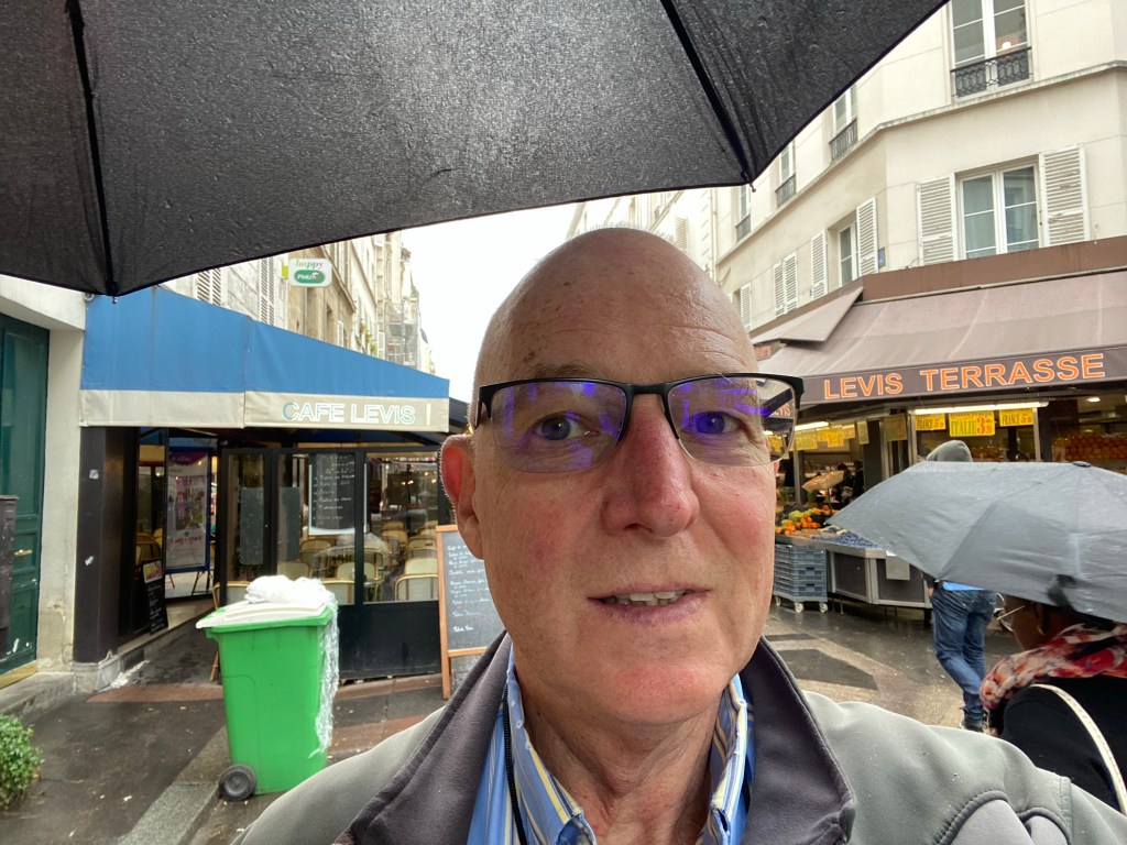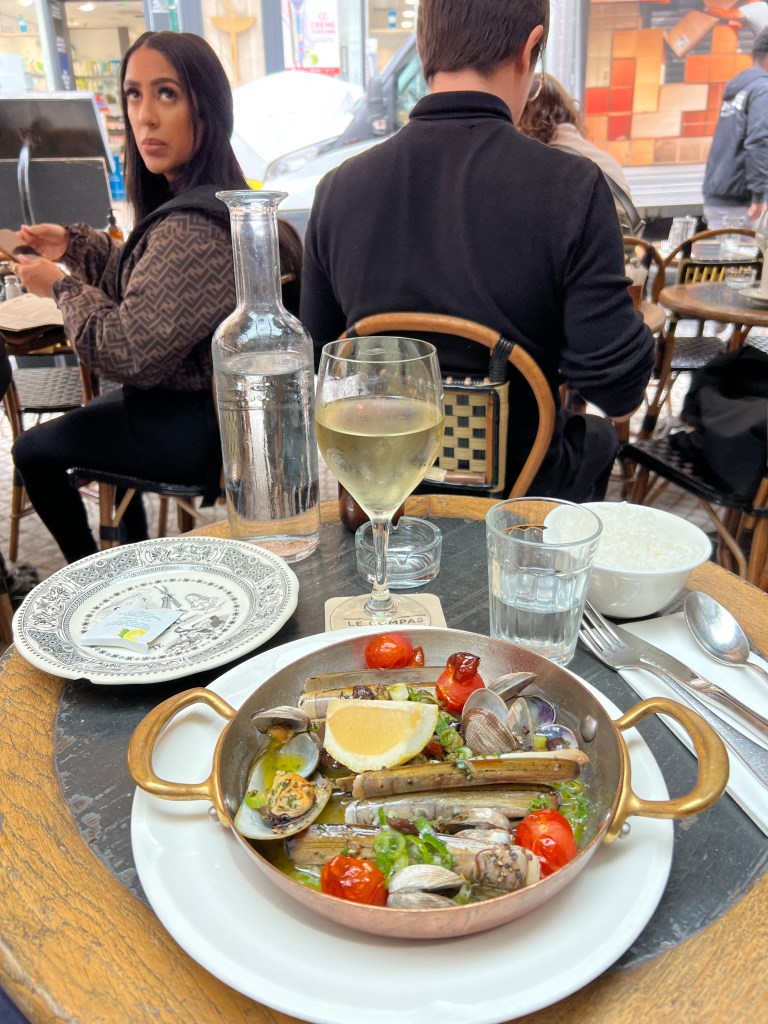 Started off with a coffee at my nearest good coffee shop, Le Peloton, run by New Zealanders. Then off to NoGlu for some GF croissants. Then it was off to the 17th arrondisment to explore the Market of Batignolles and Rue de Levis. This is a favorite street of one of the French facebook group leaders, Vero, who is also a Rick Steves guide. Weather here is off and on rain, not particularly hard, but enough to need an umbrella. Fortunately, mid 60s temperatures are relatively comfortable. Unfortunately, they are remodeling the commercial space below my apartment and so they are drilling concrete most of the time during the day, not very relaxing. For lunch, I headed to Rue de Montorgueil one of the great pedestrian restaurant streets in the center of Paris. One of my favorite terraces is a place called Le Compas and they had a wonderful shell fish and rice meal, perfect with a glass of Sancerre. After that, tried to track down a Melita filter cone for making coffee, eventually found a ceramic Japanese made one at BHV and am giving it a test drive, also found real heavy cream, which makes all the difference. For the evening, hopped the bus over to Deux Magots and then some risotto at Les Editeurs.