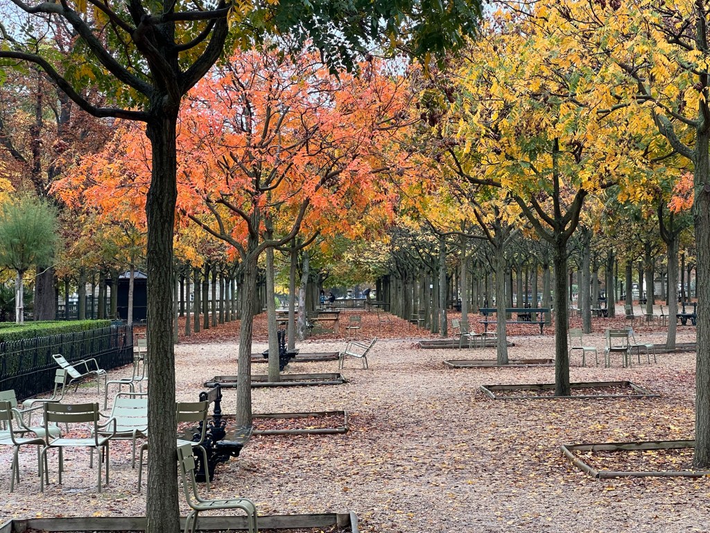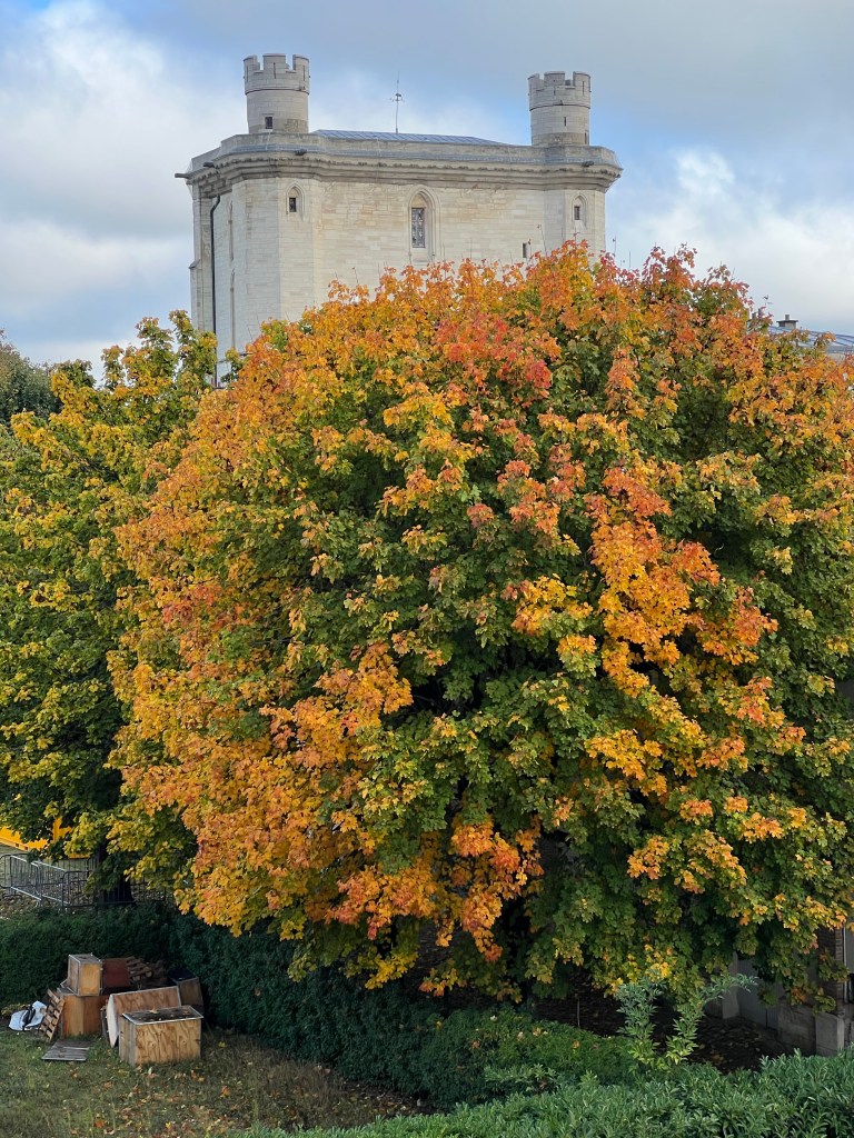Tuesday the 18th was yet another strike day, but fortunately the Metro line 1, the nearest to the apartment is fully automated and reasonable immune to strikes. About 20 minutes east to Vincennes, a village just outside with peripherique with a large forest and a well preserved Chateau/Donjon. After visiting the Chateau, lots of stairs and empty stone rooms, it was off to the local outdoor market and then coffee and lunch at a sidewalk cafe. My friend Emi, who lives in Vincennes and I met on the Camino came to join us. A walk around in the Parc Floral and then back to St. Paul via Metro.