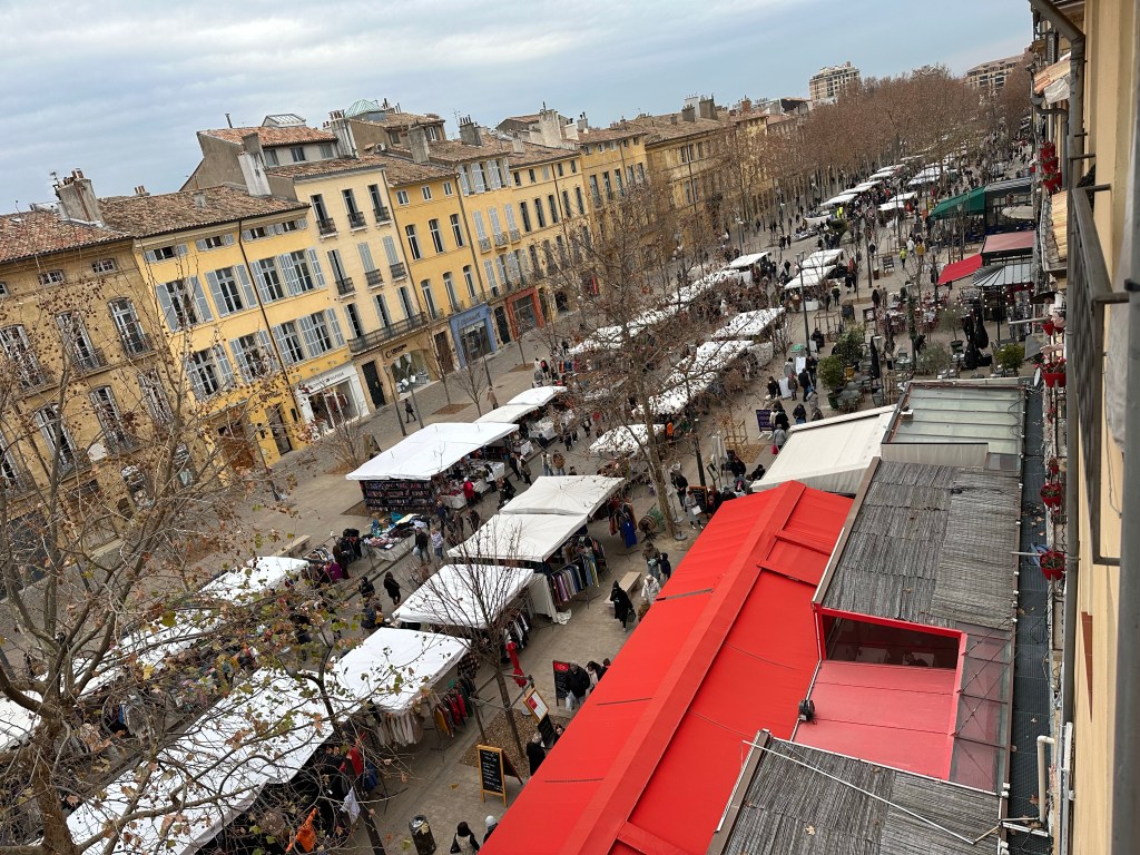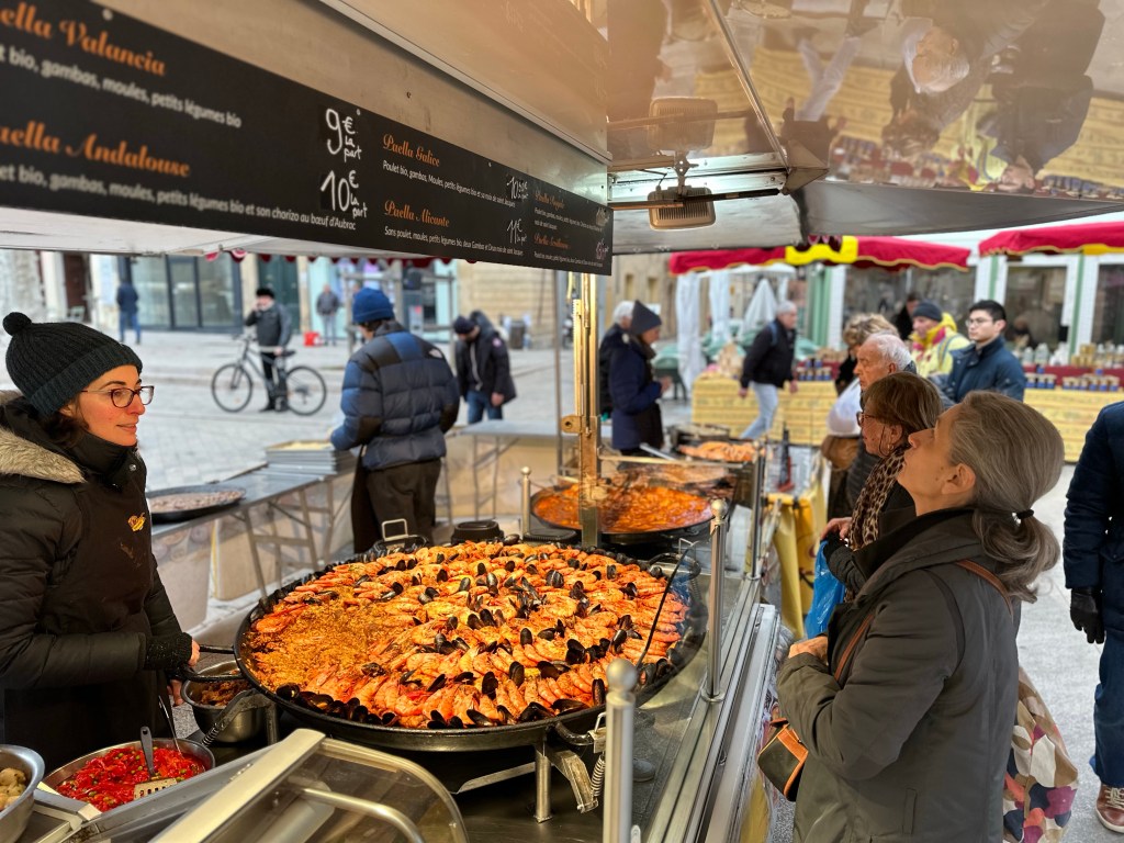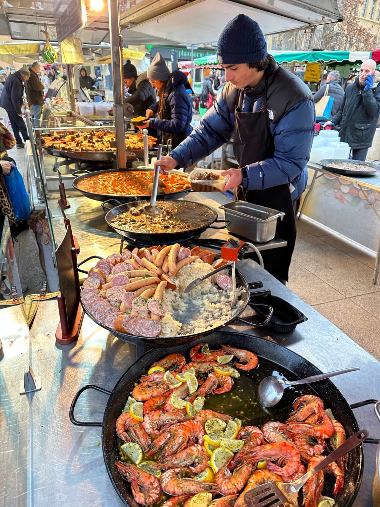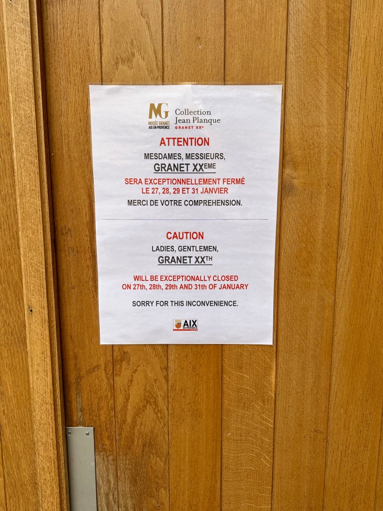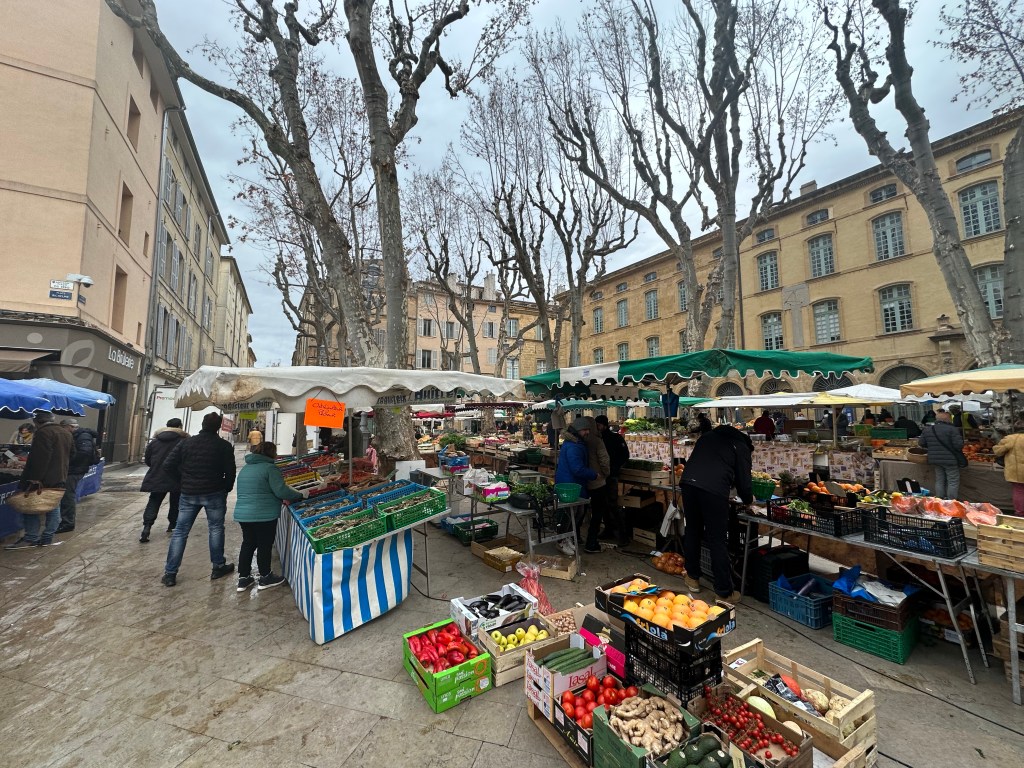 When I woke up this morning and opened the curtains, the Main Street below my apartment had been set up with tents to be the Saturday market. As I went out for coffee and a to walk around, it turns out that almost the whole inner, old town, part of the city becomes a market on Saturday. There is a produce section in one square, premade food in another square and then the main drag had mainly clothing and related articles for sale. It was once again a cold morning but warmed up to a sunny comfortable mid 40s shortly after noon. I headed over to the main museum in town, the Musee Granet, which was supposed to have a Cezanne collection and also was featuring a just opened Hockney exhibit. Actually turned out not to have much in the way of Cezanne, but the Hockney exhibit on loan from the Tate was quite extensive. Then, in a uniquely French moment, the admission came with a second ticket to an additional exhibit quite a few blocks away. After walking over there, it turned out that his exhibit was closed today…. Oh well. Had lunch on a very mediocre undercooked buckwheat crepe, nothing like the most excellent ones found at the Bastille market that are cooked on both sides with lots of butter.