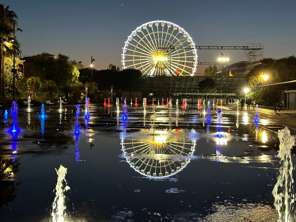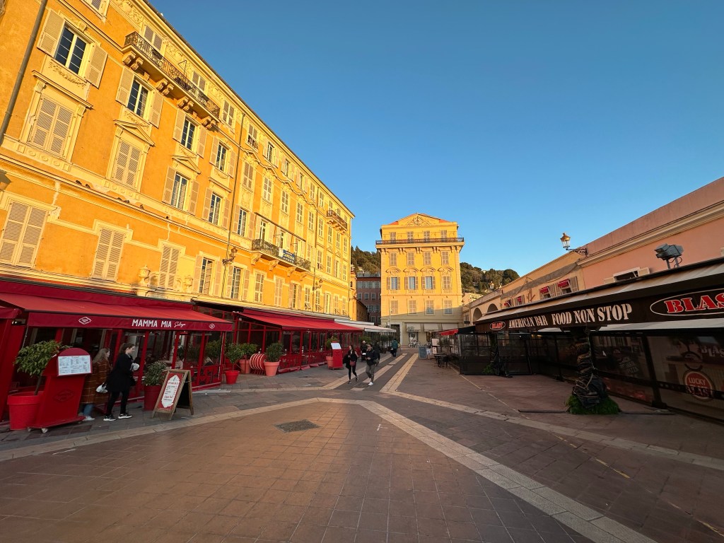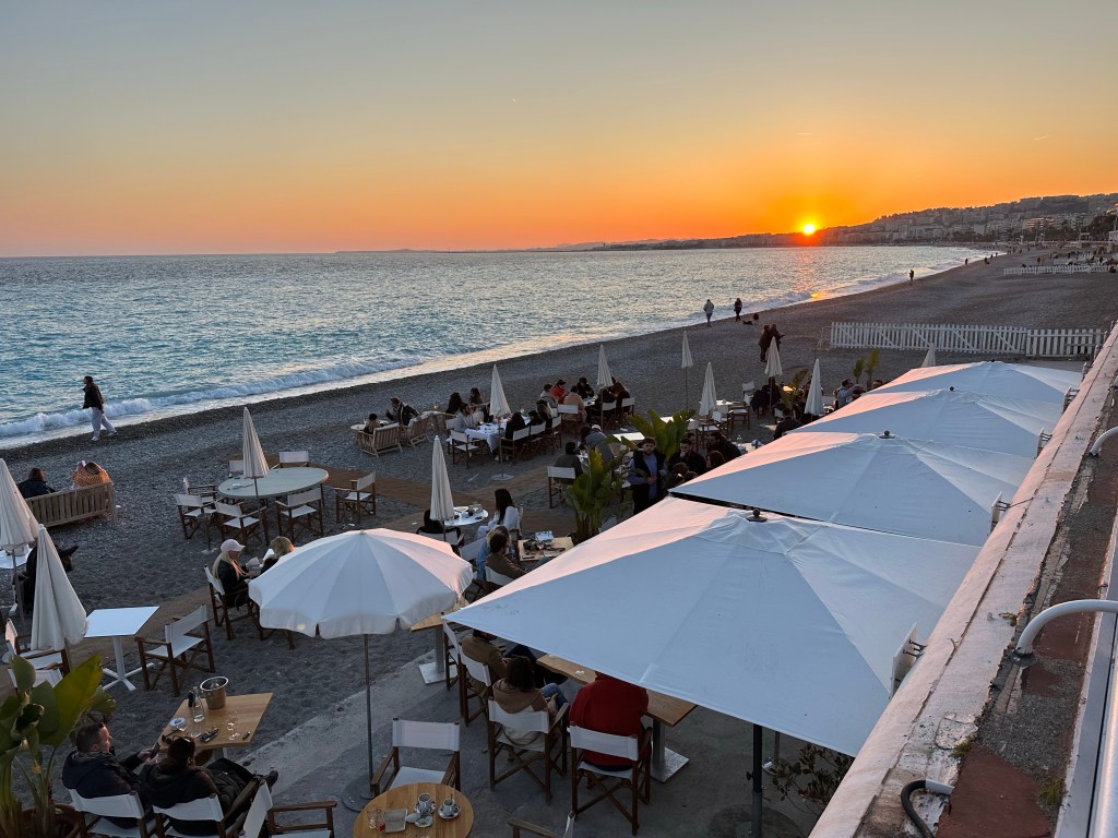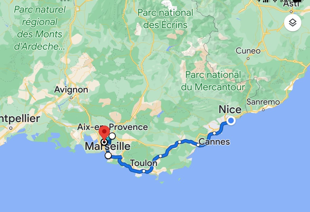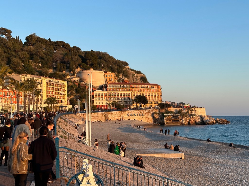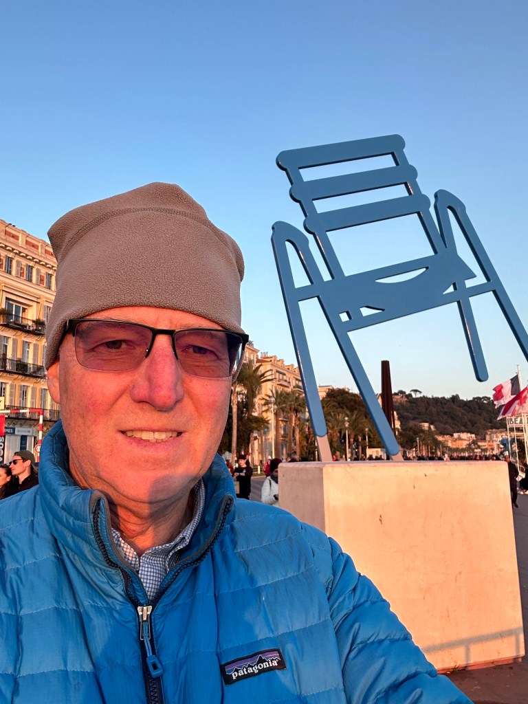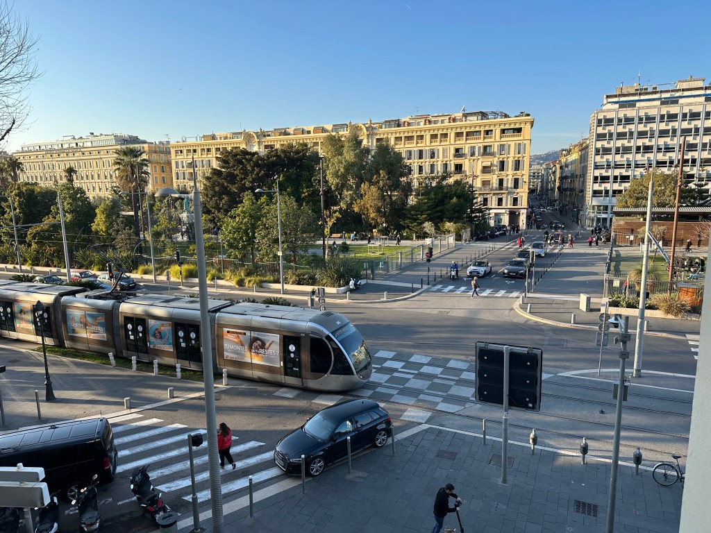Started today with a good clean up for my Aix AirBnb, that turned out to be a really nice place. A large studio, but a comfortable corner unit. It was still quite cold this morning when I stepped out for a coffee, and after walked over to the Gare Routiere, the bus station to take the 40 bus to the TGV station. That worked as advertised and after a bit of a wait onto the Ouigo TGV to Nice, about 2.5hrs. Ouigo is SNCFs discount train option, but I really don’t notice much difference. Today the train was not crowded, so just took a 4 person club seat and had things to myself in that regard. Easy trip with only a couple brief stops, then onto the Tram in Nice, a week long pass that covers all the trams and buses in most of the riviera is 15 euros! Met at Airbnb, and apartment looks fine, and very well located immediately across from a restaurant I’ve been to before and liked. After having a quick bite of the local specialty, Socca, a chickpea flour pancake, off to Monoprix for a few breakfast items and then out for a walk. Seemed pleasantly warm this afternoon with temps in the 50s, but cooling off rapidly now. Off to dinner shortly with Richelle from one of my French groups who has just moved to Nice and Jin and Neil former Seattleites who live here.