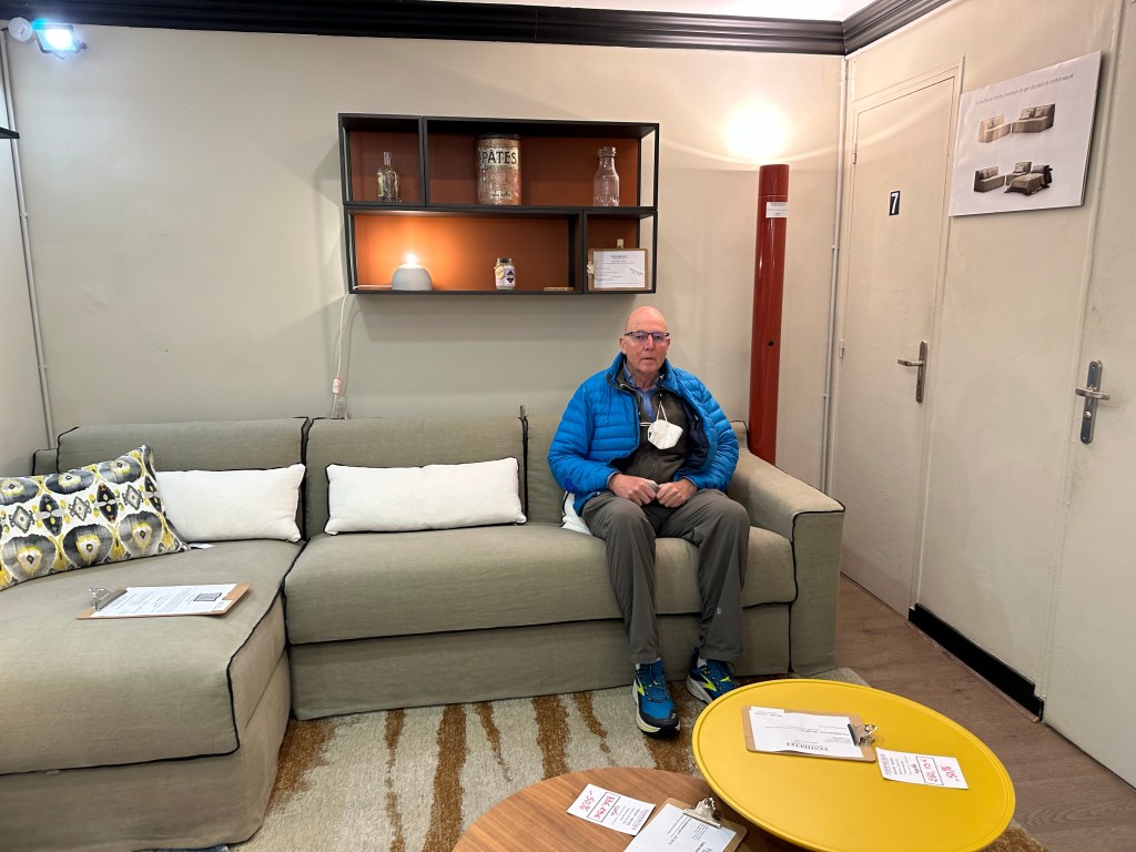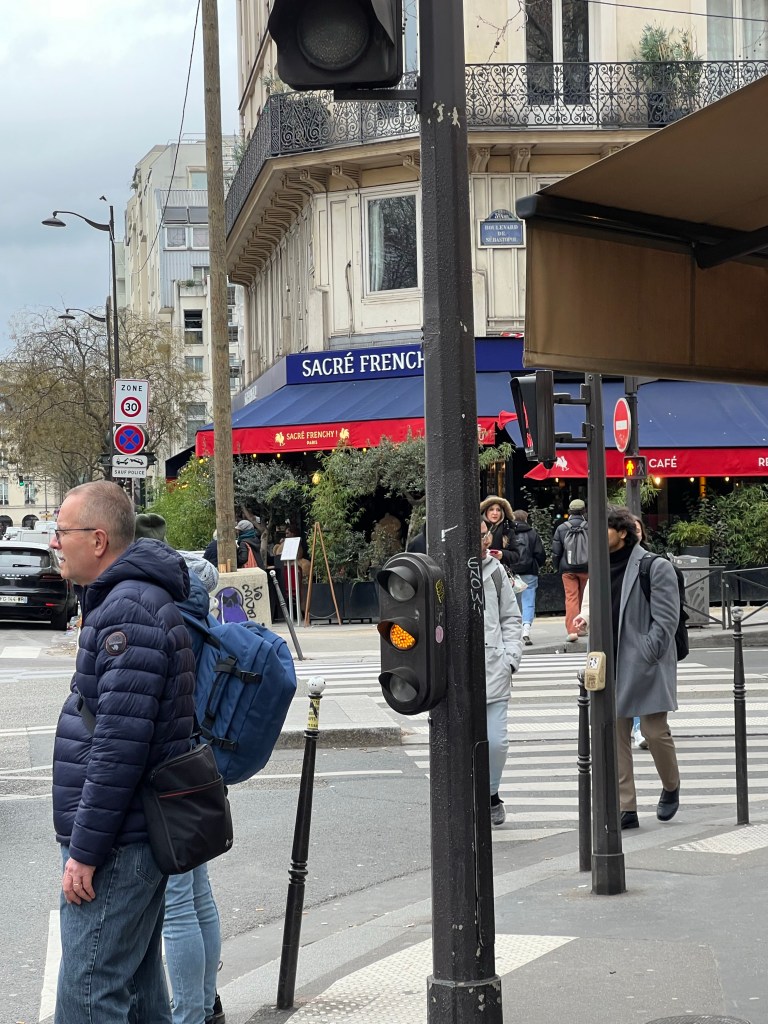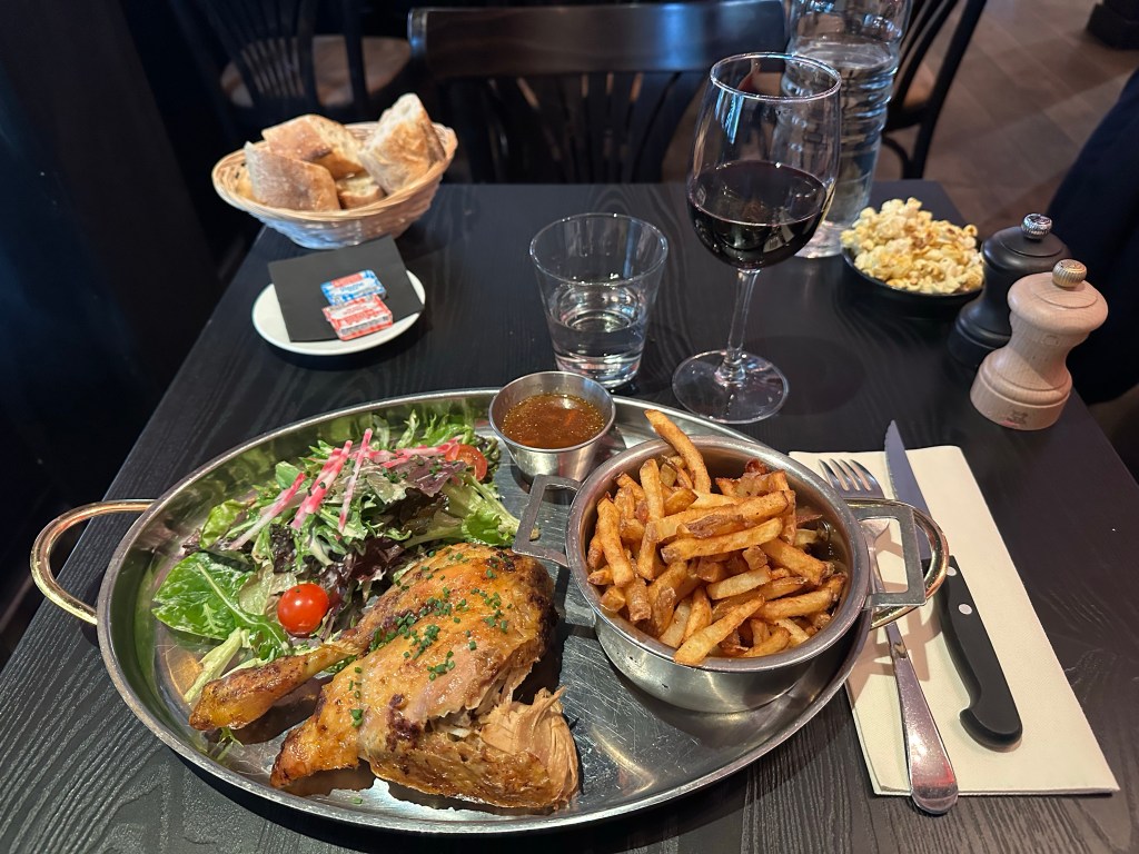 Today was an overcast chilly day and ended up being largely devoted to housekeeping. Started with stop in at Le Peloton for coffee and a hello to the lads. Then off to BHV for some white duct tape, returned to tape up the vent in the bedroom which was admitting cold air and noise at a prodigious rate. After that it was off to look at a potential couch for replacement of the existing one. While all 13 of us owners don’t always agree we unanimously hate the existing orange couch, which gives the sensation of the cushions slipping off the front, even though they are not. After a pleasant lunch of roast chicken, frites and a salad at Sacre Frenchy, returned to the apartment to await one of Adrian’s maintenance people to help with the heaters. He eventually showed up but was not able to help in anyway, although he did print out an owners manual of sorts in French. We attempted step one, setting the clock and didn’t succeed. At this point, they are all in some kind of manual mode and staying on temp setting so that is fine. He did seem absolutely baffled as to why anyone would want their heater to stay at the temperature they set, and I was absolutely baffled as to why he would think that we would want the heaters to follow some random program that none of us understood or set. We eventually had to agree to disagree on that one. In any case, I was able to have a good nights sleep with the cold air blocked off and the noise reduced and the bedroom heater keeping things around 64f it was good. I did add some foam insulation to the exterior cut out on the window this morning for even more noise abatement. Dinner was at Breizh Odeon with a pastrami crepe.