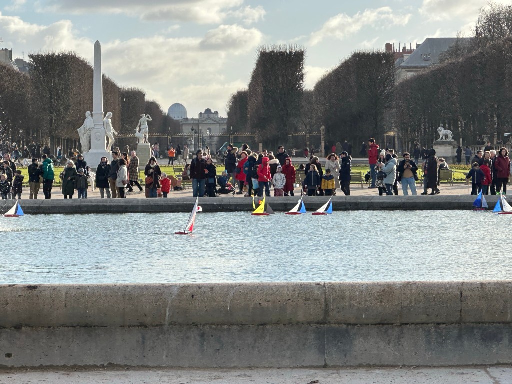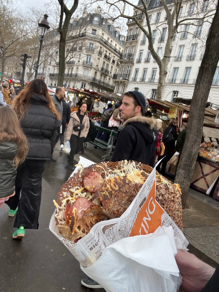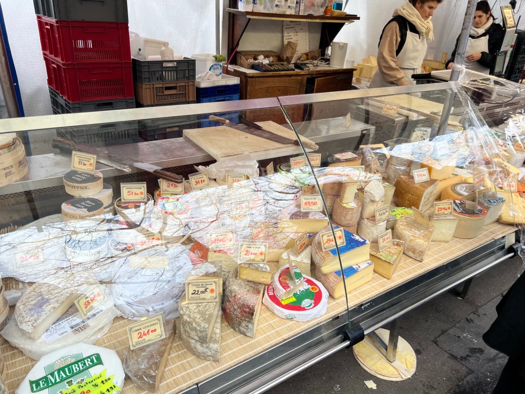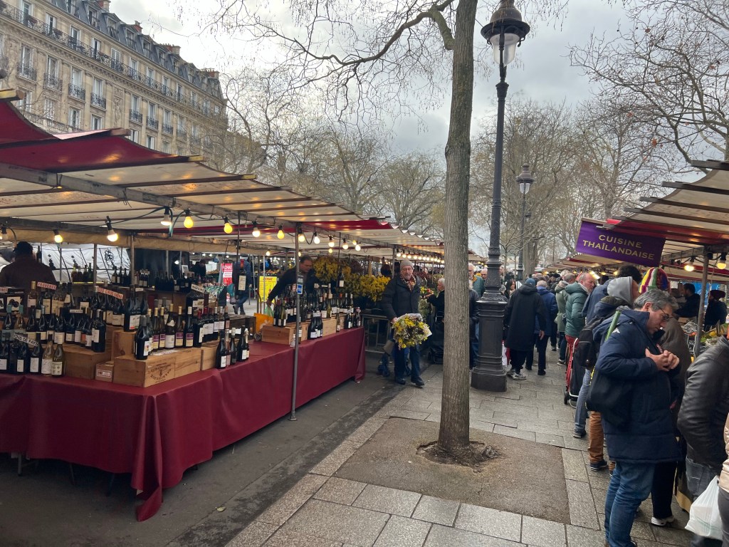 Off to the traditional Sunday Bastille market today, one of the bigger open markets in Paris and conveniently only one metro stop away or a 15 minute walk. One of the best crepes I’ve had comes from the Breton booth there, and even though my stomach has been out of sorts for a few days I decided that I should have one. Sausage, cheese and a little mustard….yum! Continued on to John R. Favorite wine purveyor and sure enough he was there as well. After that, headed rapidly home for a quick pit stop and then over to the Tuileries for a stroll followed by the Luxembourg gardens and a cup of tea at Deux Magots.