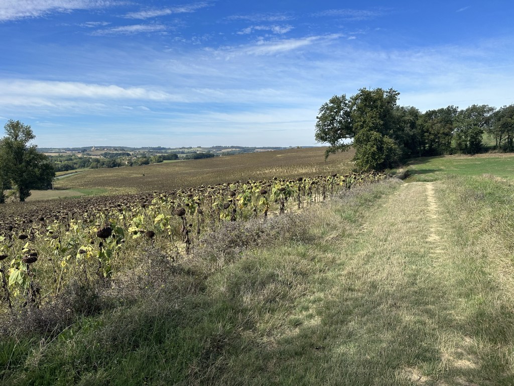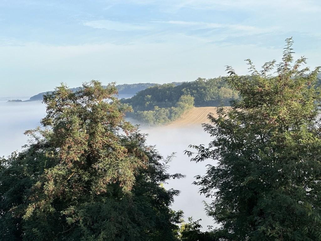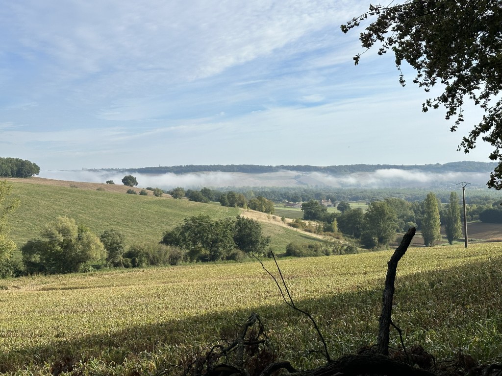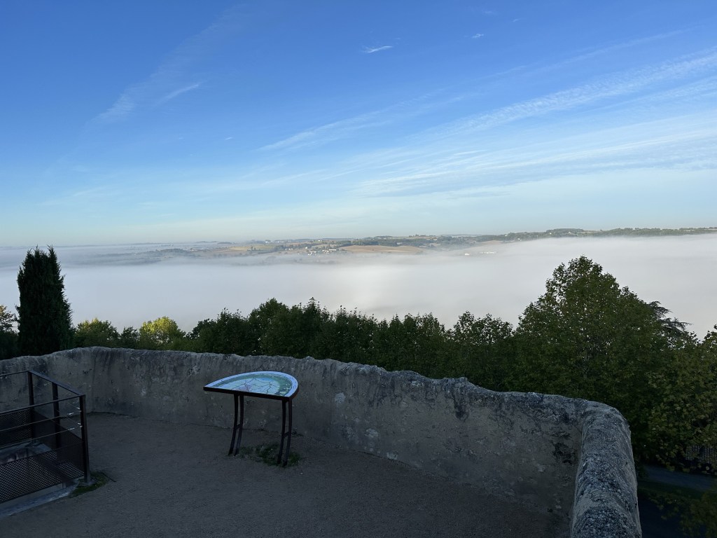 Found a coffee on the way out of town and then what seemed like a fairly long 17km to the days destination. Lovely fog below the city, then hiking through farm fields. Eventually after an hour, an actual cafe with coffee etc! What a treat. Encountered some French ladies and we walked a bit together. But I continued at my slow pace ahead of them, only to rendezvous for a drink at the plaza in town after I had checked into my BnB. Turns out one is a tango dancer, game on…. It got very hot today, but fortunately arrived in town just after 2:00pm ready to have a shower and call it day. This particular Gite, Cle des Champs, has put me and other guests at the very top of the house with lots of beams. The only place I can stand upright in my room is under the skylight. I predict that I will locate a few of the beams during the night!