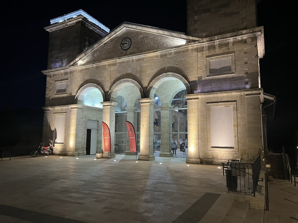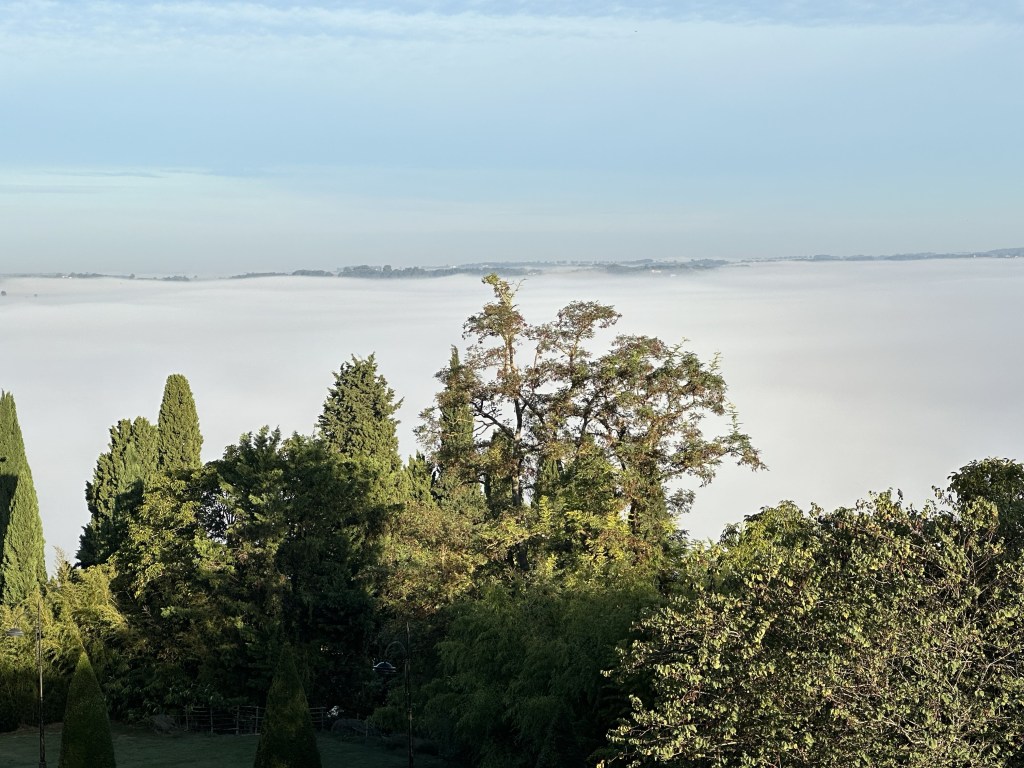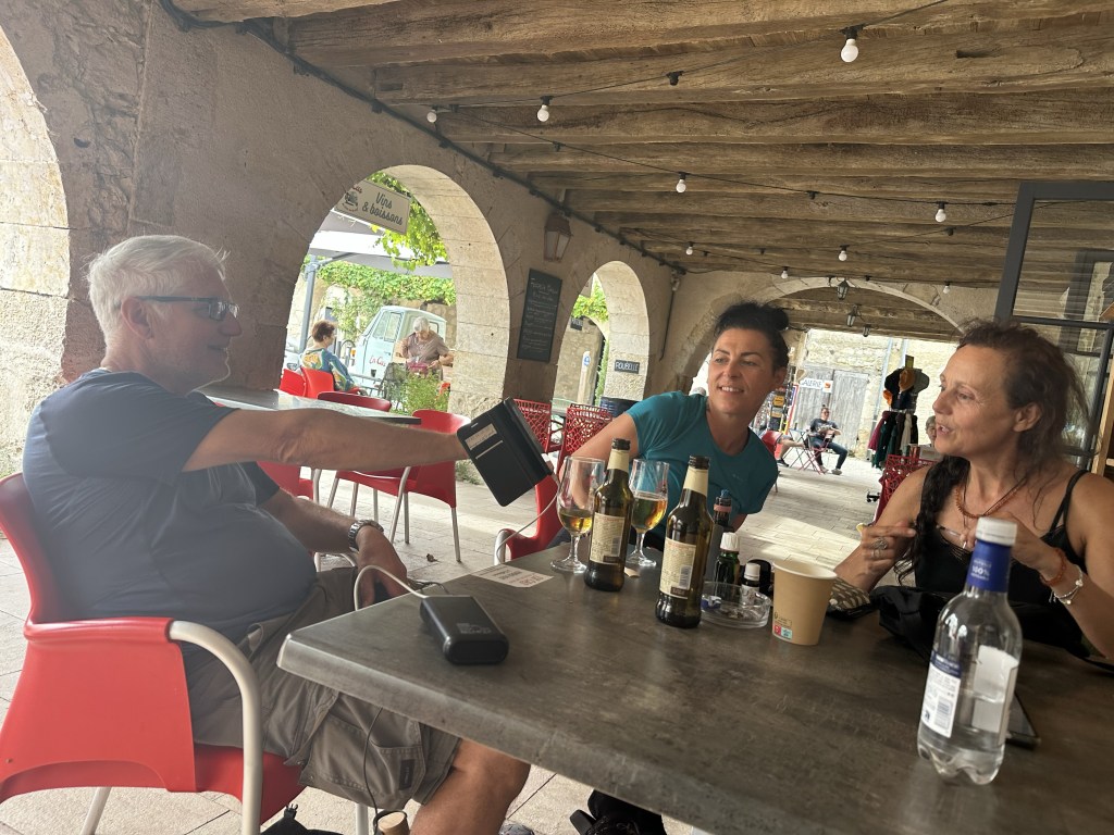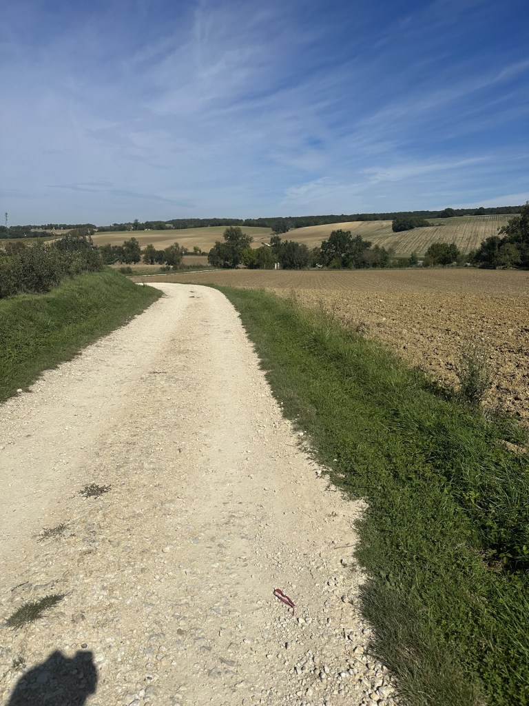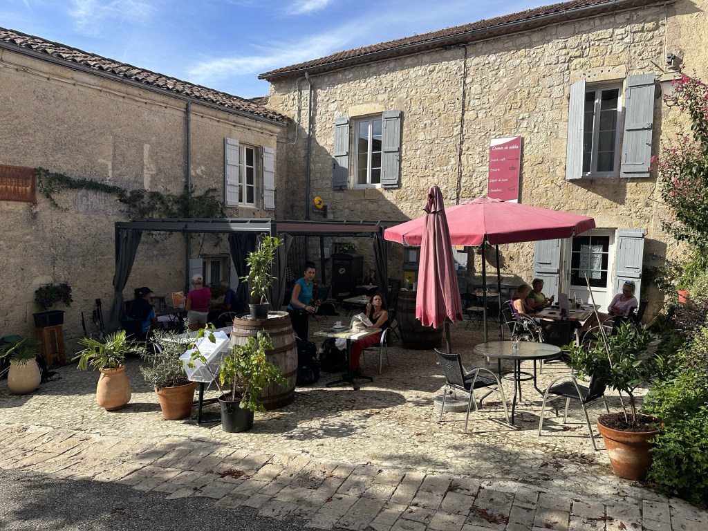 Found a coffee on the way out of town and then what seemed like a fairly long 17km to the days destination. Lovely fog below the city, then hiking through farm fields. Eventually after an hour, an actual cafe with coffee etc! What a treat. Encountered some French ladies and we walked a bit together. But I continued at my slow pace ahead of them, only to rendezvous for a drink at the plaza in town after I had checked into my BnB. Turns out one is a tango dancer, game on…. It got very hot today, but fortunately arrived in town just after 2:00pm ready to have a shower and call it day. This particular Gite, Cle des Champs, has put me and other guests at the very top of the house with lots of beams. The only place I can stand upright in my room is under the skylight. I predict that I will locate a few of the beams during the night!