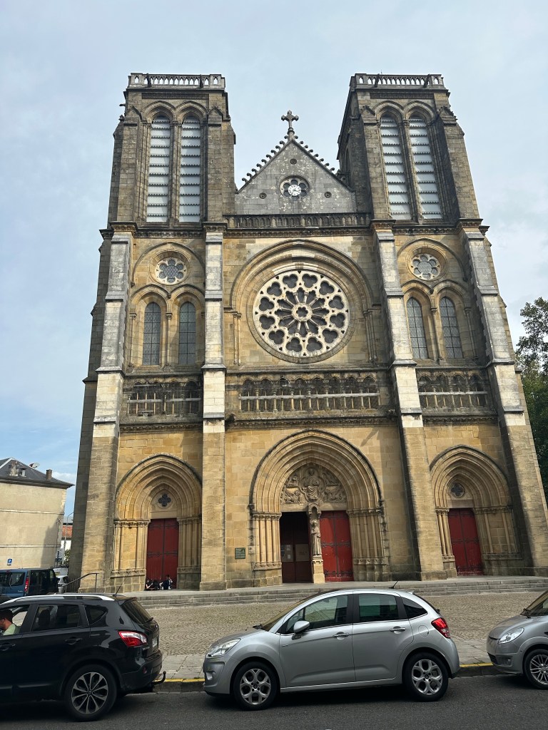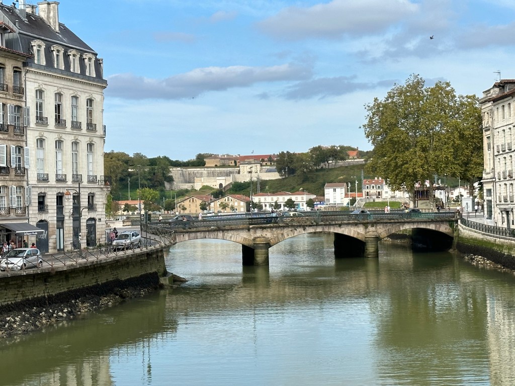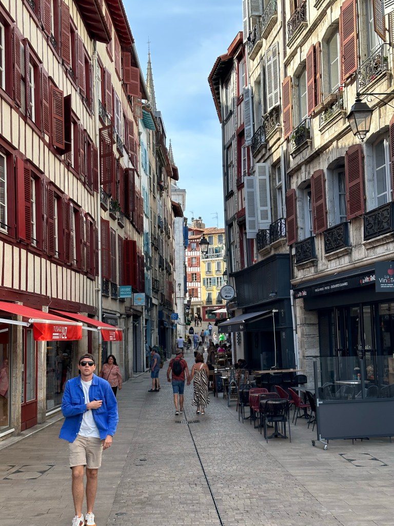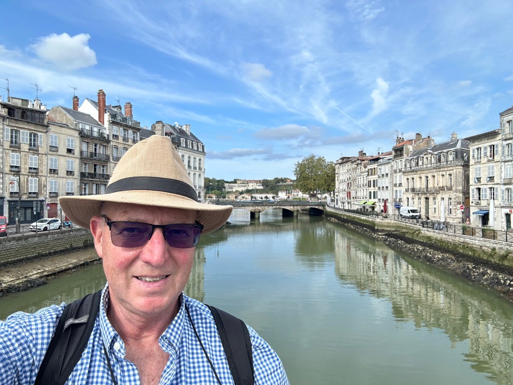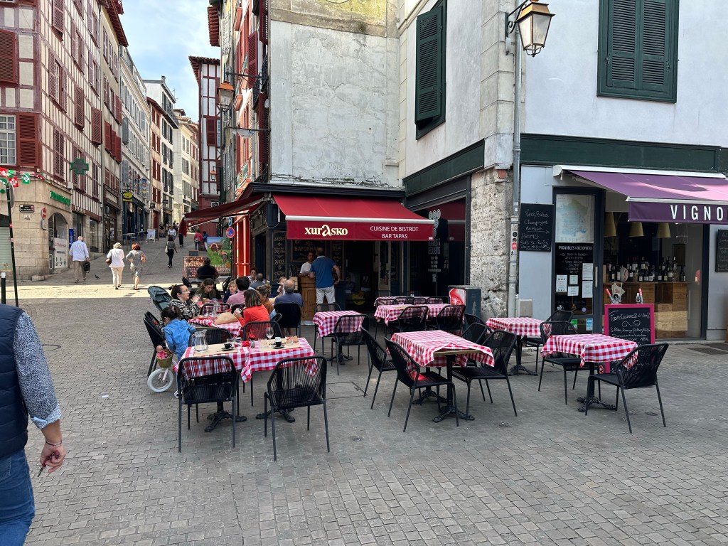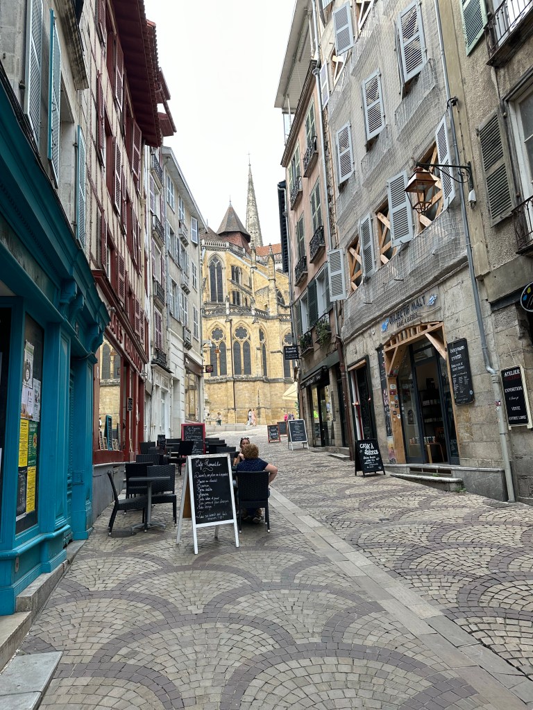One thing that is really great in France is that you can get almost anywhere cheaply and using transit if you work at it a little. In this case a bus, 2 euros, from just a few yards away from my hotel came right on time at 8:13am delivering me to the nearest train station at Mont de Marsan about 40 minutes later. The train wasn’t until 10:46am so off to find a cafe, a short hike away. Then luckily my first train was on time, but the second was slightly delayed. No matter, by 12:40pm arrived in Bayonne and a 10 minute walk from the station took me to the IBIS Centre. Very generic but fine, although when I went in search of lunch I found that I have really booked myself in the wrong area of town. Because of the multiple rivers, it is a hike to the center and the action. Bayonne has free Navettes and lots of transit, but I found another hotel from the same ACCOR chain that is right in the center, and a Mercure, and was able to shorten my stay at the IBIS and transition to the Mercure tomorrow. This is the kind of city I immediately like with lots of sidewalk plazas, lots of outdoor cafes, little alleys and just a lot going on. I walked around a bit, had a mediocre lunch and then hopped in one of the free Navette for a ride around to get oriented. Found the covered market, which I will check out tomorrow and a number of churches etc. There is frequent, as in every 20 minutes, bus service to Biarritz, 30minutes, so I think I will go there for lunch on Friday. While it is nice to not have to walk with 20 lb pack 4-5hours a day, plenty of walking is still going on. Currently sitting at a cafe near the Mairie at the nexus of the 3 bridges and watching all kinds of traffic and people go by. This is the main connection point for people heading up to Saint Jean Pied de Port to start the Camino Frances across Spain. I have been through before but didn’t stay and therefore have not explored the town.
