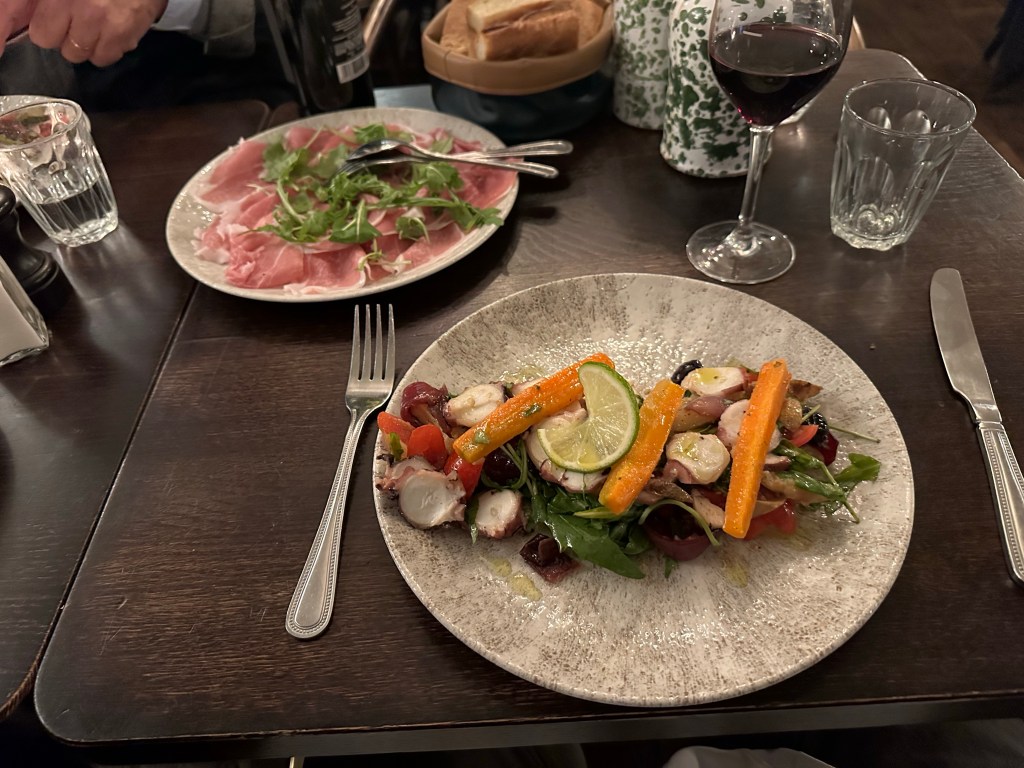 Got out the door early and using my Carte Blanche membership was able to walk into the Orangerie right at 9:00am. Visiting Modigliani exhibit to terribly interesting as it was focused on his patron. Water Lillys always nice. Walked around the Madeline etc. and ended up at Le Grand Colbert for lunch. Hadn’t been there before but it was in a Jack Nicholson movie. Excellent lunch of Skate wing. Then off to try to go to the top of Arc de Triomphe. Had bought online ticket around 10:30am and when I got there after lunch they were closed because they were on strike. Email did produce a response that suggested if I couldn’t go at a later date I could file all kinds of paperwork for a refund. Then, they said that the ticket was only good for the date issued and could not be changed…. We will see. Wonderful dinner with friends CC and his friend R. I stopped and got some interesting cheeses from my neighborhood Frommager and then we went to an Italian place in the 6th and just had a lovely octopus salad.