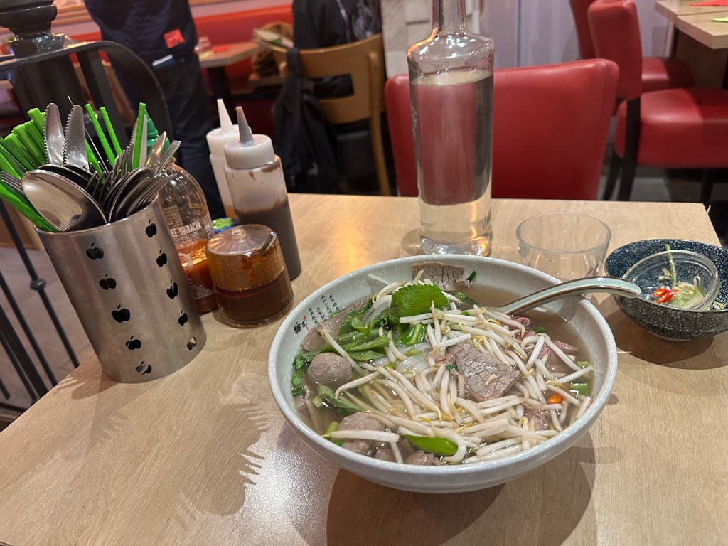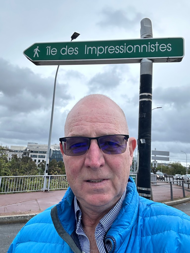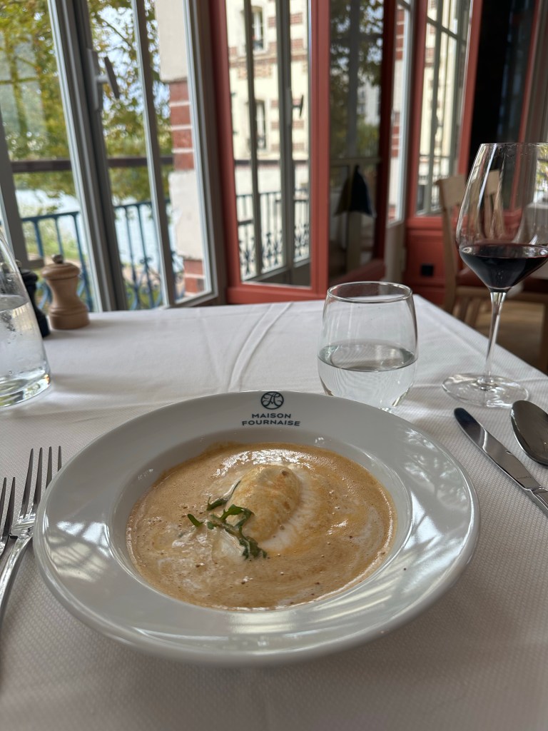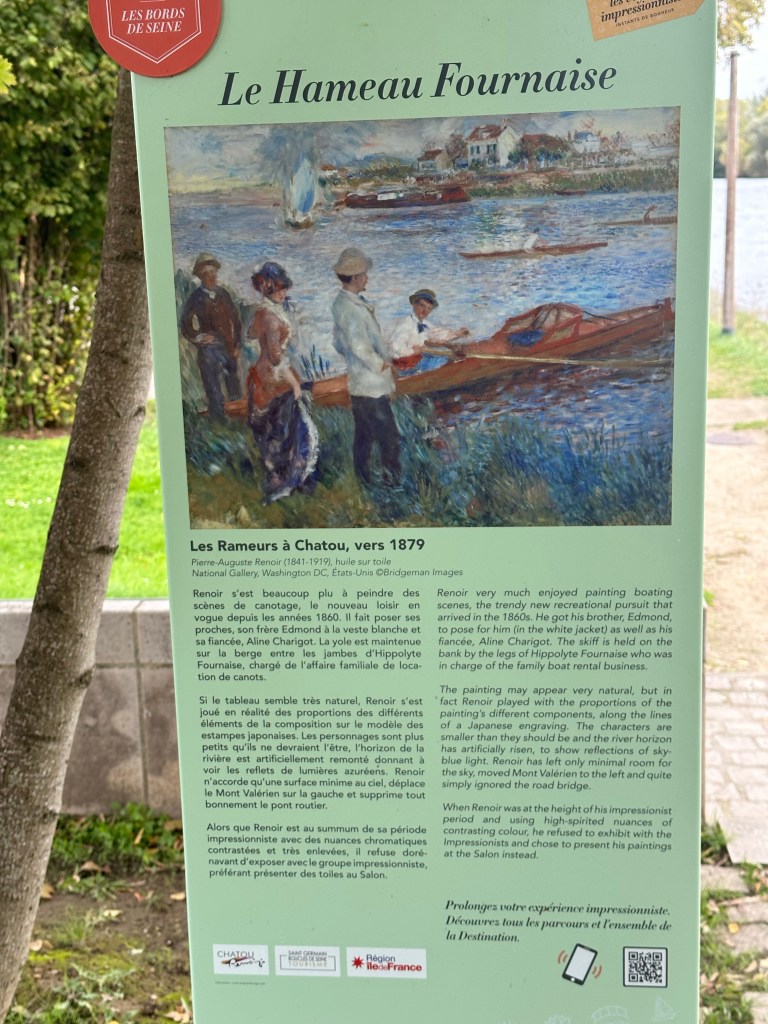 Started the day meeting up with David and Colleen for coffee, then they were off back to Seattle. I decided to do a field trip and took the RER A out to the Ile des Impressioniste. This was where Renoir did many paintings. It was windy and rainy, I chased my hat across a bridge and 4 lanes of traffic, and amazingly nobody ran it over, so it, a little worse for wear, I got it back. Walked around a little and ended up at the classic Maison Fournaise, with a lovely Lobster Bisque followed by a mushroom risotto. With rainy and very windy weather, I headed to the Bastille and found a nearby place on Rue de Lappe for Pho. Then back to Le Bucheron, my local where I get a warm reception. I bought a nice bottle of Gigondas from a local wine shop and you would have thought it was Christmas. This was shared with the owner and his mother and two other friends. All in all a fine low key evening.