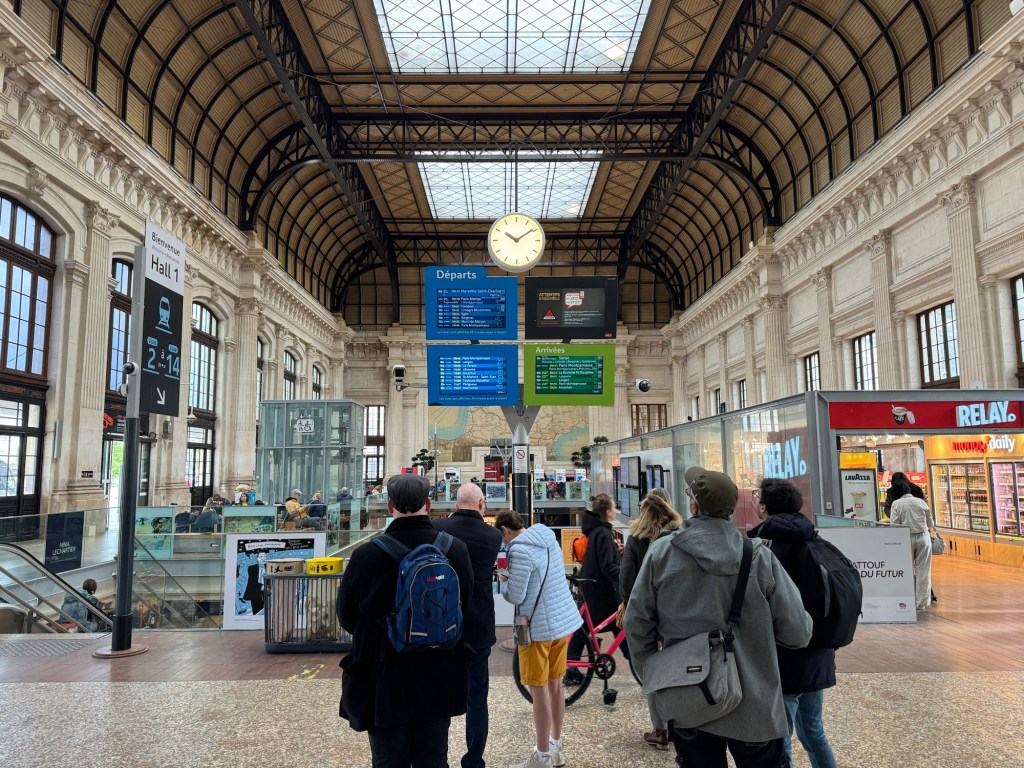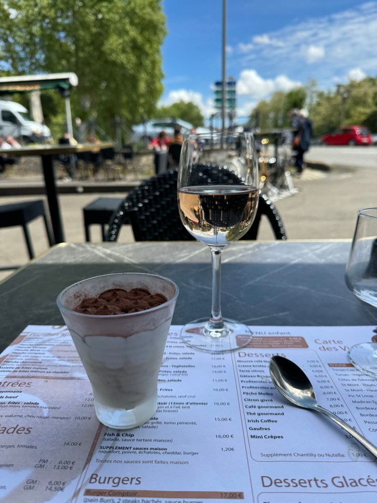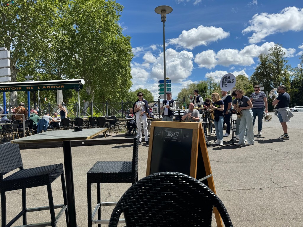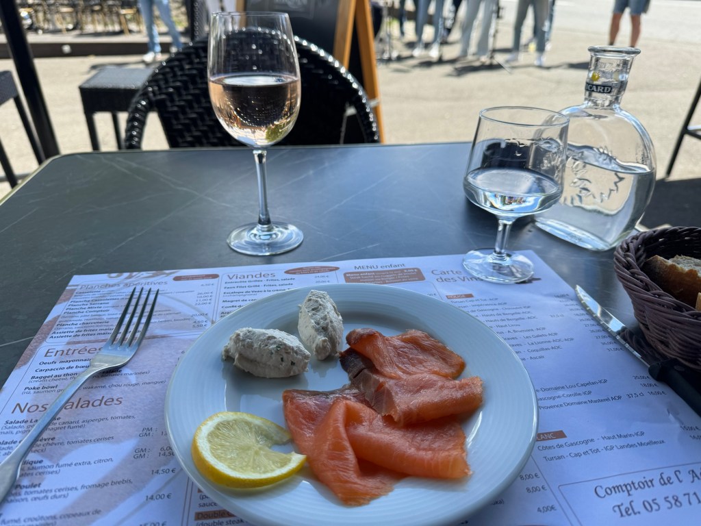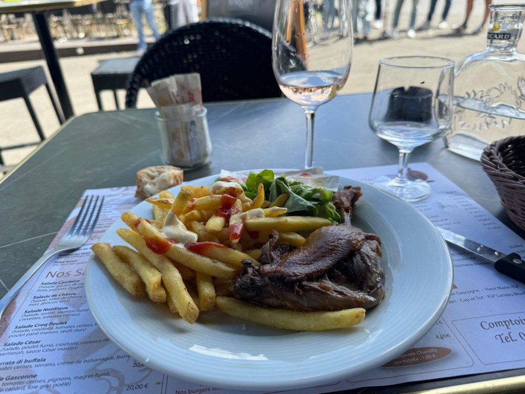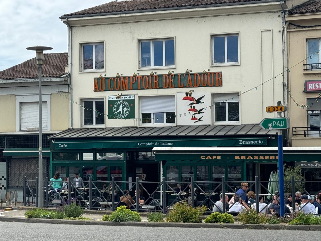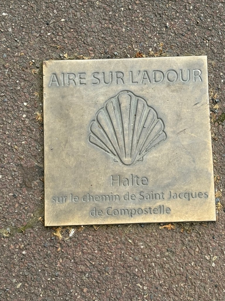 Started today with a little walk around Bordeaux and coffee at L’Alchimiste, an excellent coffee shop in Bordeaux. French Coffee providers still don’t get the concept that if you are a coffee shop you should be open early when people want coffee. This one opened at 9:00am, early by French standards… Then it was check out of hotel, tram to train station, then just under 2 hr train ride to Mont de Marsan, followed by a local bus ride to Aire sur L’Adour where I left off walking the last time. Back in the same hotel as before. Off in search of a late lunch, found a 3 course menu for 16 euros that included smoked salmon, duck confit, frites, salad and desert! It’s some kind of festival going on so a full 13 piece brass band fired up during lunch. Apparently performing tonight for the town! Walking starts tomorrow, unfortunately with rain in the forecast.