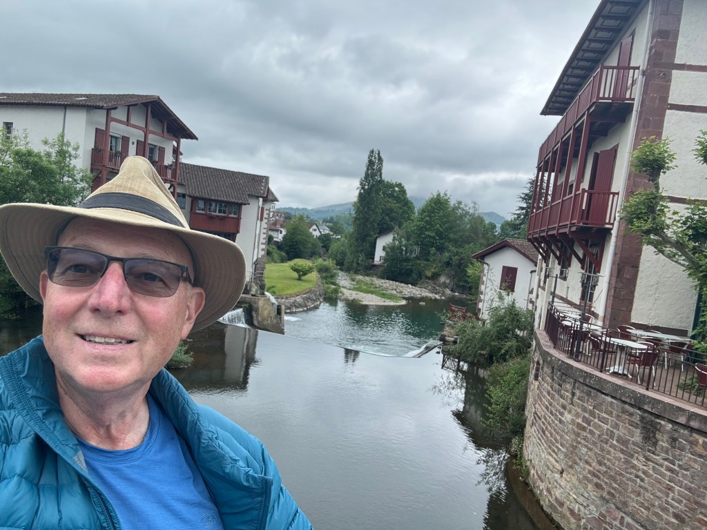 A nice stay in Larcevau last night at hotel Espellet. Younger people taking over from parents and doing a nice job. Excellent dinner with the French group. And a nice clean comfortable room. Got a nice 8:00am start walking with Eric again whose pace suits me and who has enough blisters going on that he wants the distraction of walking with someone. Very pleasant, slightly moist and cloudy walk up a valley and after a few breaks, arriving in Saint Jean Pied de Port. This is the end of this particular Camino for me, but the starting point for people doing the Camino Frances. Checked into my hotel and when the appointed 3:30pm hour arrived was given an amazing corner room on the top floor with a balcony. So, over my four trips doing this, I have complete 750.8km to 466 miles! That’s a pretty good walk especially carrying a 20lb pack! For those interested in more detail on this particular Camino section: https://en.wikipedia.org/wiki/Via_Podiensis