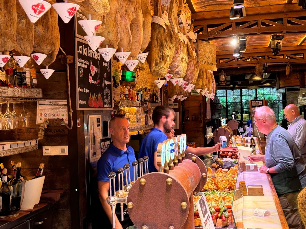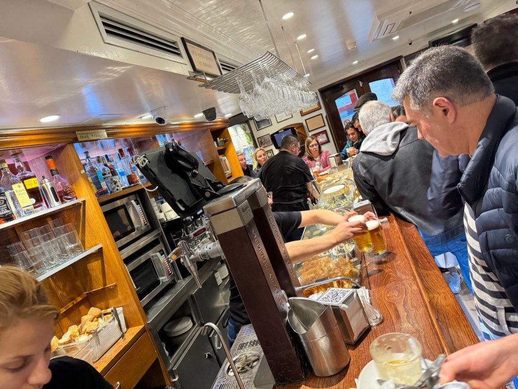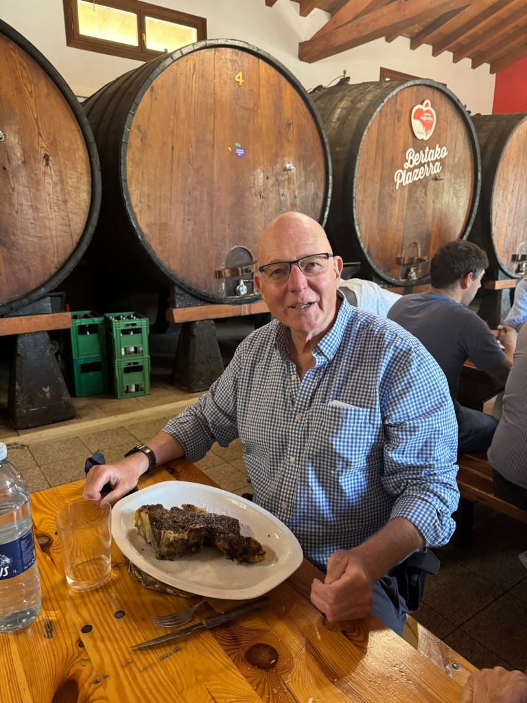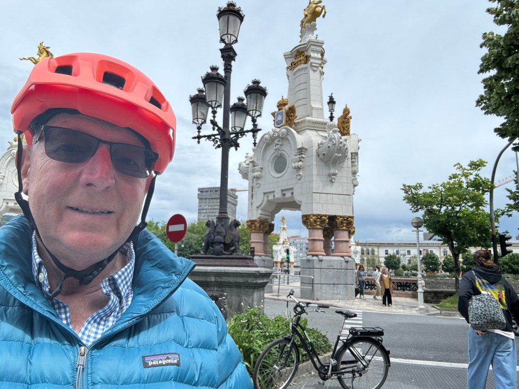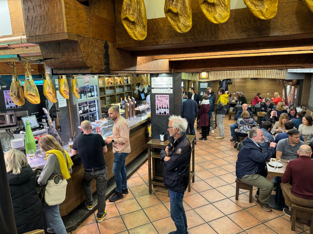 After walking around a bit in the morning, I rented an e-bike with the intention of heading to Astigarraga, the home of the Cider houses. E-bikes are quite a nice thing as they pull some of the weight for you while you still get to bicycle. There are protected bike paths the whole 10km to the town. I ended up at a Cider museum which wasn’t much, but then had lunch at a ciderie. These places are like massive dinning halls. Apparently in the old days, they provided a place to cook and sold the cider, the fishermen brought their fresh catch and cooked it. Now it is clearly an industry with many hundreds showing up for lunch. Basque cider is dispensed from a keg at quite a distance, you hold your cup out and someone turns the tap on. Luckily I headed back and returned the e-bike before massive rain showers hit. A quick but interesting cocktail at the fancy Maria Cristina hotel and then some tapas for dinner.