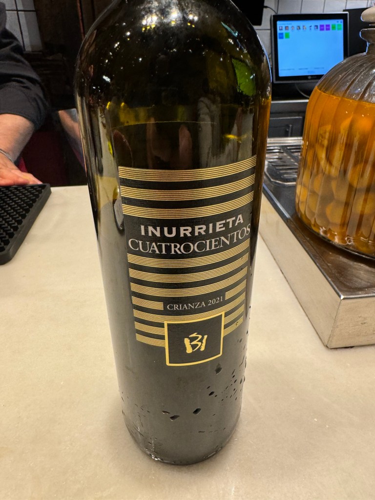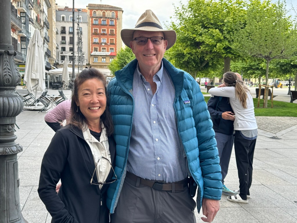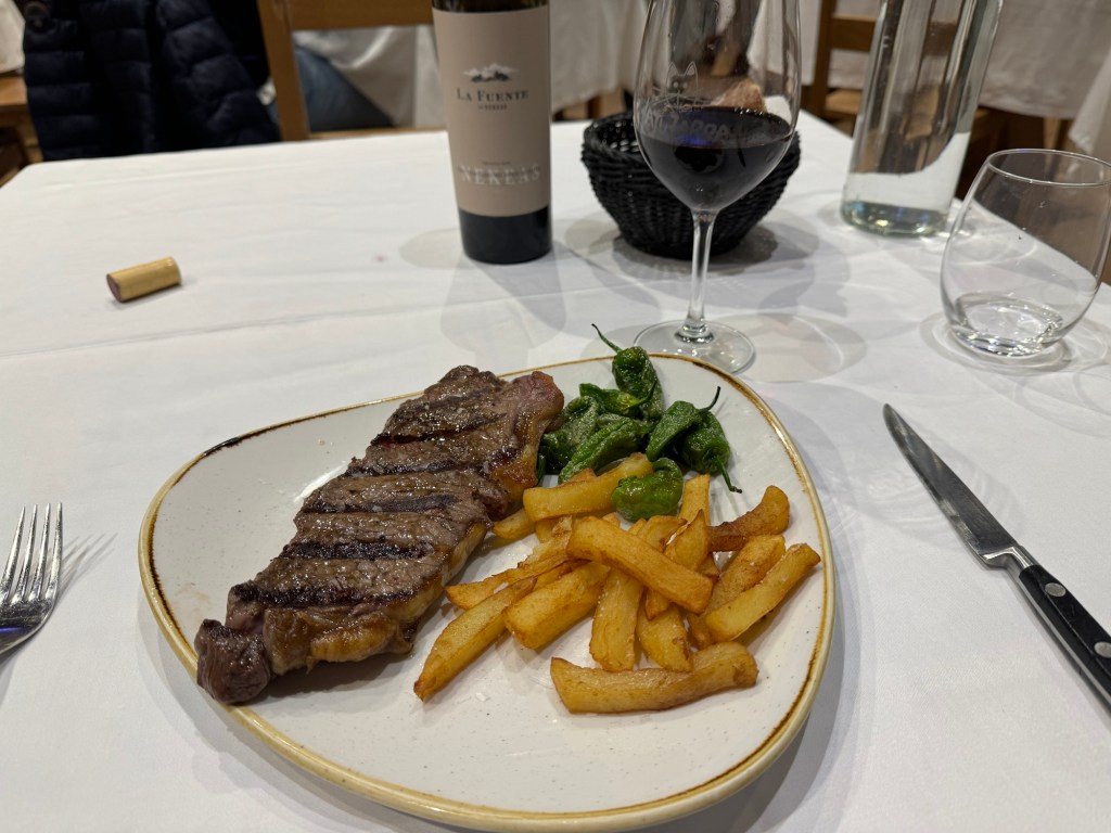 Mushroom risottoWith Eileen Young, Punahou ‘79Poster at the bull ringViews from the rampartsBarriers to keep the bulls on trackThis is where the bulls are staged for the running of the bulls Pamplona map, Casco Antiguo is the old town.Note Camino waymarkersReally nice CrianzaSteak for lunch.Cafe Iruna interior Pinxto street in full swing.Xistora, Basque sausage.