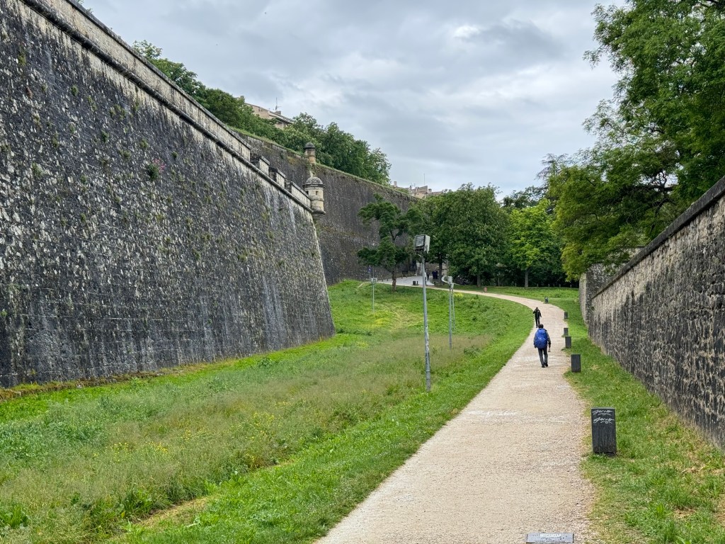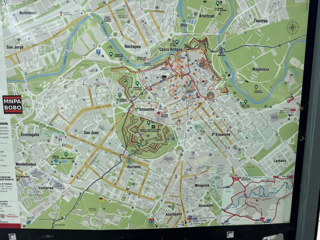 Spent the day walking around Pamplona. Lovely city. It was a walled city and so I was able to walk a good part of it up on the city walls. The modern city has expanded way beyond the original footprint, but most tourist stay in the old town, as I am doing. This is quite nice because it is largely car free. I walked the walls and then retraced the Camino as it goes through the city. Managed a good lunch, although here lunch starts at 1:30pm. Had a small world moment when I noticed a group leaving the hotel this morning and enquired about their itinerary, turns out they were an Australian tour group doing select sections of the camino. Then it turned out that the lady I was talking to was from Hawaii and married to an Aussie, then it further turned out that we were classmates at Punahou! What are the chances! 15,500 steps.