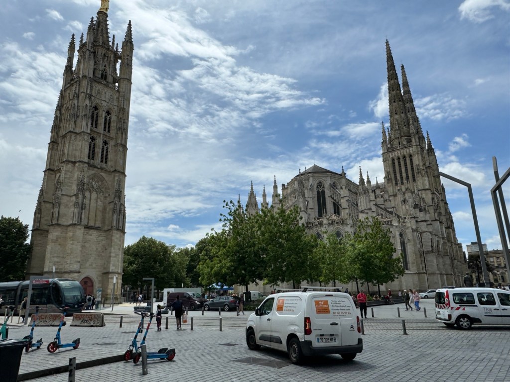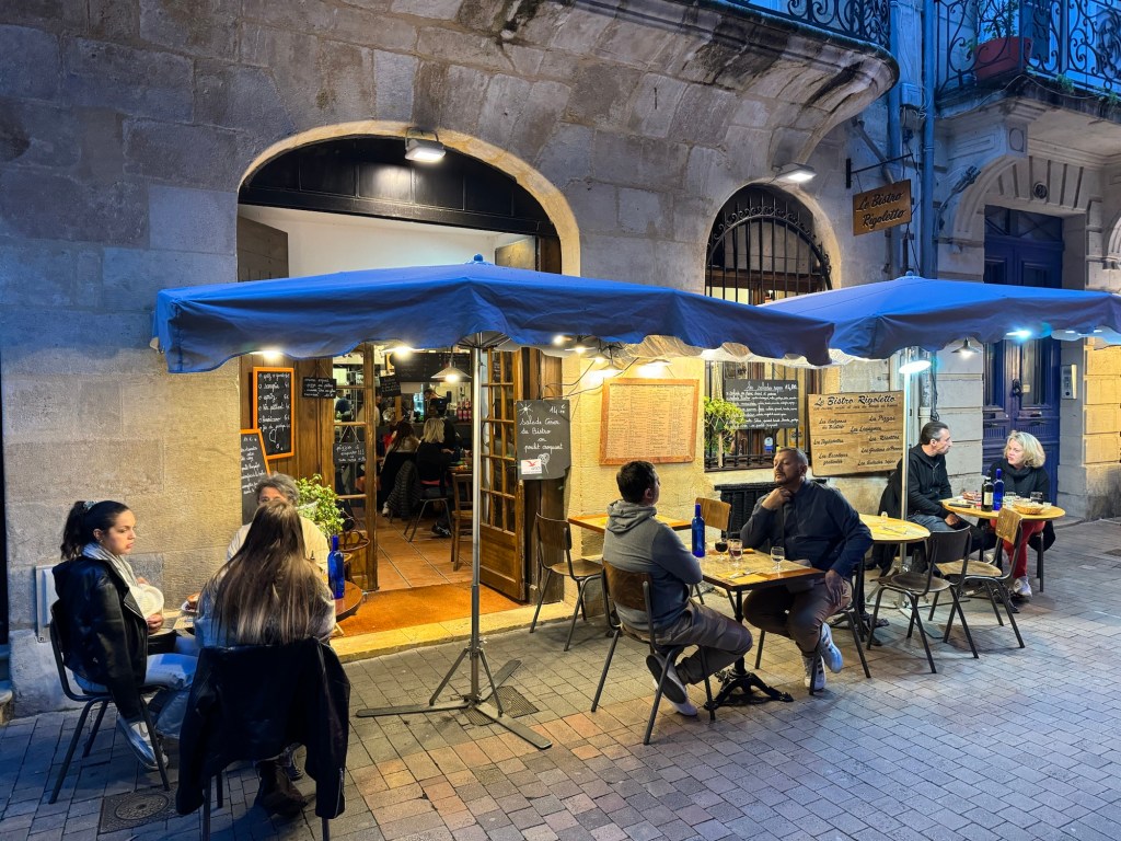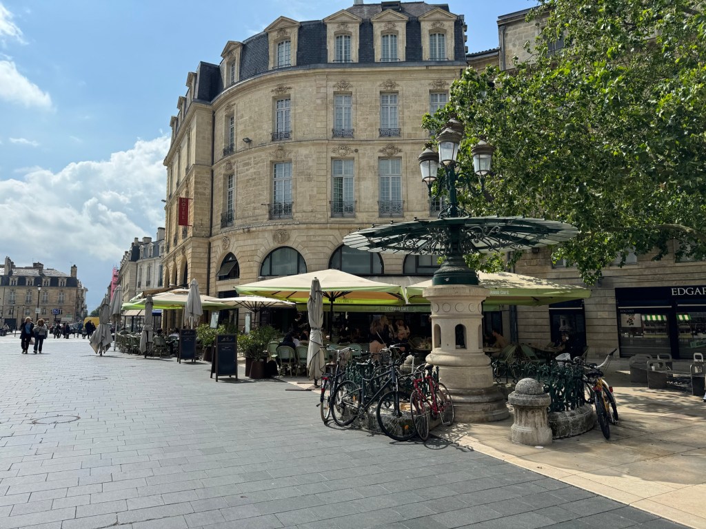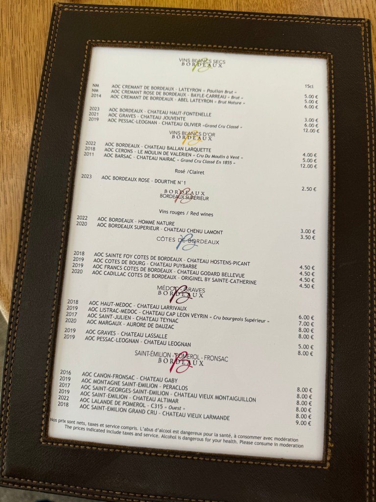 Took the bus out to Pessac this morning for a 10:0am tour of Chateau Pape Clement. This was the usual tour of the premises, which were spectacular, and then I had paid for the fancier tasting, and so myself and 2 others were taken aside for a more detailed tasting of various wines. Nicely done and found my way back to the center fairly easily via bus and tram. Managed to fine a Korean place for Bibimbap for lunch. Then did some walking around and found some of the wine bars I had hunted out yesterday to be open. My favorite being one in the St.Michel neighborhood called Julo, where the owner was happy to pour some tastes of different things. Never did manage to eat dinner as the charcuterie plate had me sufficiently full that nothing more felt needed. Nightcap at the usual Le Regent on the main square where I met 3 guys from Abu Dahbi who keep BMW motorcycles in France and come over and ride a few times per year. Usual off and on rain showers, but today at least it was predominantly not raining!