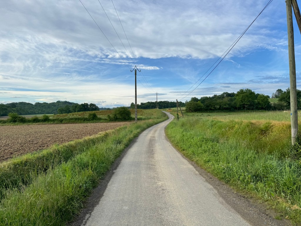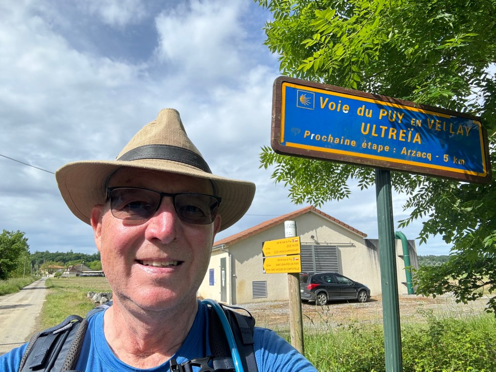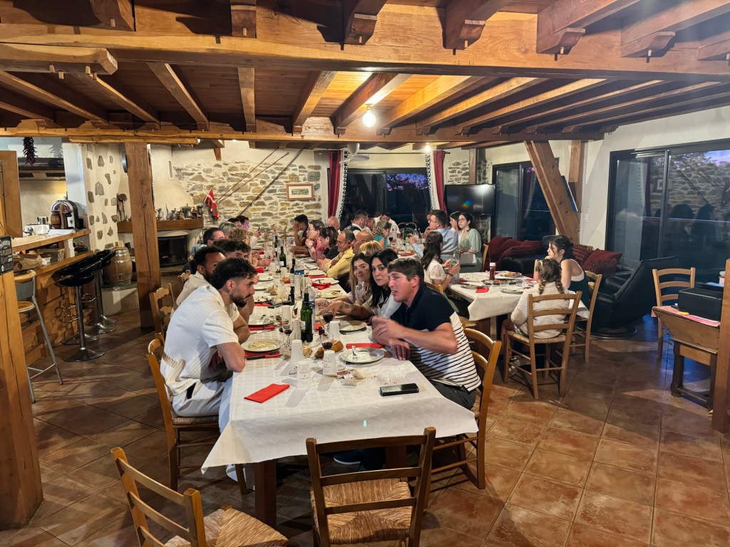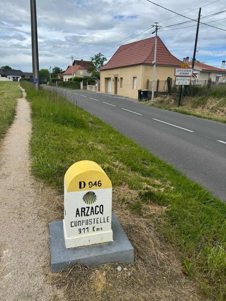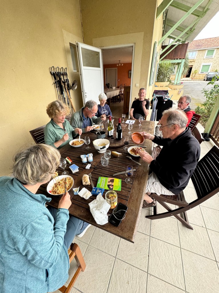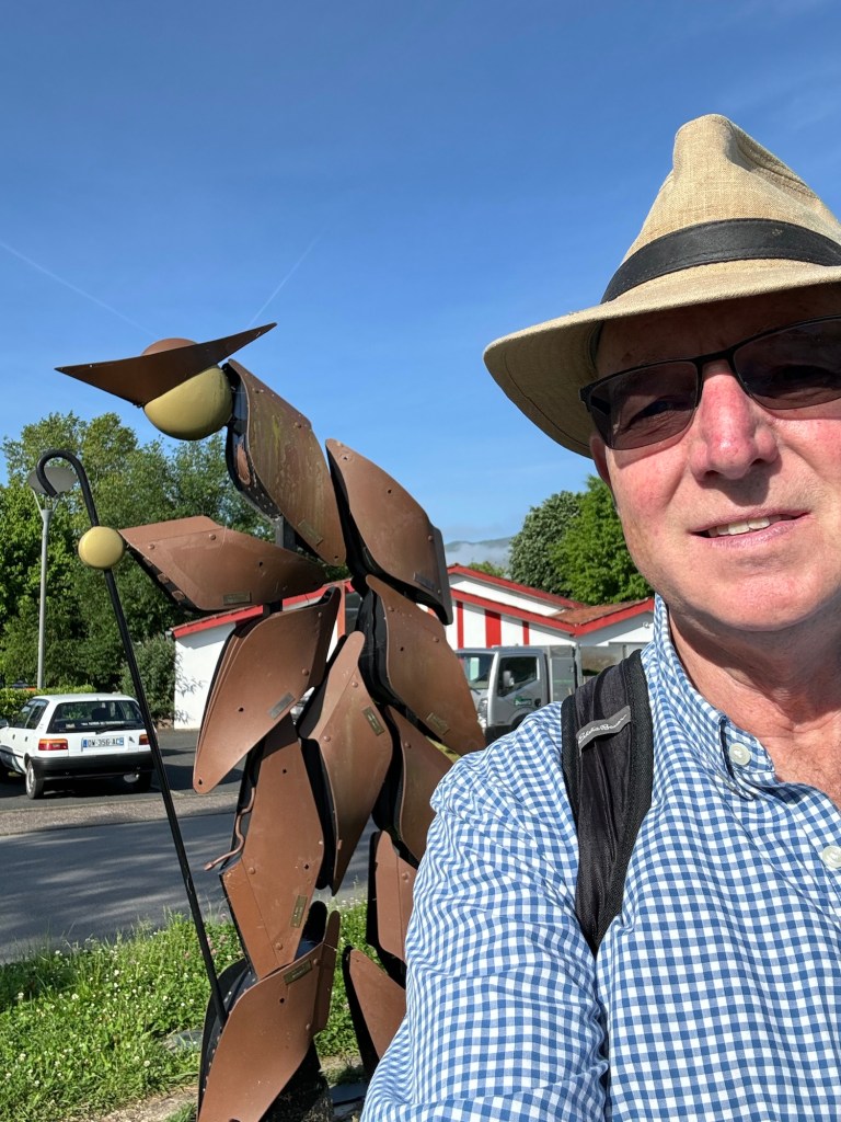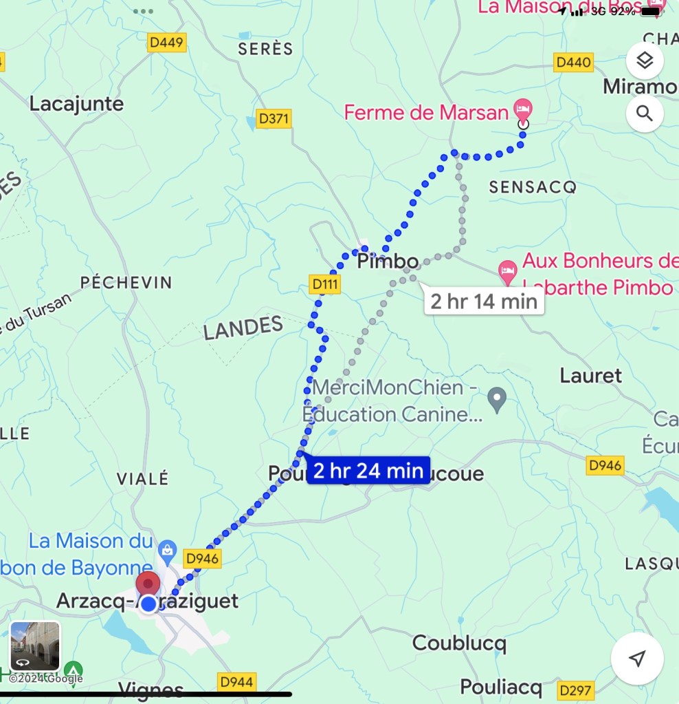 The Gite at Boulangerie Brousse in Arthez did not disappoint. Bertrand put on a great meal for 18 hungry pilgrims including a heart vegetable soup. A fish and lasagna combo over vegetables and an ice cream cake for desert. He is a true character and has the hospitality gene in a big way. My plan had been to have him drop me back in Pomp, but on rising it was raining quite hard, so I decided to split the difference and have him take my only 5km back to Castillon which would still result in a solid day. Luckily the rain abated a bit and an hour and a bit later I was back at the bakery having a second cup of coffee. Then headed out after dire warnings that tomorrow is a national holiday and NOTHING will be open. (Not much of a contrast to my daily experience of rural France, but I keep hoping). Anyway, bought part of a sausage at the butcher, who did happen to be open. Then a lovely walk on a forest road with no cars. Joined a local walking his Border Collie and we walked and chatted for a good half hour or so before he turned back. The promised bakery towards the end of the walk was of course closed. Anyway, arrived tired but reasonably dry at the La Ferme de Bicatou in Maslacq, the local deli being closed from 12:30pm-3:30pm because who would possibly want to buy food at lunchtime? The owners gave me my room a nice little room at the end of the courtyard. Did some clean up and now awaiting the 3:30pm opening of the deli to venture forth and stock up on something for tomorrow. Off and on rain all day today but thankfully mostly not too heavy. You know how Charley Brown always fall for Lucy pulling the football away at the last minute? That’s how I feel about finding a store, cafe, restaurant or anything else open on any day at anytime in Rural France. I keep expecting that something will be open, and I keep getting suckered. Someone actually explained it to me the other day, here’s why it is so bad: In France in the country most of the people own the premises, eg. They are not paying rent. So, it is cheaper for them to close than to hire an employee to remain open. Ergo, they only work when they want to and close the rest of the time. In the USA most businesses are paying rent and any time there are closed represents lost revenue that can never be recovered. 24,000 steps.
