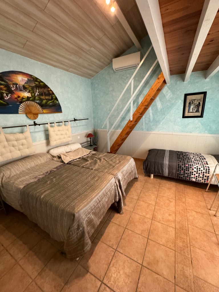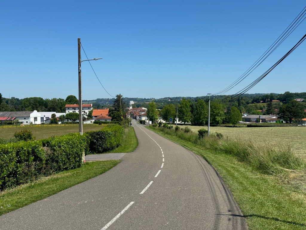 An excellent night in a comfortable room! Was glad I was safely back as a pretty solid storm came through. Nice having a lot of space. Had an amazing breakfast including GF bread and then walking in the light rain. Eventually, about 2 hrs in there was a little place for coffee run by some Argentines. They were very pleasant. Continued walking until about 2:00pm and then arrived in Pomp and made a beeline for the epicerie, which managed some cheese and some ham. My lodging for tonight was booked considerably further, so a phone call produced the owner, Bertrand in a bakery van, who turned out to be a true character. He gave me a quick, and I mean that in the sense of speed, tour of the area before taking me to his sprawling Gite. This place was a bakery and still does some of that but seems to have a dormitory, private rooms, and I was given a little studio apt thing. Not terribly fancy but all amusing and many pilgrims around. A quick walk in to the town of Arthez de Bearn produced pretty much nothing with no bar, cafe or anything open. Many cars jetting around at top speed. Did find a working ATM on the second try. Still, it is looking like it will be an entertaining evening with at least a dozen people here if not more. 31,649 steps.
