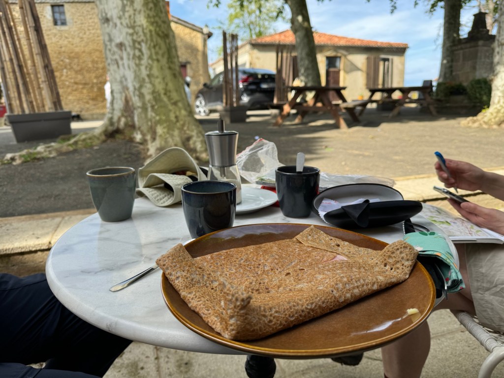 The switch in lodging ended up in a pleasant evening around a big table with other pilgrims. Interestingly one couple were from St. Jean de Maurienne, where I did classe de Neige two years during my time in French school. The place had numerous rooms and was a working farm. The meal plan was interesting, Madame opened her boutique and we picked out cans of different things and some wine and then all sat and shared things. I had a small can of Duck Rilletes followed by a can of foie Gras and then a jar of pumpkin soup. Worked quite well. Because I walked further than planned yesterday, today was a short one, which was just fine with me. About an hour in there was a town called Pimbo that had a little creperie that even had a GF galette, needless to say it was nice to have something to eat other than the energy bar I had for breakfast. After walking to town, the hotel was able to give me. Room right away, a rare thing. This place is a big Maison de maitre, and my room is palatial! Really nice! Washed my boots of mud, changed shirts and headed to lunch at the one restaurant that was open. Just had a salad, but not having had anything green it a while it hit the spot. 17,600 steps.