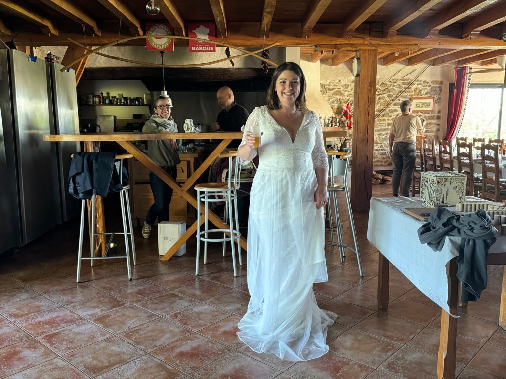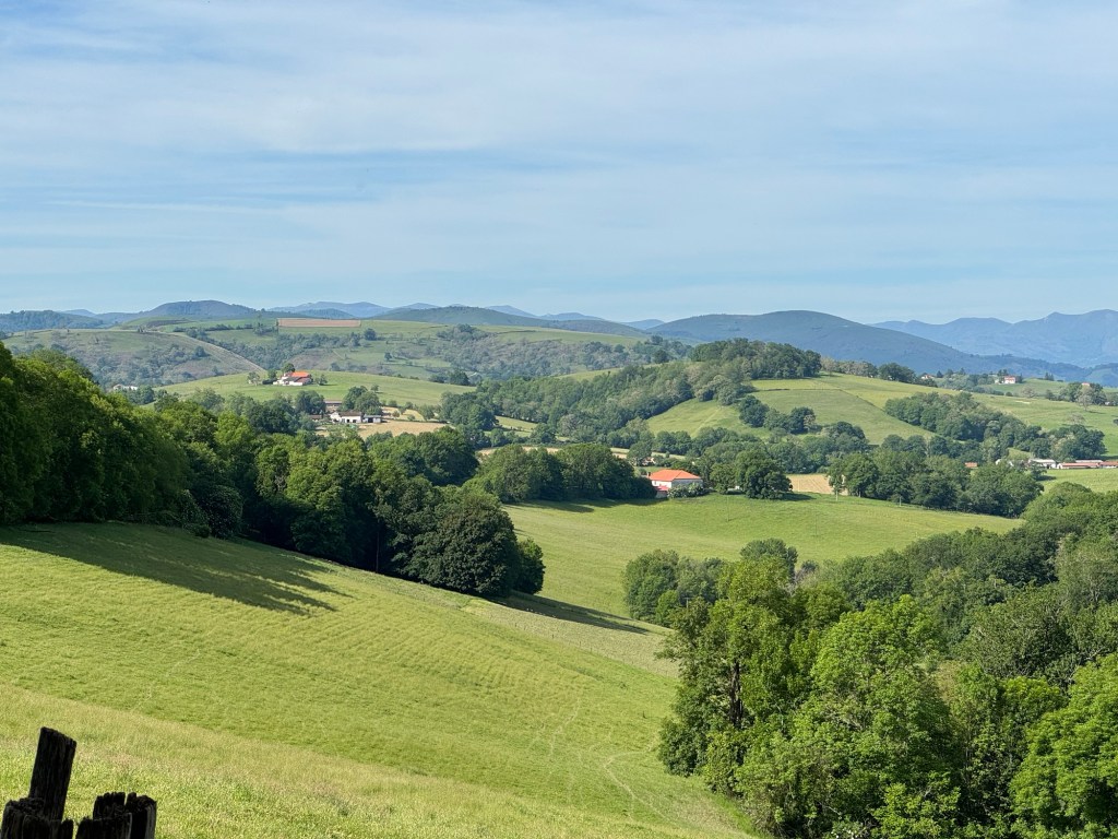 Well, the wedding at the gite last night was quite entertaining, and noise level they were able to maintain for hours was nothing short of amazing. Fortunately I was tired enough that I slept anyway. Since the official photographer left right after the ceremony, I took a number of candids and set them up for the bride in a shared album. Today’s walk is a bit of an estimate, the Gite was far enough off the trail that they dropped me at a place near with a short cut of a few Kms down to the trail. From there it was the usual rolling through some miles in beautiful rolling Basque Country. My hotel tonight is also in a town that is 5.1km off of the trail, at 4km/hr walking pace that is a bit of a ways. Today got quite hot, 83degrees, and wow, I don’t understand the people who decide to walk across Spain in July and August, that just seems like insanity to me. Much to my relief, Saint Palais is a “real” town, meaning a nice central plaza with multiple restaurants that will even serve you at 1:30pm. I stupidly put all my chargers accidentally in my transported luggage, but luckily had a battery pack and cord just in case. Suitcase didn’t get picked up till around 4:00pm, so, glad I had the essentials with me. Daniel, who I have run into several times, and is a physician from Croatia, is staying in the same hotel so we will have dinner together. He is moving to London and is an infectious disease specialist. While all of this is going on I am busy booking my unscheduled section between May 13-23. So far, St. Jean de Luz and Pamplona followed by San Sebastián are either planned or confirmed.