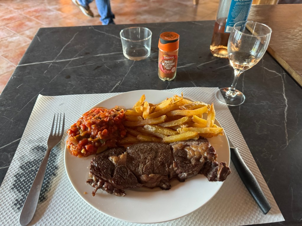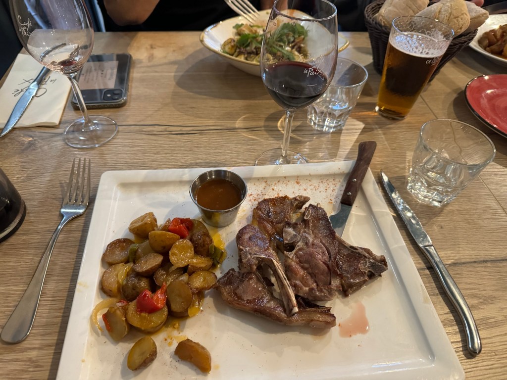 Lamb chops for dinner, Cafe de La PaixThe French groupSt Jean Pied de PortTrain Station SJPPMain drag Saint Jean de LuzBeach at Saint Jean de LuzMenu, I had the first one.You wouldn’t see this in the USASaint Jean Pied de Port to Saint Jean de Luz. (transit)