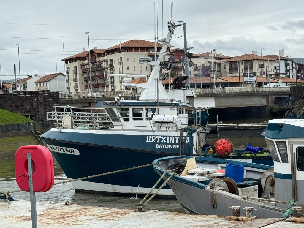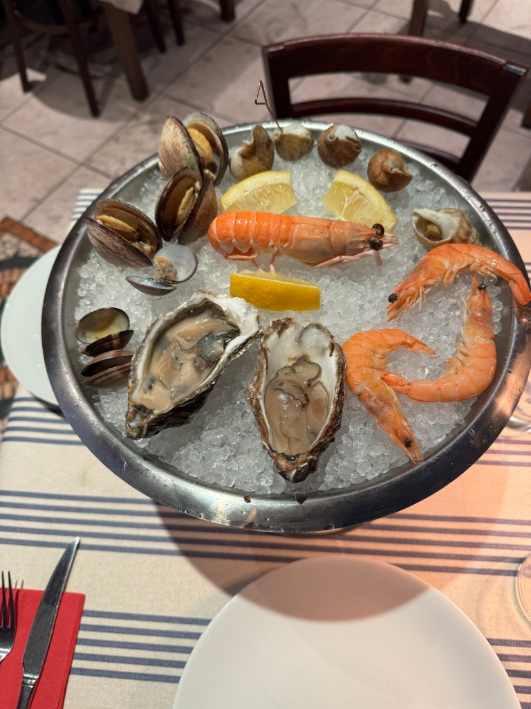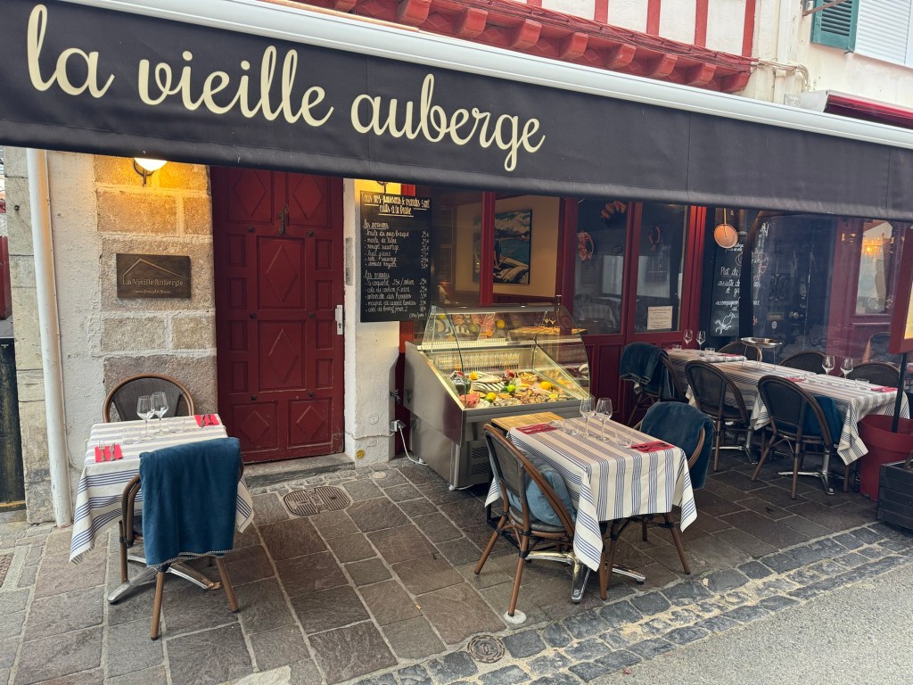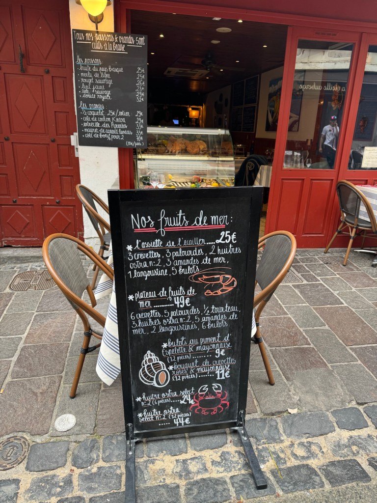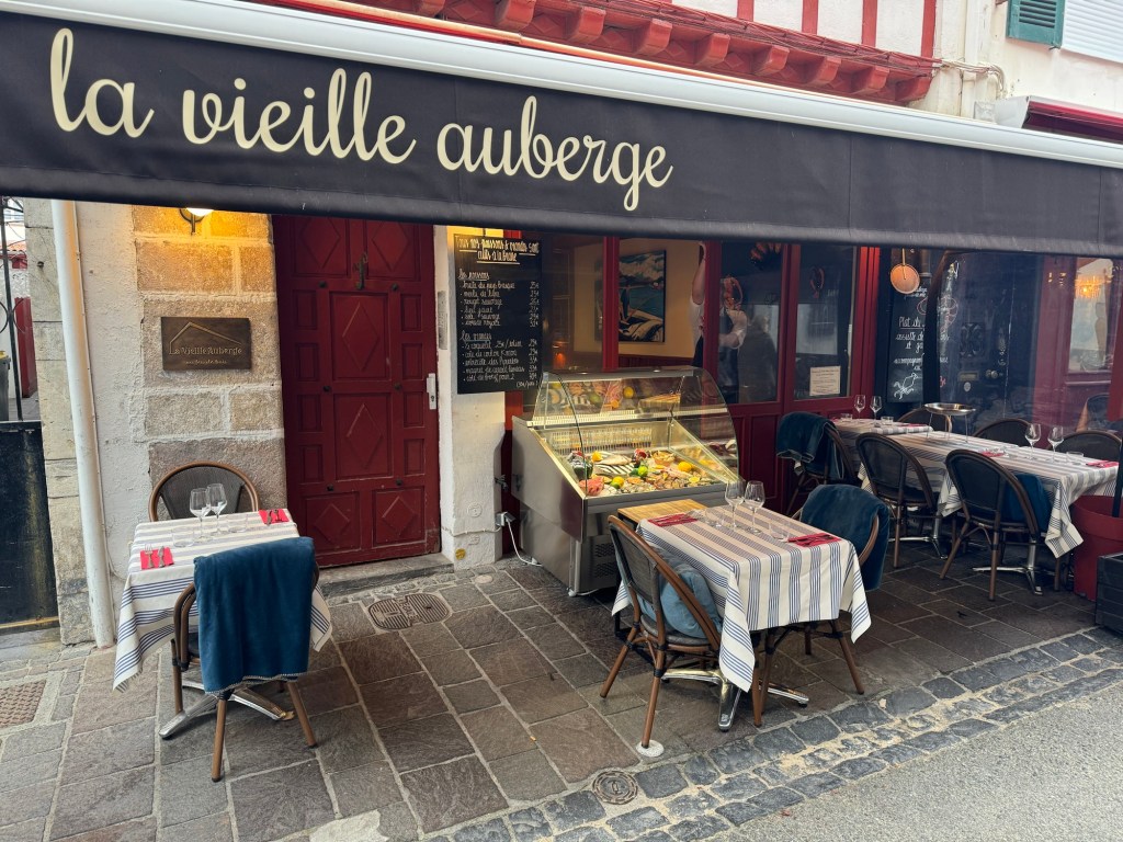 After a pleasant dinner last night with the group of 6 French people I’ve been walking with, it was time to call it an early night. Was woken up by an early text that told me my train from SJPP to Bayonne was canceled. After heading to the station a very helpful station master offered to call a taxi at SNCF expense. Went back got my stuff, and of course, that didn’t happen. So they did substitute a bus. But, the bus took about 20 minutes longer thereby missing my connection. Fortunately, another, local train was running an hour later, so ended up just buying a new ticket for that, about 4euros so not breaking the bank. Got to my AirBnB in Saint Jean de Luz and got installed. This is a small studio with a Murphy bed, but it does have a washer, something I definitely will be using! Did a little stroll around town and got some breakfast supplies, ran a load of wash. Found a good seafood place for dinner and had the variety shellfish tower for 25 euros. Bit of rain coming through so glad I wasn’t out walking today. The French group had a hard day as they were going over the Pyrenees to Roncesvalles, which is a long day if you do it in one go.