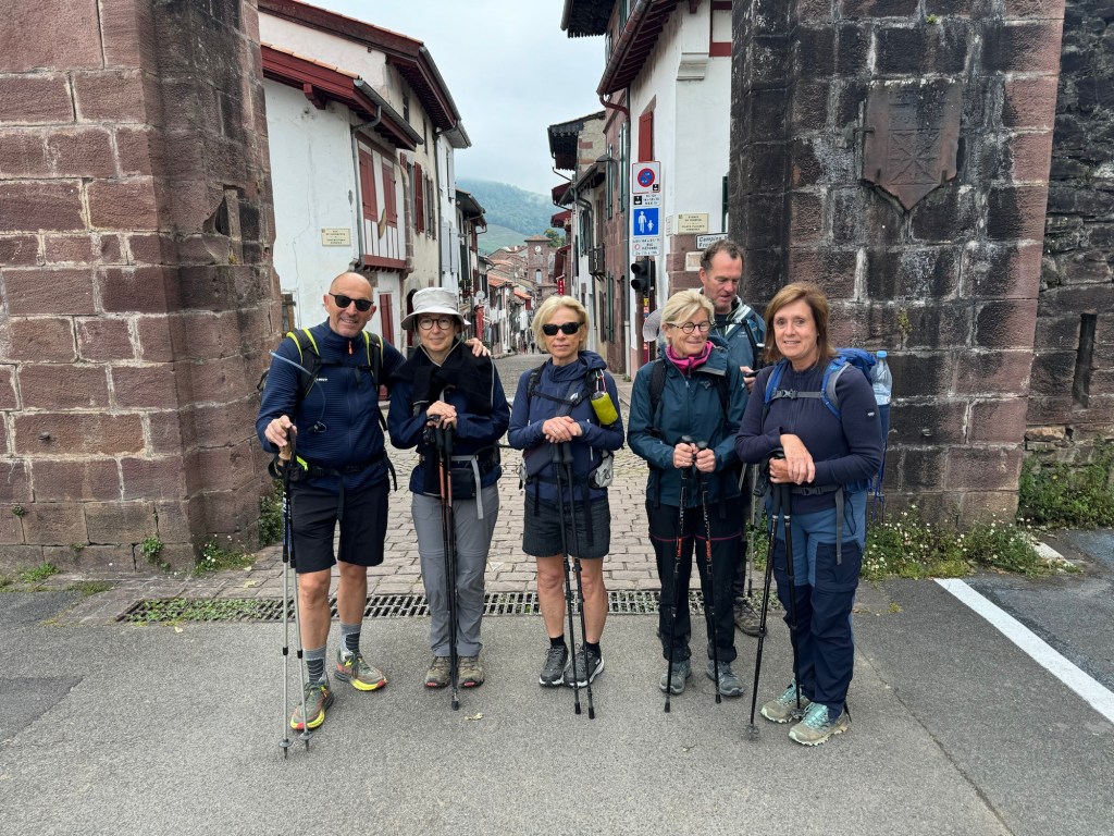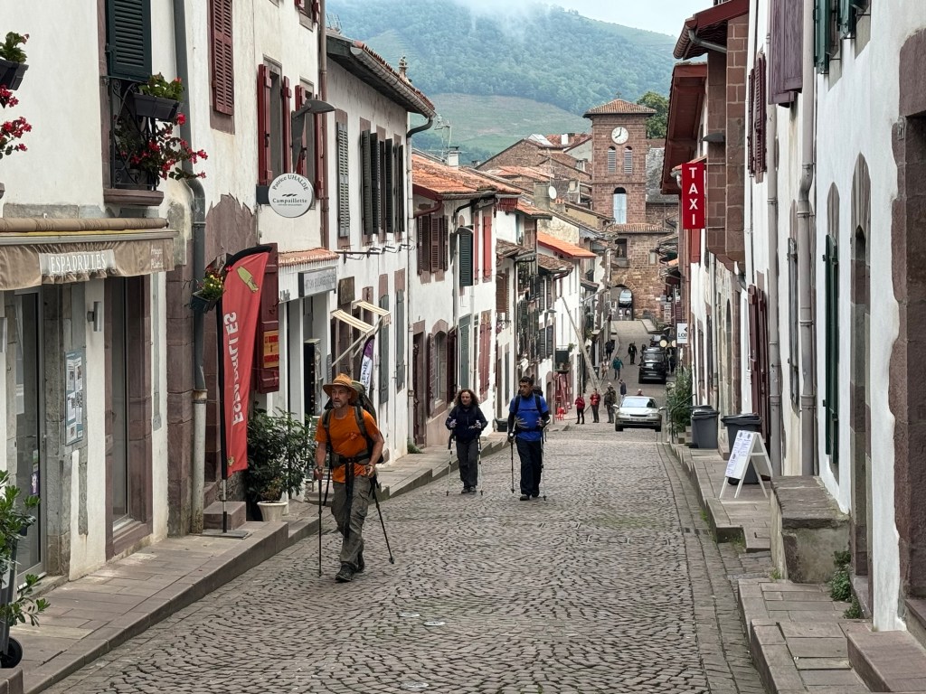A nice stay in Larcevau last night at hotel Espellet. Younger people taking over from parents and doing a nice job. Excellent dinner with the French group. And a nice clean comfortable room. Got a nice 8:00am start walking with Eric again whose pace suits me and who has enough blisters going on that he wants the distraction of walking with someone. Very pleasant, slightly moist and cloudy walk up a valley and after a few breaks, arriving in Saint Jean Pied de Port. This is the end of this particular Camino for me, but the starting point for people doing the Camino Frances. Checked into my hotel and when the appointed 3:30pm hour arrived was given an amazing corner room on the top floor with a balcony. So, over my four trips doing this, I have complete 750.8km to 466 miles! That’s a pretty good walk especially carrying a 20lb pack! For those interested in more detail on this particular Camino section: https://en.wikipedia.org/wiki/Via_Podiensis