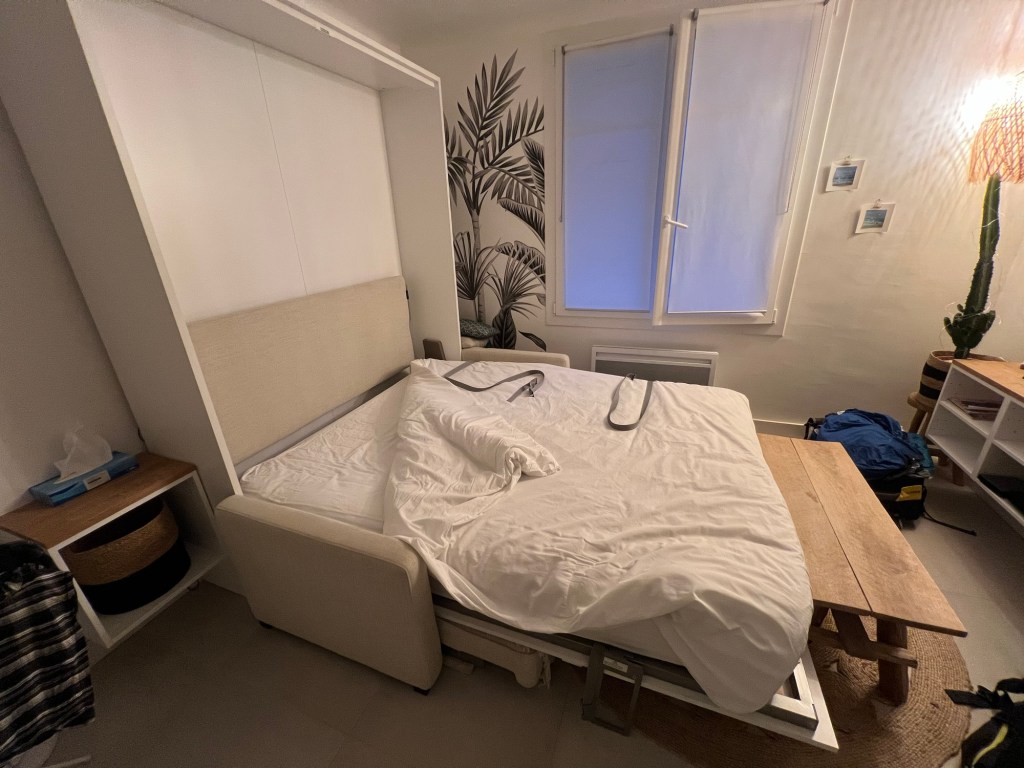 Murphy bed upMurphy bed downThe market, covered and outsideGoat cheesesBasque fishing vesselOysters from NormandySaint Jean de Luz