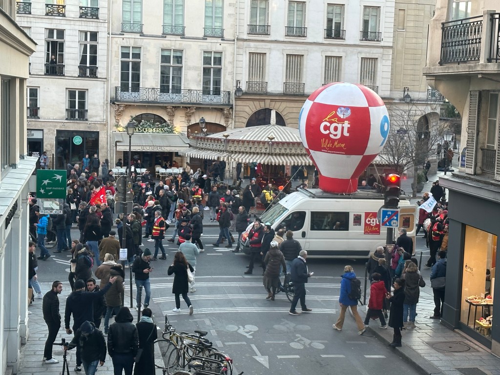 I had planned to do a field trip out to Provins today, but with a national strike on, almost no transit was functioning. Luckily the 1 line nearest to me is automated and works normally even during strikes. Off to get an estimate on a replacement couch for the apartment. After that a stroll up to the 3rd for some risotto at Cafe Charlot. Then a pleasant hour or so at the Musee des Arts et Metier, sort of an industrial science type museum. After returning home, I could see the strikers marching by in front of the apartment. Apparently estimated at 400,000 people!